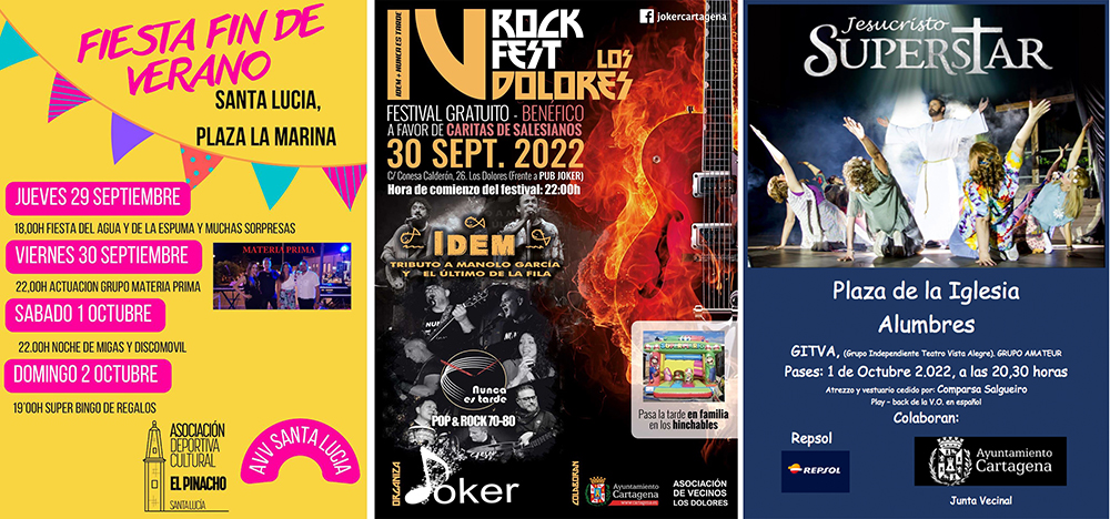 Los Dolores acoge esta noche la cuarta edición del festival de rock y en ‘La Urba’ se entregan las ‘Carabelas de plata’. Santa Lucía ofrece estos días música en directo, migas y súperbingo con la fiesta de fin de verano. Por su parte, Alumbres tiene doble cita de teatro. También está el partido de fútbol homenaje a Teru en Barriada Hispanoamérica.