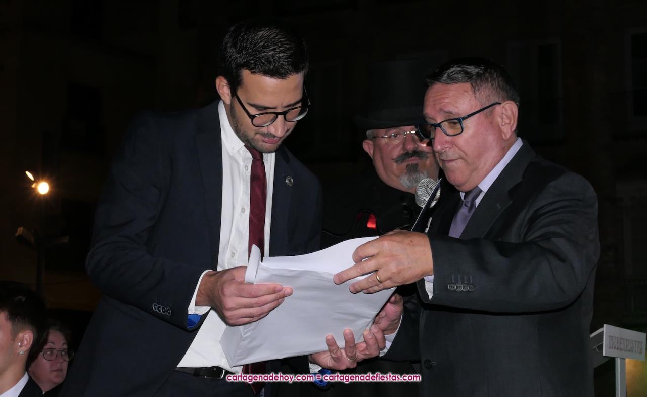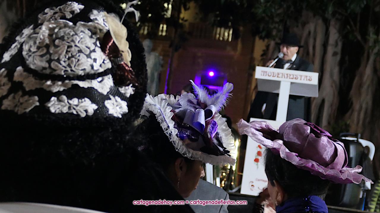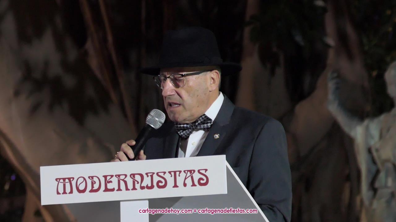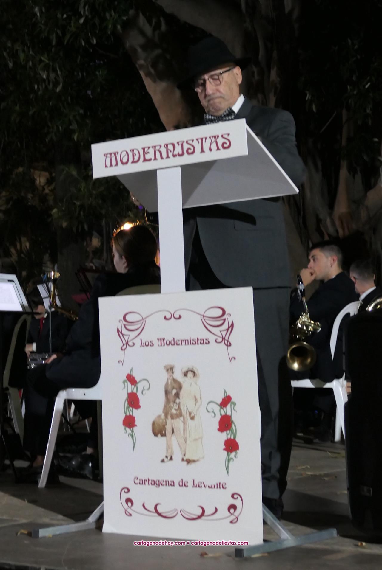 Tomás Martínez Pagán, ‘Proclamador de 2021’, presentó a su sucesor, Pedro Negroles’, quien resaltó en su oratoria (ágil y concisa) que el modernismo fue un movimiento cautivado por la cultura, la música y la belleza, que resultó un punto de inflexión en la evolución de Cartagena y que en esta ciudad hay Semana Santa en primavera, Carthagineses y Romanos a principios de otoño, carnaval en invierno “y modernismo todo el año”, en referencia los numerosos edificios de entonces que existen en el casco antiguo, como los que anoche estaban en un lateral de la plaza.