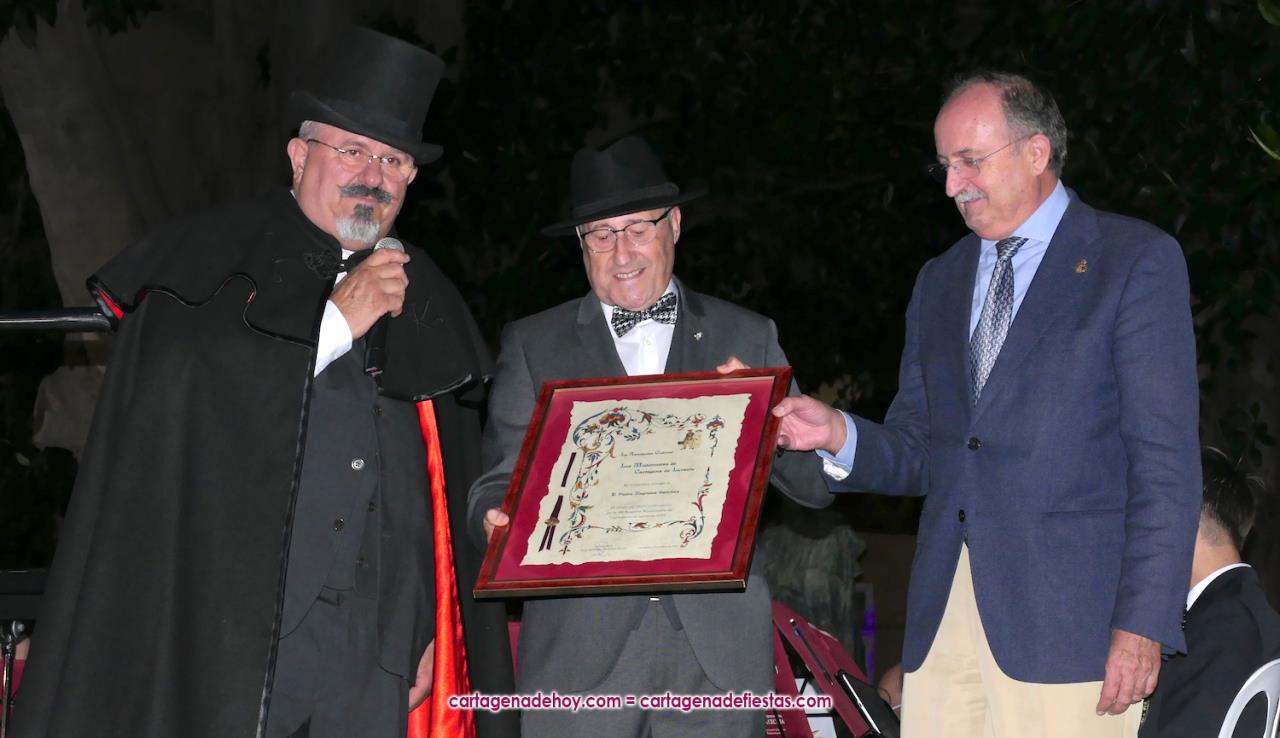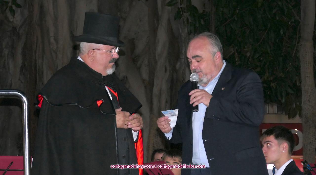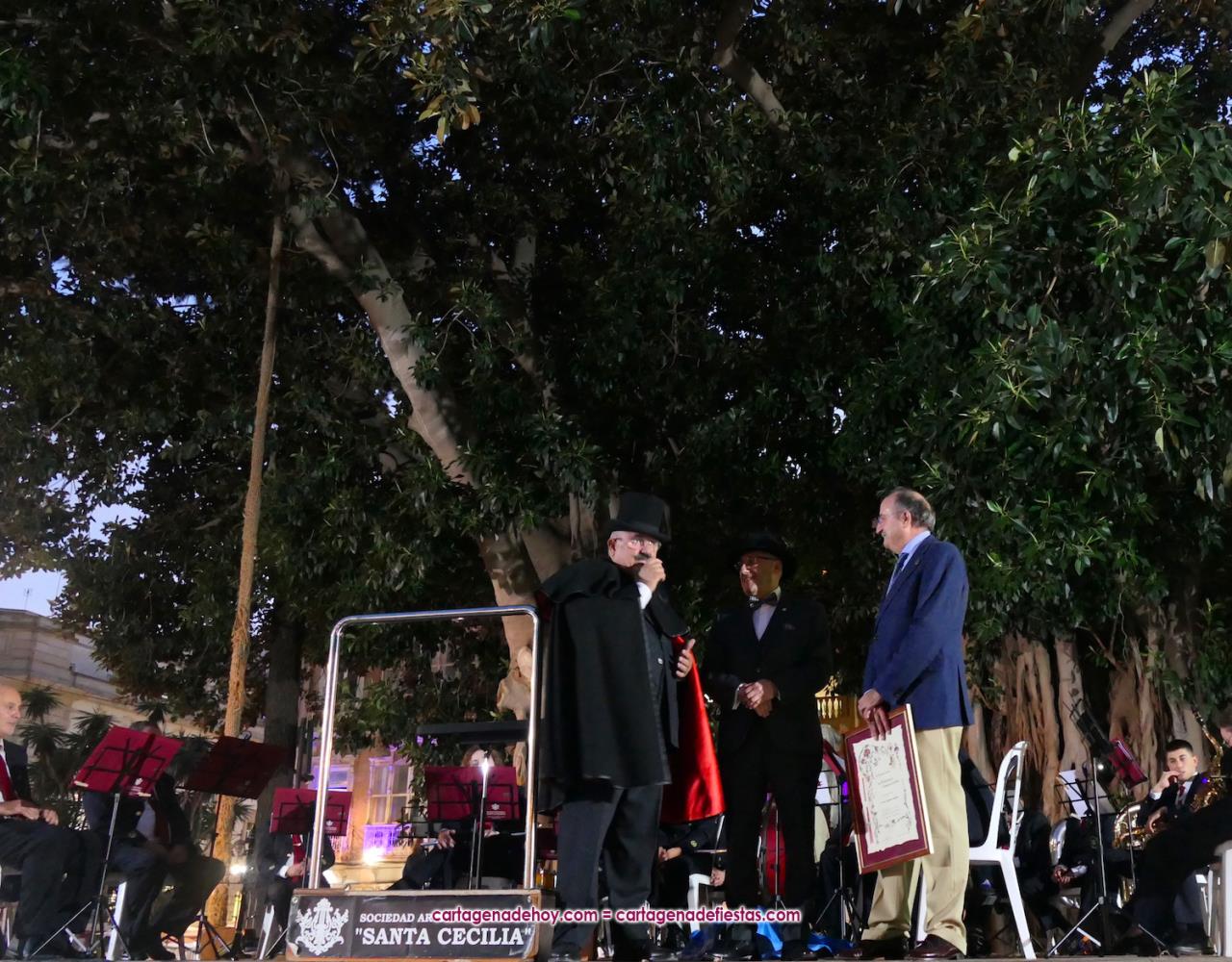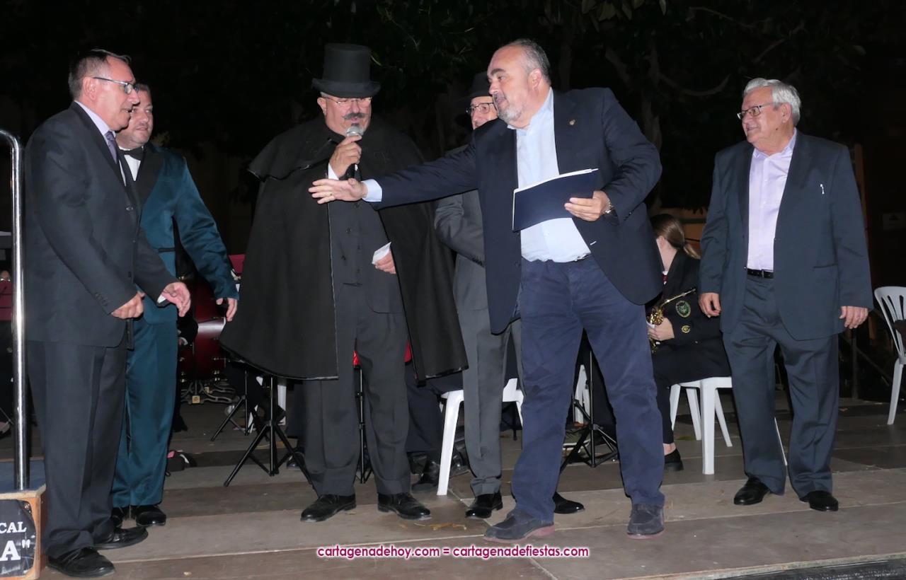 Tras terminar la pieza la Sociedad Artístico Musical ‘Santa Cecilia’ de Pozo Estrecho y el tenor Jesús Hernández, tomó la palabra José Antonio Martínez ‘El Kachimanero’, presidente de los modernistas cartageneros, quien, tras apuntar que Cartagena “tiene un gran patrimonio con el modernismo que poco se valora”, expuso algunas líneas a destacar de lo que han preparado para esta muestra, especialmente, el café-cantante ‘La modernista’. También llevó a cabo la entrega del carné de ‘socio de honor’ (la primera vez que lo recibe un político) al concejal de Festejos, Juan Pedro Torralba, por su apoyo a las siete muestras celebradas. “Gracias al concejal y un abrazo al amigo”, expresó el presidnte.