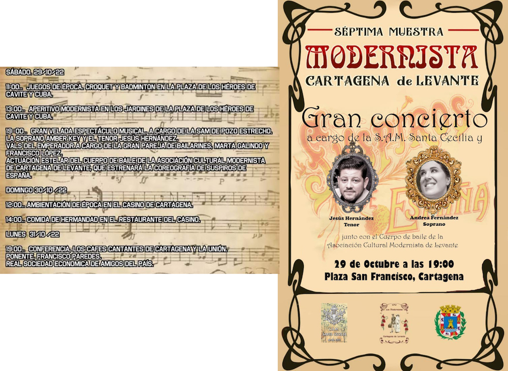 Hay mucha ilusión en la Asociación Cultural ‘Modernistas de Cartagena de Levante’ por esta séptima edición, que es la que lleva detrás un mayor trabajo y apuestas de las hasta ahora celebradas. El punto de partido estuvo ayer en la glorieta de San Francisco, en el escenario que ‘contempla’ la estatua del legendario actor Isidoro Máiquez. Ahí, ayer tarde, comenzó a sonar ‘Suspiros de España’ compuesta por Antonio Álvarez Alonso (Martos-Jaén 1867/Cartagena 1903), como lo hará en casi todas las jornadas en homenaje a que se cumplen 120 años de que fue compuesta en una cafetería cartagenera de nombre ‘España’, ubicada frente a una confitería de la que eran populares sus dulces ‘Suspiros’.