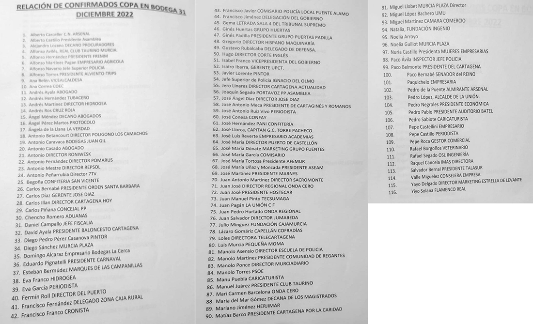 El capítulo de alocuciones ha sido amplio, pues siete han sido los que se han dirigido a los asistentes antes de cada brindis. Que se acercan las elecciones ha quedado reflejado, pero también buenos deseos y elementos reivindicativos, al margen de los expuesto antes con el ‘Tonina’. Alberto Castillo, presidente de la Asamblea Regional, ha deseado el ascenso del FC Cartagena a primera división, que no le quiten a la Región ni una gota de agua y que el AVE llegue a Cartagena. El subdelegado del gobierno, Francisco Jimeno, le ha dicho tras escuchar esta petición: “Estamos en ello”. Alfonso Hernández, presidente de los empresarios del metal en la Región, por su parte ha pedido celeridad para crear la escuela de formación de trabajadores del sector en Cartagena.