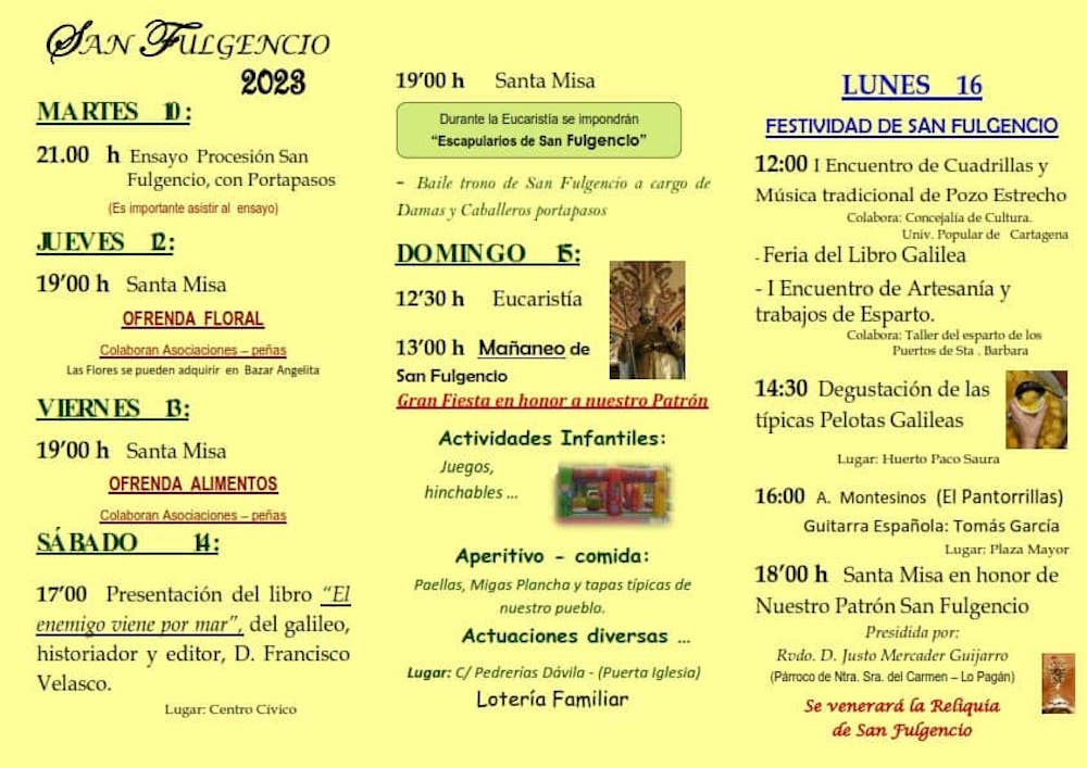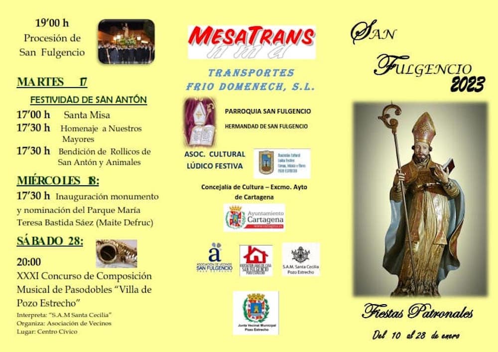 El Huerto de Paco Saura acogerá la multitudinaria degustación de estos sabrosos rellenos, acto que no se celebra desde 2020 y que tuvo su origen en 1969. Las fiestas en honor al patrón de Pozo Estrecho han comenzado con actos litúrgicos y se prolongarán hasta el día 28, incluyendo, entre otras actividades, la inauguración de un monumento de Maite Defruc, sendos primeros encuentros de cuadrillas y de trabajos de esparto, el primer la bendición de animales y el XXXI concurso de pasodobles.