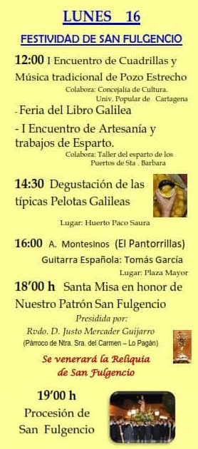 La actividad por la festividad de San Fulgencio, patrón del pueblo galileo, ocmienza a las 12 horas con el primer encuentro de cuadrillas y música tradicional en el Huerto de Paco Saura, que también acoge la feria del libro y a los artesanos, como muestra de trabajos de esparto, culminando con la multitudinaria degustación de pelotas. Por la tarde, en otros escenarios, concierto de guitarra, misa y procesión.