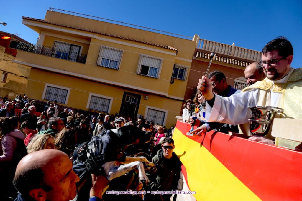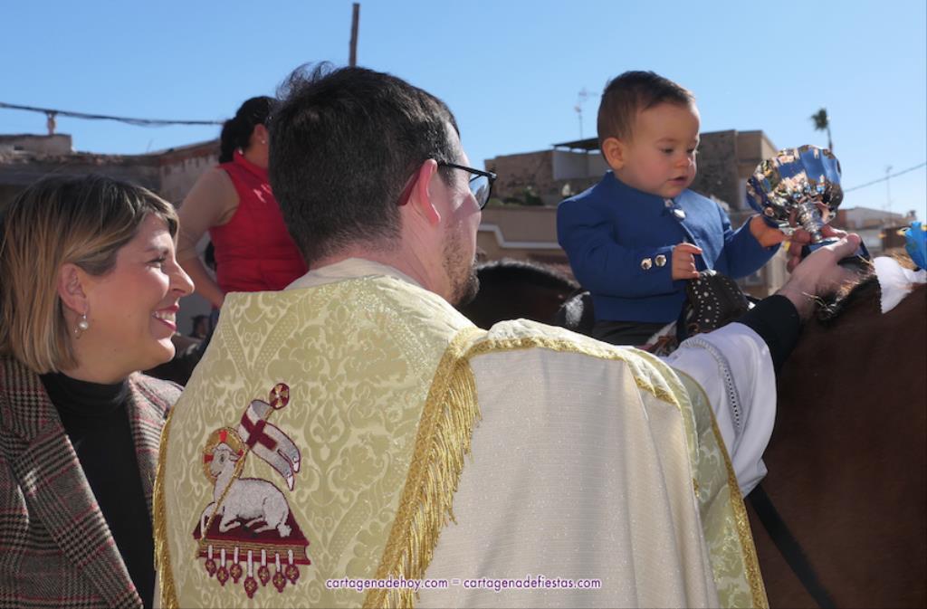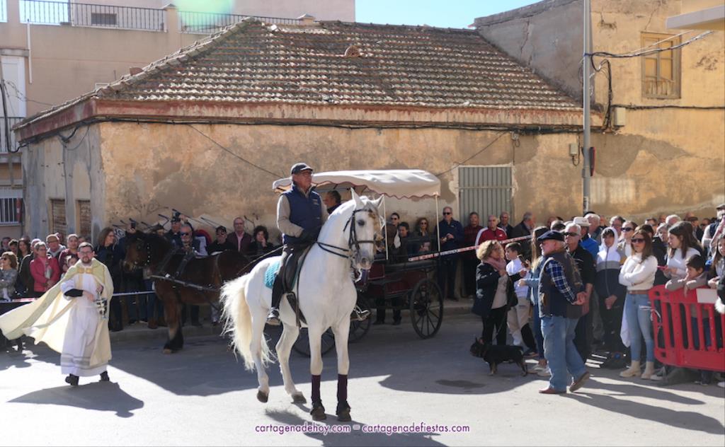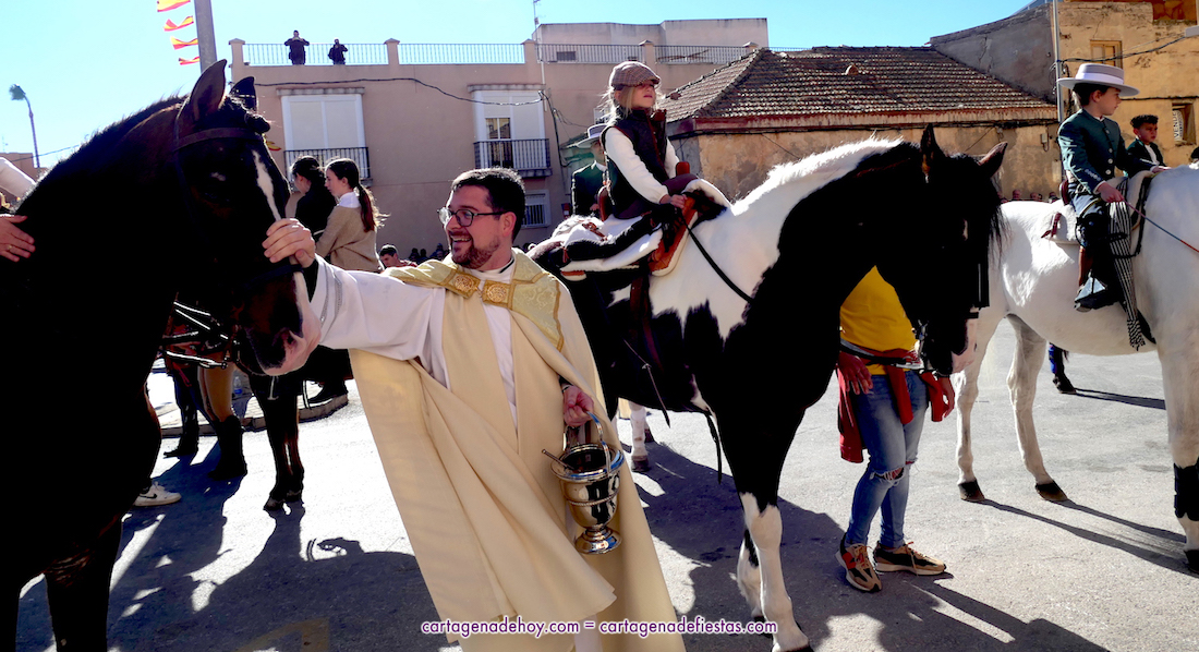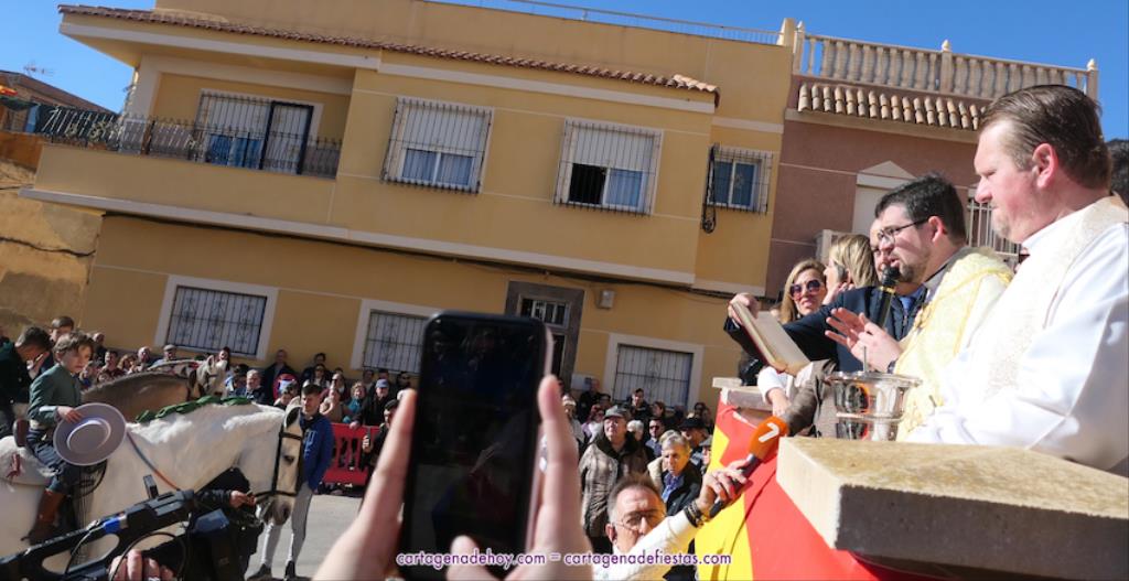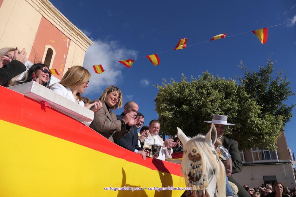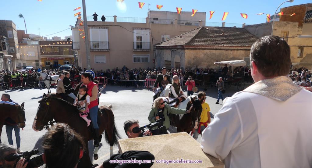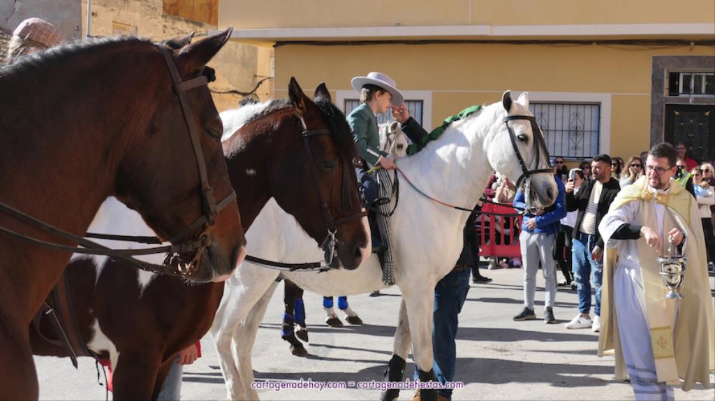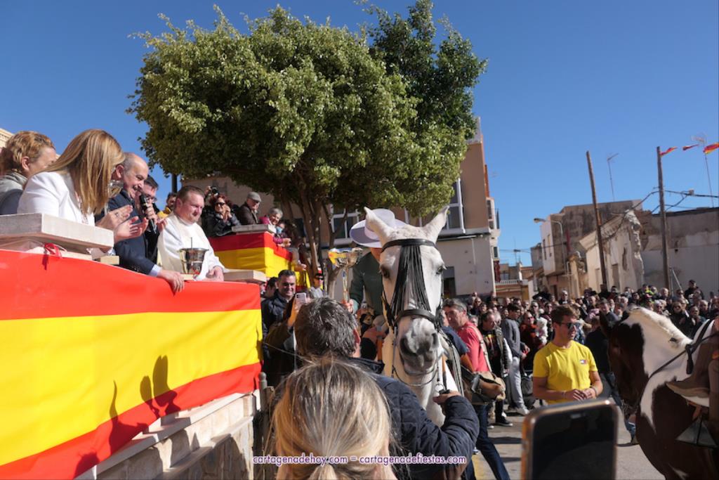 Después, se ha llevado a cabo la bendición de animales a cargo del párroco, Saúl Sánchez Fernández, quien en 2022 fue la primera vez que se 'lanzó al ruedo' de la plaza y ha repetido en este, ahora con más equinos. "Lo hice entonces por seguridad y para evitar problemas con los caballos cuando tenían que subir la acera y gustó, por lo que he repetido, pues además queda bien estéticamente", ha expuesto a Cartagena de Hoy (Cartagena de Fiestas). Además, esa iniciativa ha permitido la agilidad del desarrollo del acto, que ha atraído a numerosos espectadores y una amplia presencia del panorama político local, encabezado por la alcaldesa (Noelia Arroyo) y vicealcaldesa (Ana Belén Castejón).