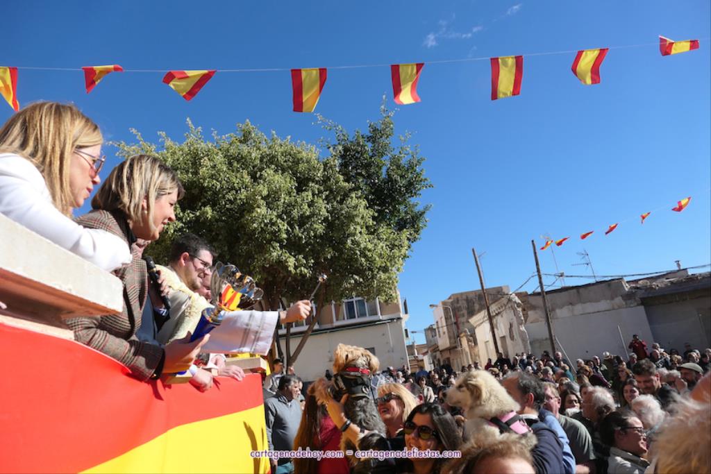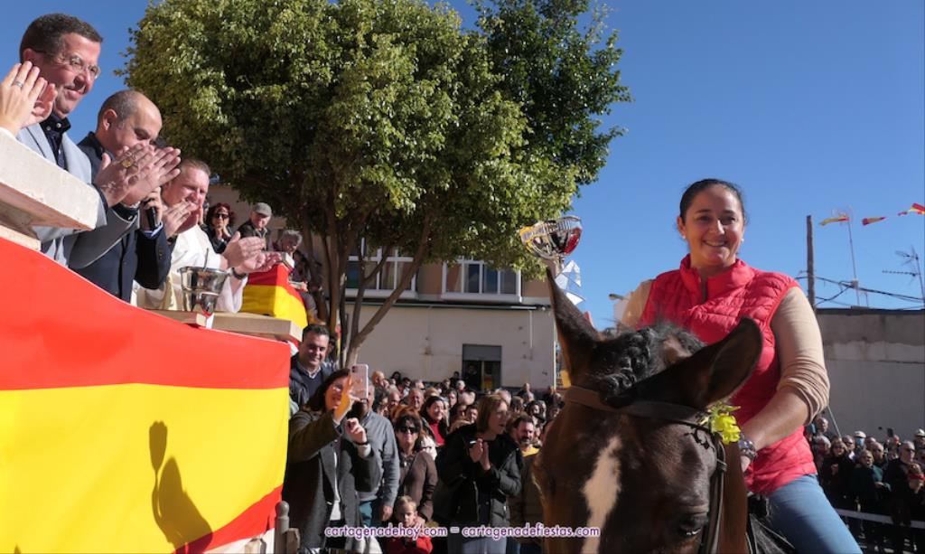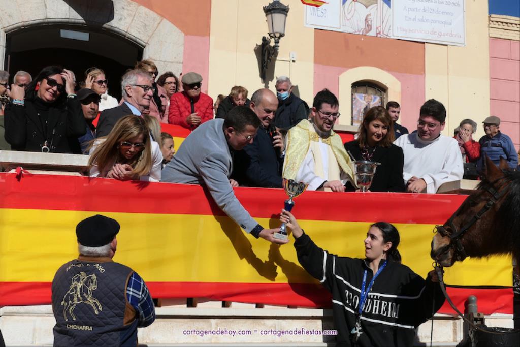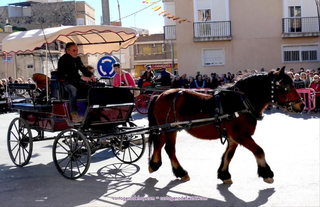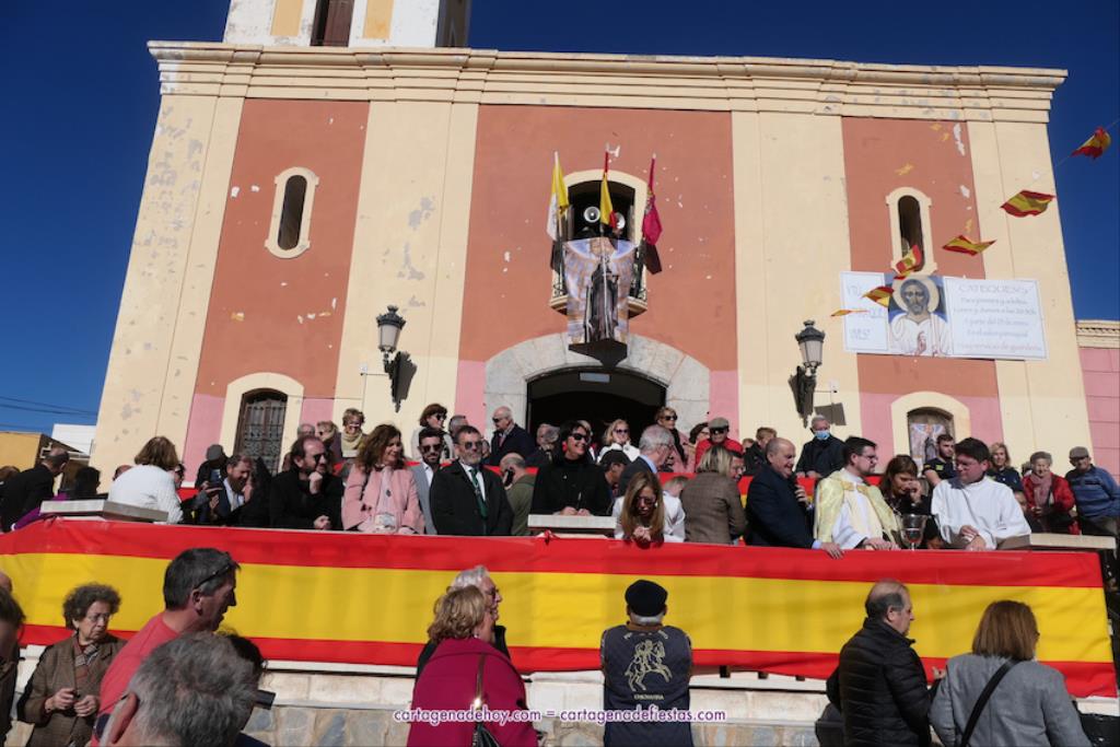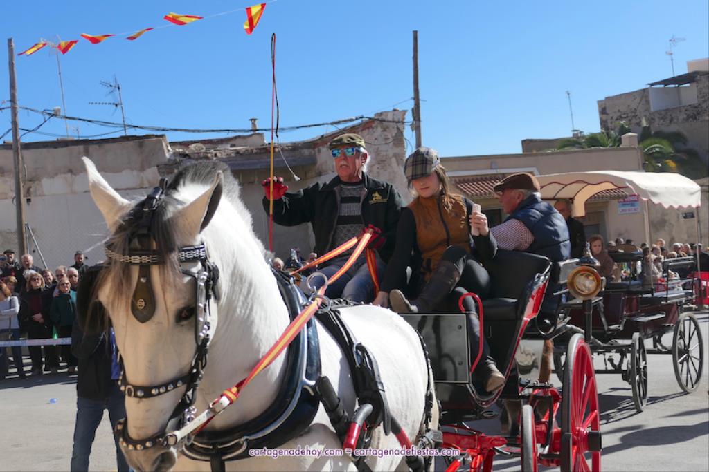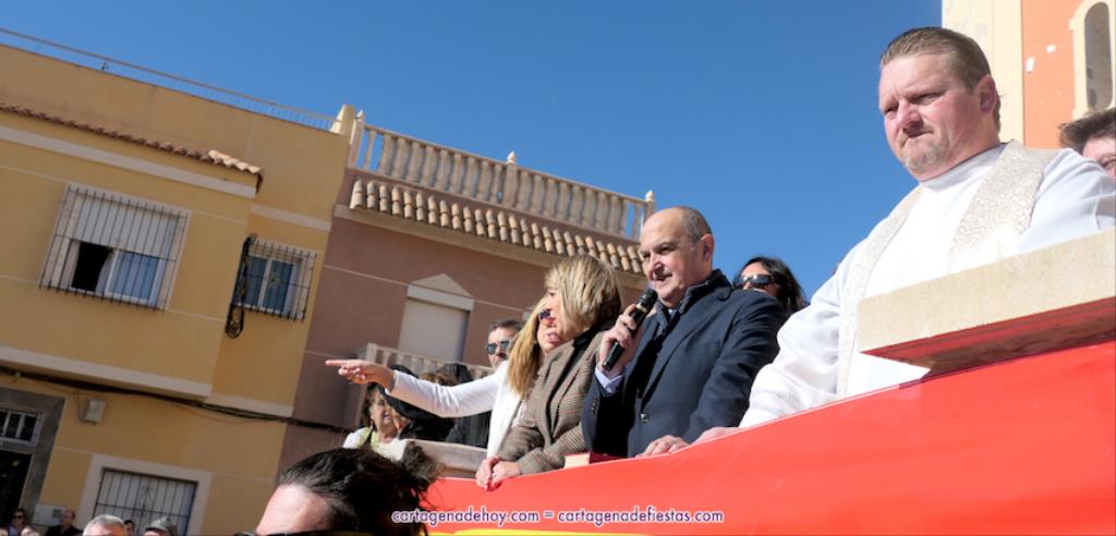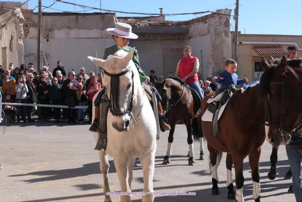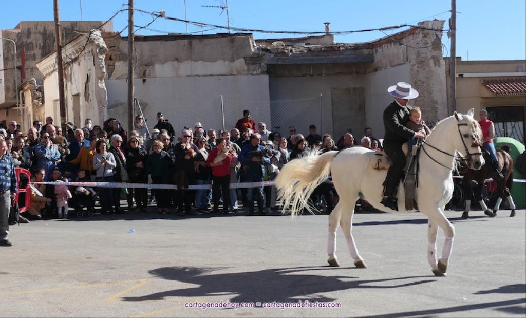 Después, se ha llevado a cabo la bendición de animales a cargo del párroco, Saúl Sánchez Fernández, quien en 2022 fue la primera vez que se 'lanzó al ruedo' de la plaza y ha repetido en este, ahora con más equinos. "Lo hice entonces por seguridad y para evitar problemas con los caballos cuando tenían que subir la acera y gustó, por lo que he repetido, pues además queda bien estéticamente", ha expuesto a Cartagena de Hoy (Cartagena de Fiestas). Además, esa iniciativa ha permitido la agilidad del desarrollo del acto, que ha atraído a numerosos espectadores y una amplia presencia del panorama político local, encabezado por la alcaldesa (Noelia Arroyo) y vicealcaldesa (Ana Belén Castejón).