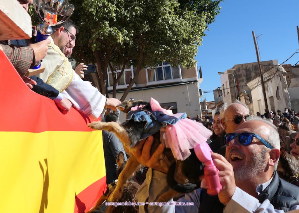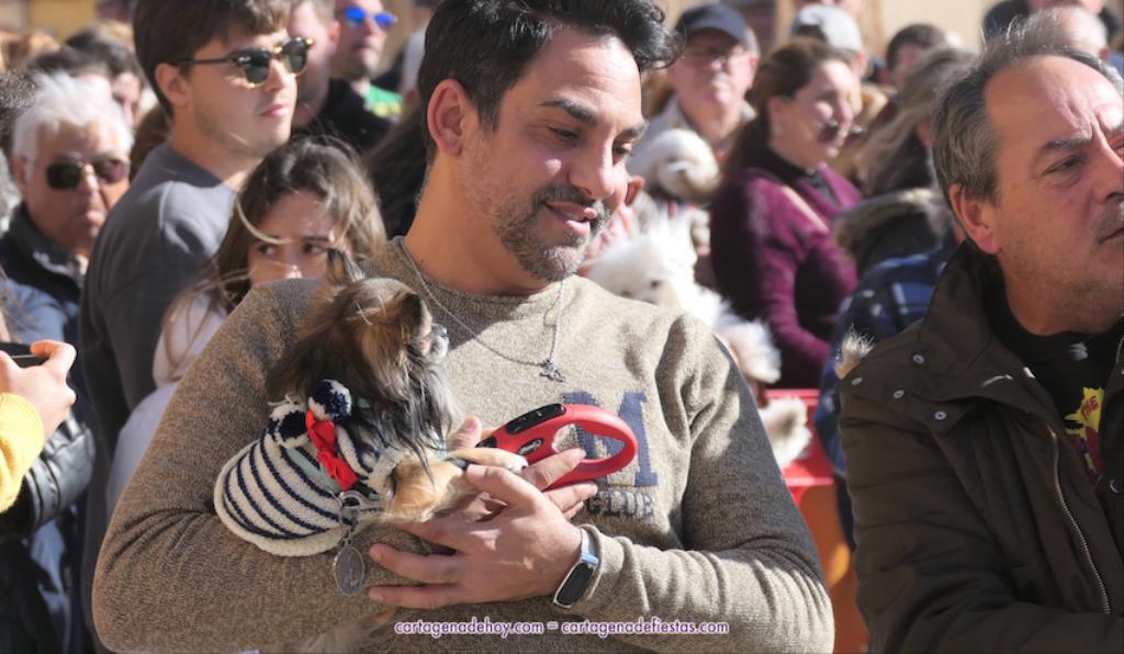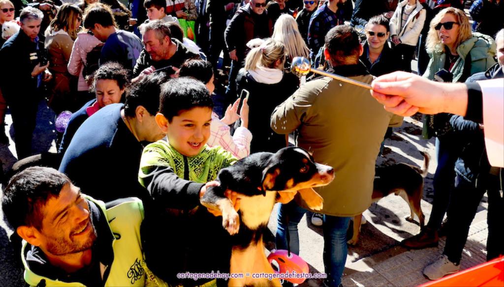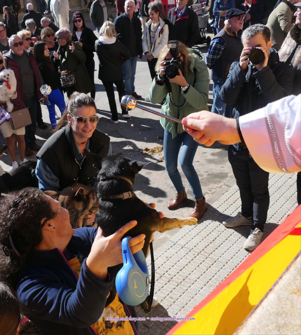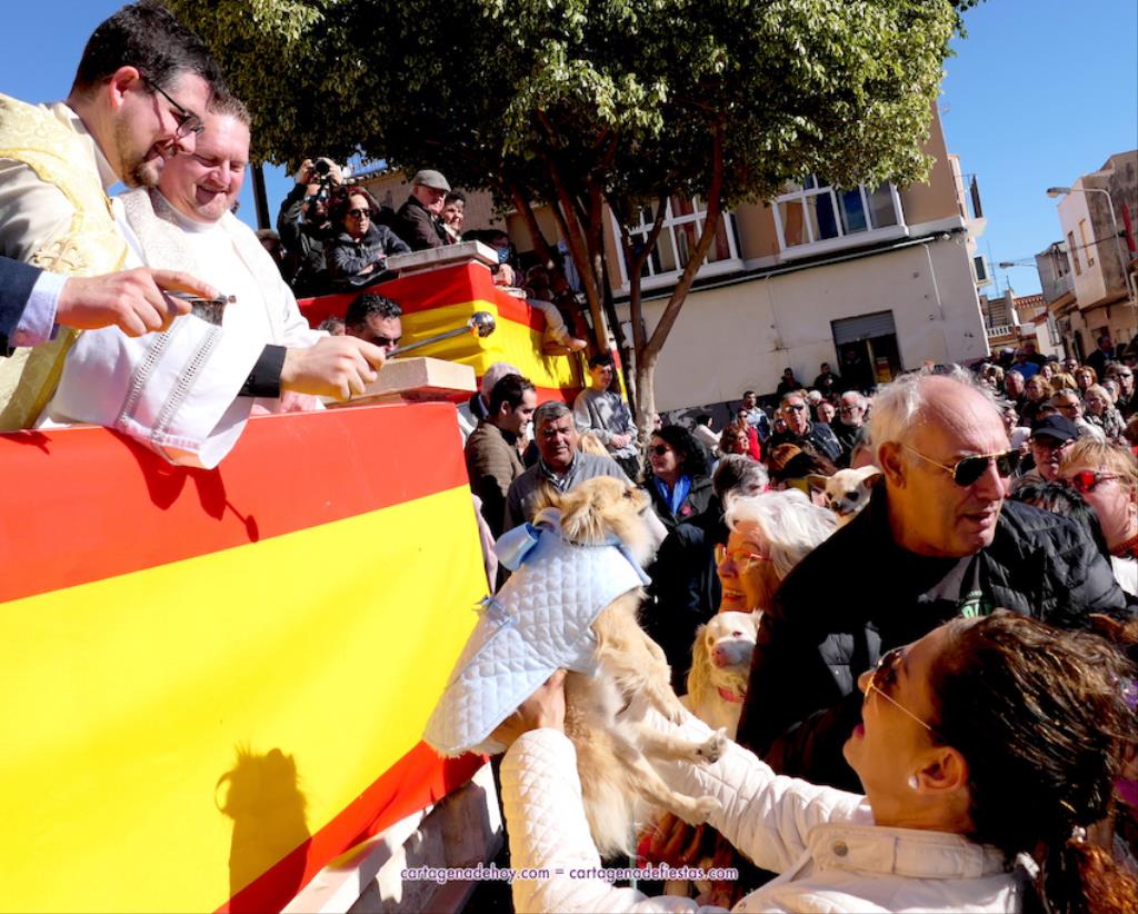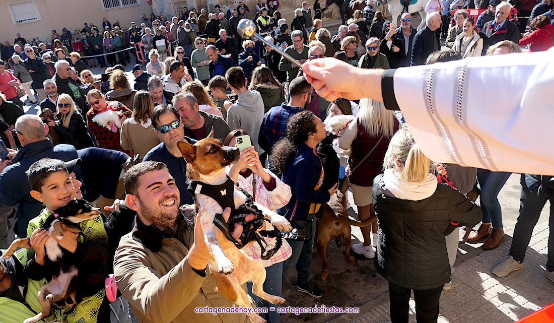 Tras la ausencia de este acto en 2021 y la versión reducida y con mascarillas de 2022, hoy, en una mañana soleada y ventosa, el agua bendita del patrón de la villa cartagenera de San Antonio Abad ha vuelto a ser distribuida entre las mascotas frente a la iglesia, en un acto que ha tenido como preludio le eucaristía del interior del templo oficiada por Ramón de la luz Zapata.