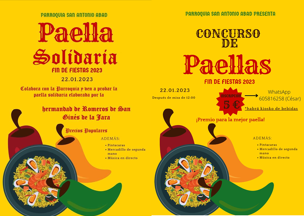 La Hermandad de Romeros de San Ginés de la Jara elaborará una paella solidaria para colaborar con la parroquia de la villa y también se celebrará un concurso de arroces de fin de fiestas. Otros alicientes son pintacaras, mercadillo de segunda mano y música en directo.