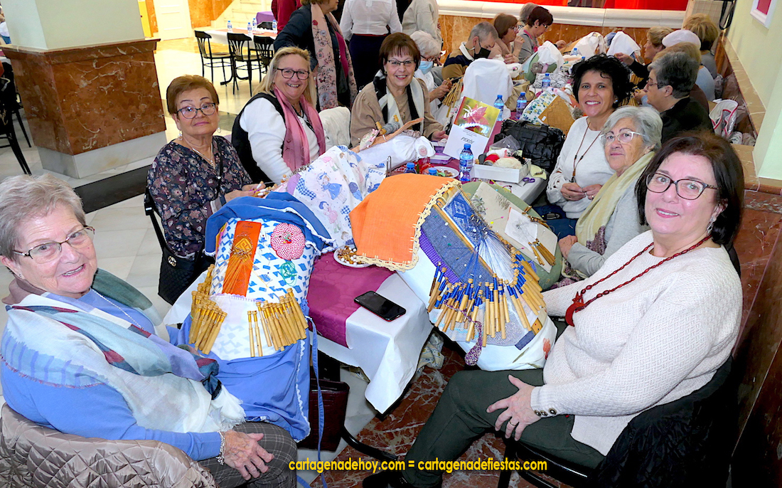 La asociación de 'Encajeras de San Antón', tras el paréntesis pandémico, ha recuperado con la décimo cuarta edición la celebración del encuentro de grupos de diferentes localidades de la Región, que ha reunido a un centenar de estas artistas del hilo en el interior del casino (local social) en una jornada que después ha contado con un almuerzo de convivencia de los asistentes y una lotería familiar, ya por la tarde.
