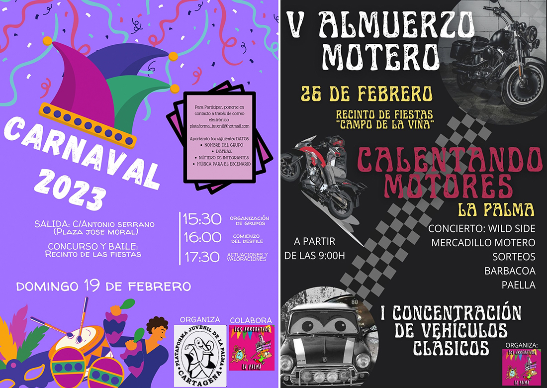 El 19 de febrero habrá desfile de grupos disfrazados en una jornada con concurso y baile en el recinto de las fiestas, donde una semana más tarde tendrán lugar la quinta edición del almuerzo motero y la primera concentración de vehículos clásicos.