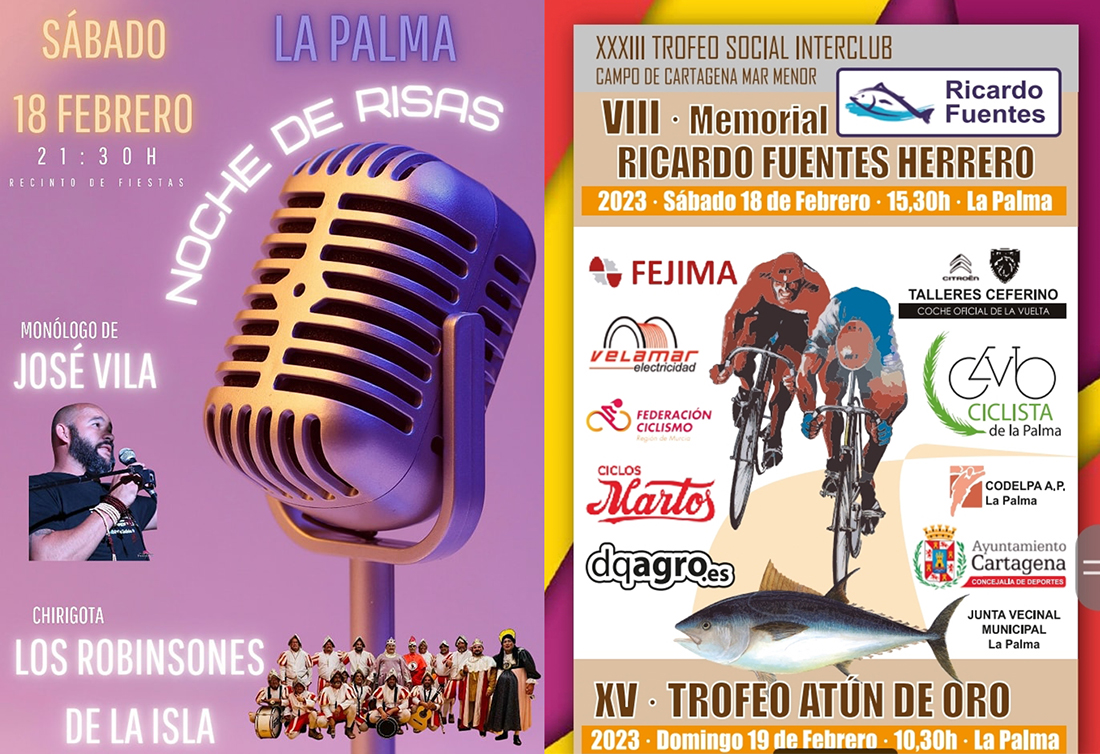 La peña 'Los arrebataos' ofrece este sábado en la carpa festera, en el arranque de las fiestas patronales, el monólogo de José Vila y la chirigota 'Los robinsones de La Isla', mientras que el domingo es para el XV Trofeo 'Atún de oro' que organiza el club ciclista, mientras que la plataforma juvenil es la organizadora del desfile carnavalero esa tarde con unas quinientas personas de 21 grupos locales y el invitado de los cabezudos de Torre Pacheco.