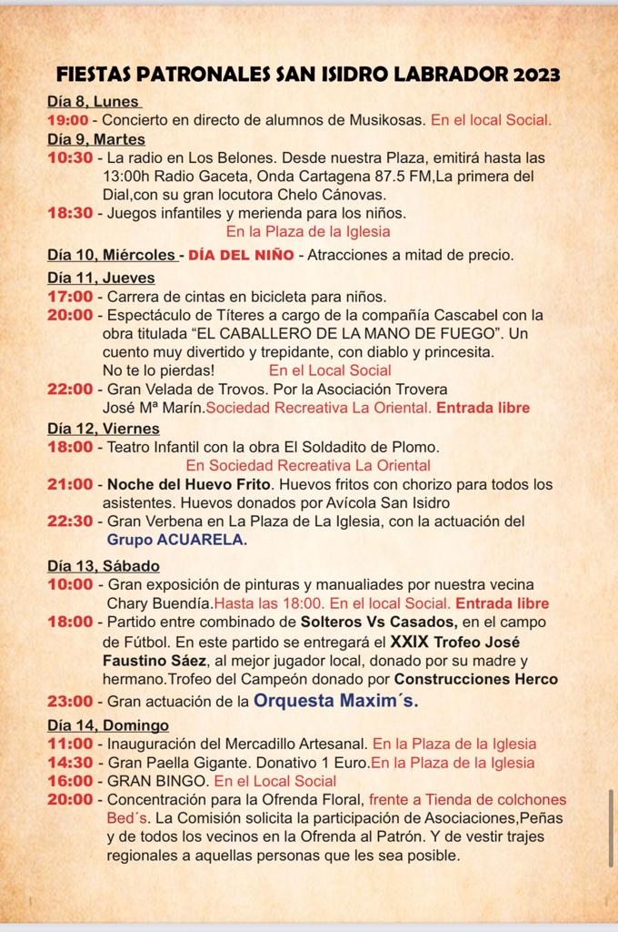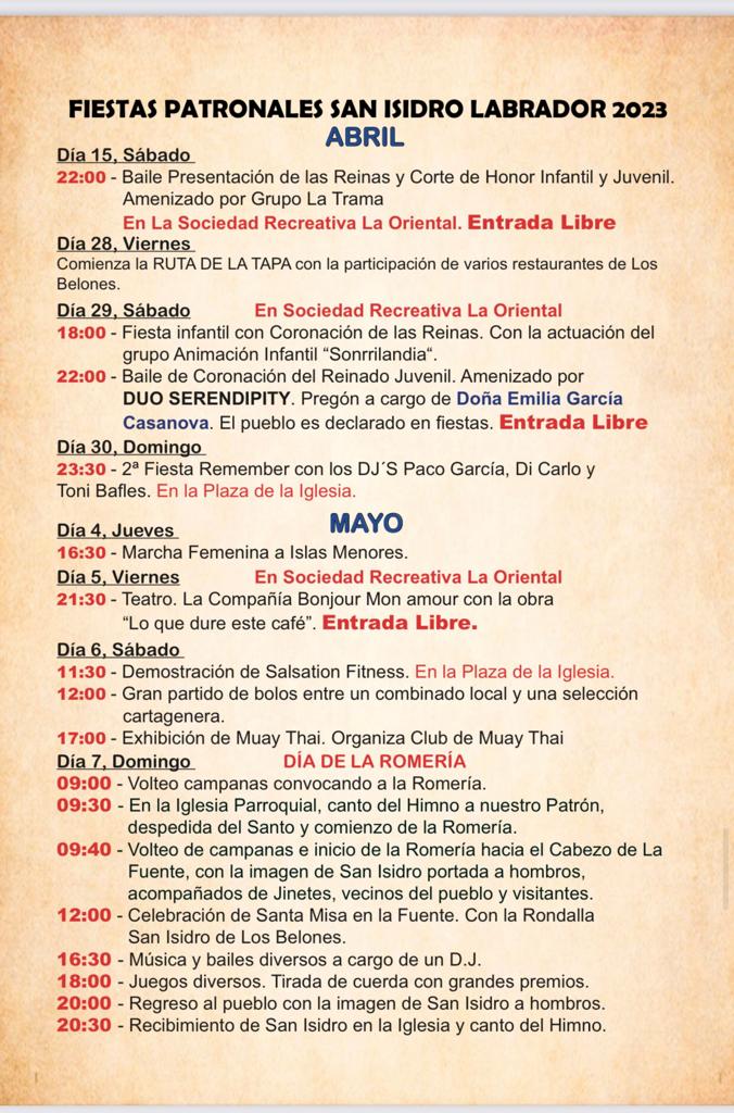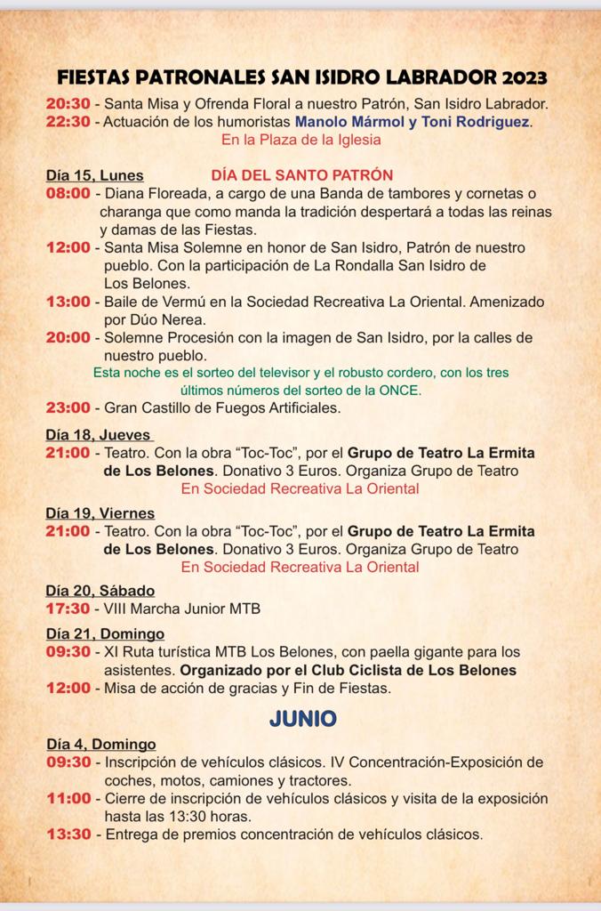 Hoy es la tarde-noche de coronación de la corte real, con velada animada por 'Dúo Serendipity', y mañana hay una 'fiesta remember'. La romería será el 6 de mayo, 'Orquesta Maxim's' estará el sábado 13 y al día siguiente protagonizarán la noche de humor Manolo Mármol y Toni Rodríguez. La comisión de fiestas también ha programado marcha femenina, teatro, bolos, conciertos, títeres, trovos, noche del huevo frito, exposiciones, deportes, mercadillo artesana, arroz gigante, ofrenda floral, procesión, ruta turística MTB, vehículos clásicos...