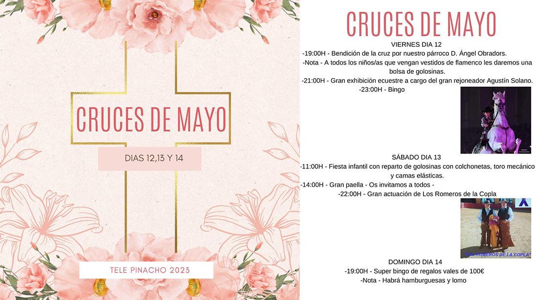 La Cruz de Mayo que organiza la ADC El Pinacho se va a celebrar el 12 al 14 de mayo, incluyendo la acteuación del rejoneador Agustín Solano la primera noche y un arroz gratuito para los asistentes el sábado a mediodía.