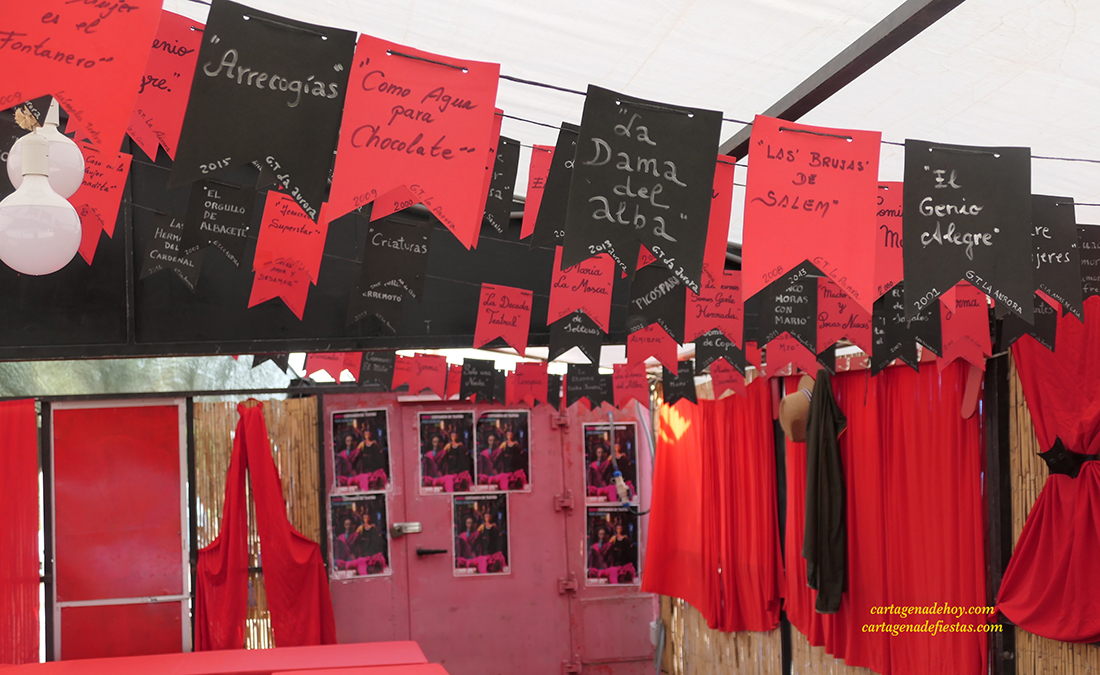 El grupo de teatro La Aurora ha adornado su recinto de las Fiestas de Primavera de Pozo Estrecho con banderolas en las que figuran los nombres de representaciones teatrales que han participado en su certamen, que este año ha cumplido 28 ediciones.