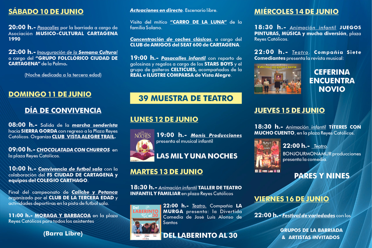 Del 10 al 17 de junio tendrá lugar la XXXIX Semana Cultural de Vista Alegre, organizada por el Colectivo Cultural VISAL en colaboración con las Concejalías de Cultura, Festejos, Juventud, Igualdad y Servicios Sociales del Ayuntamiento de Cartagena.