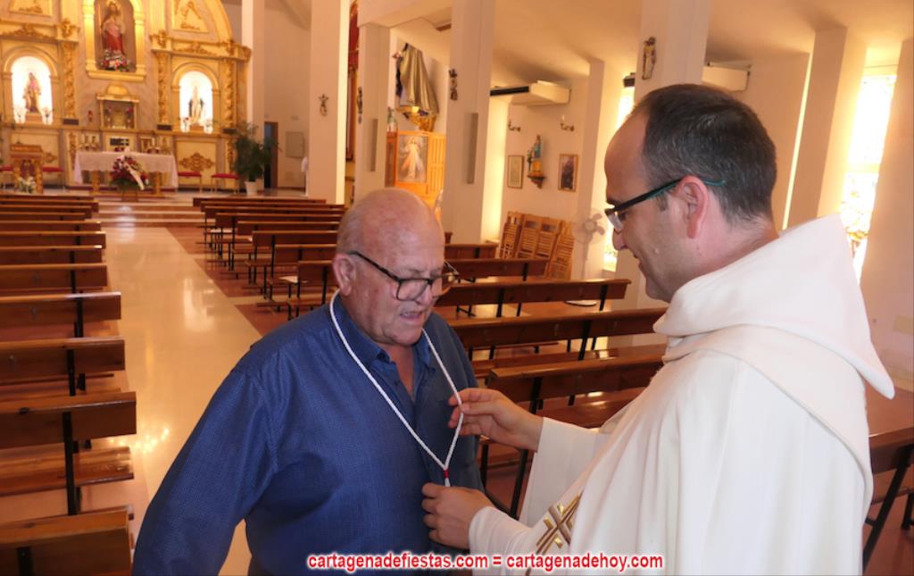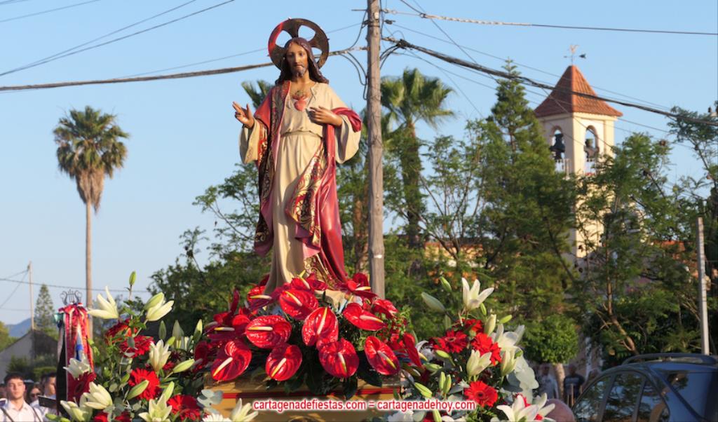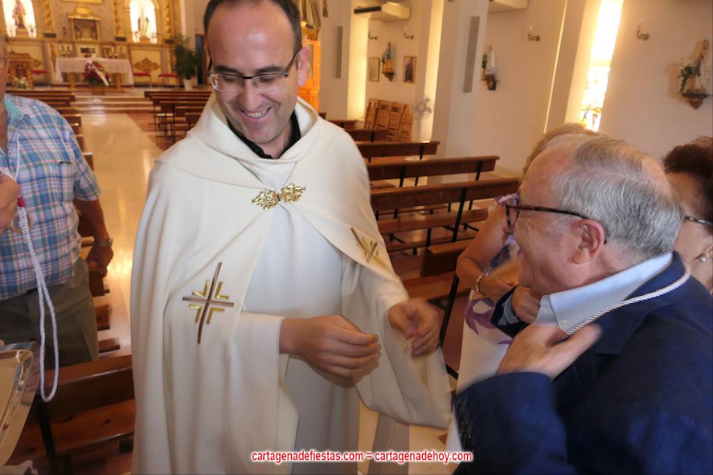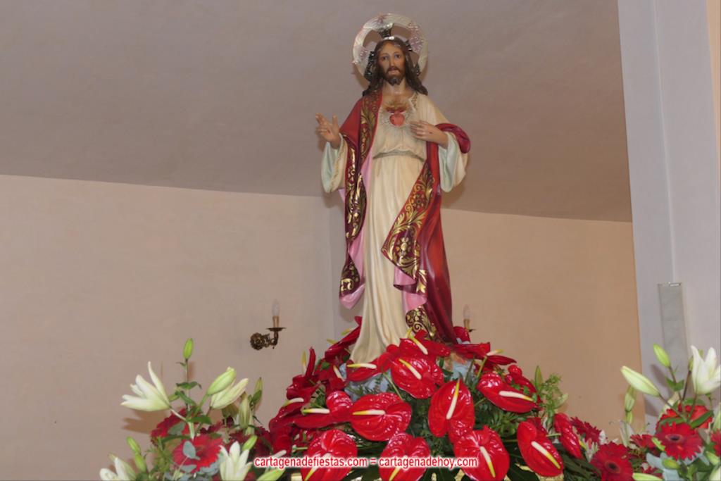 Va a comenzar la procesión y el sacerdote lleva a cabo la imposición de medallas dentro de la iglesia, donde nos llama la atención que las cuatro personas que empujan al trono de ruedas que lleva al Sagrado Corazón son vecinos de avanzada edad, lo que es distinto a lo visto en otras localidades. Preguntamos quién es el mayor y resulta que esta vez no va con el trono, sino lanzando los cohetes junto al presidente de la comisión de fiestas. Se llama Carlos Campillo y tiene 89 años de edad. “Soy nacido aquí y conozco las fiestas desde muy pequeño”, nos dice, además de apuntar que los festejos han sufrido notables cambios con el paso de los años. Con la imagen también tiene una relación especial, pues además de sacarla en procesión, hace unos siete año construyó el trono sobre el que avanza la imagen.