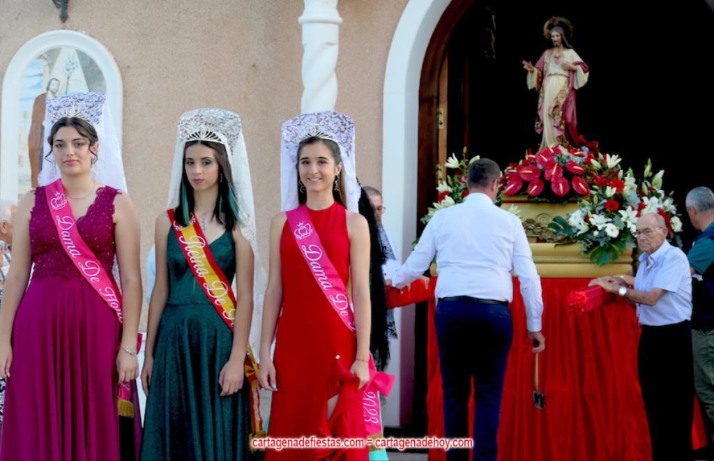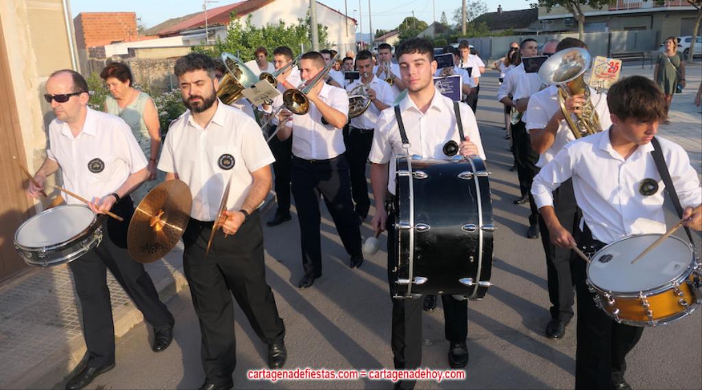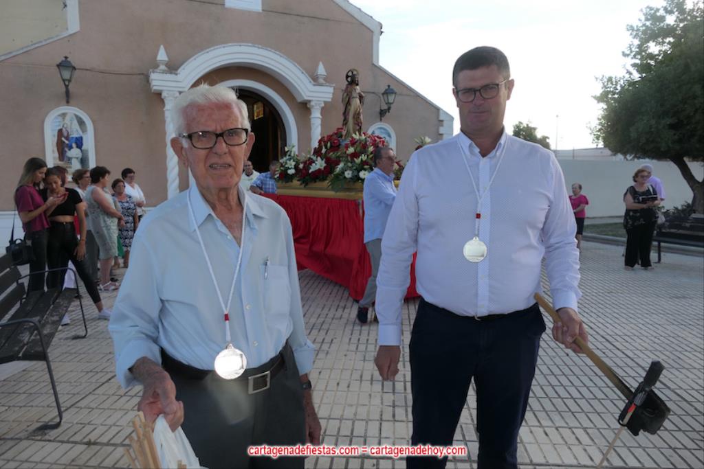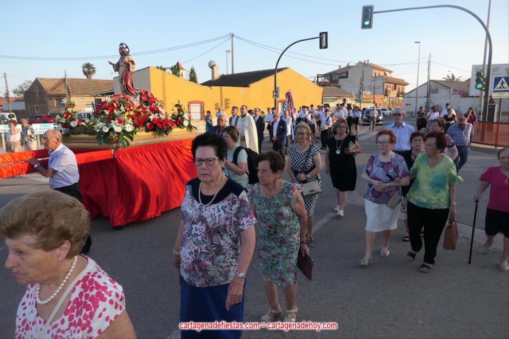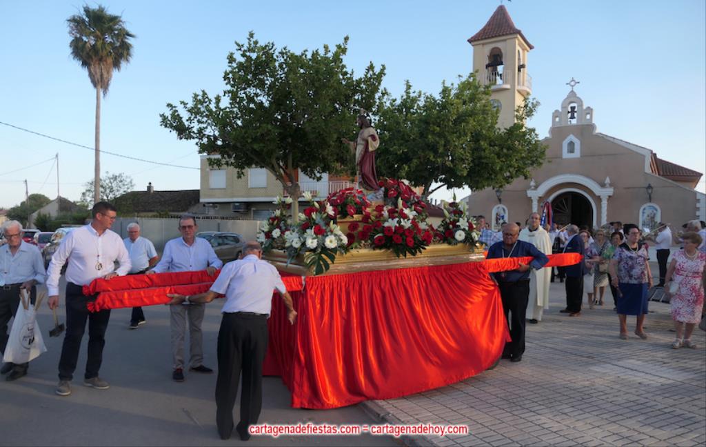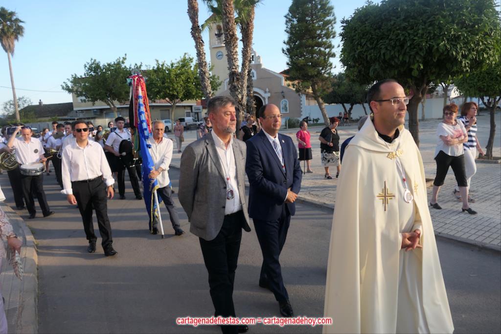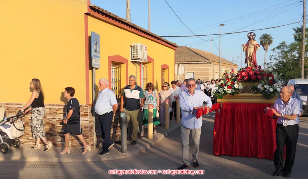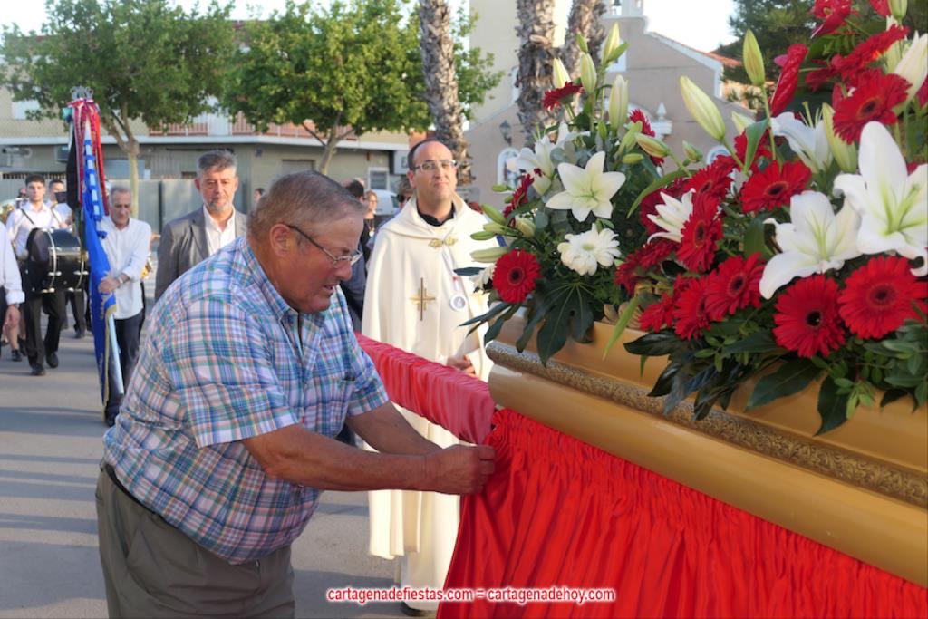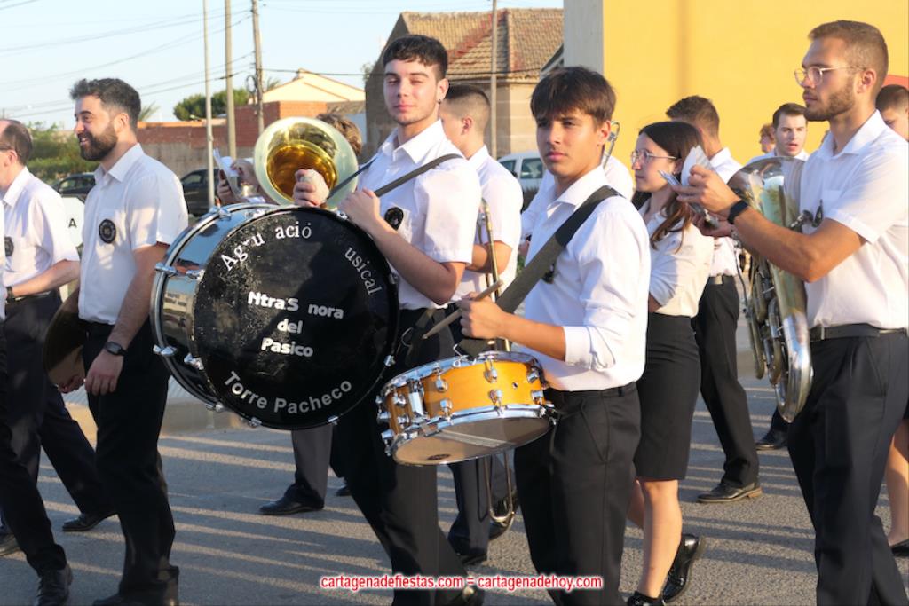 La procesión celebrada ayer fue encabezada por la reina y damas de las fiestas de este año, siendo la banda de música de la pachequera localidad de El Pasico la que animó la marcha, en la que también iban el párroco y los presidentes de la Junta Vecinal Municipal y Asociación de Vecinos y el hermano mayor de la Cofradía del Cristo de la Sangre, entre otros, siendo los devotos vecinos los que formaron sendas hileras de acompañamiento en los laterales del patrono.