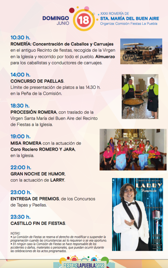 Los festejos acaban este fin de semana. Esta tarde hay carrera de cintas a cabo, mientras que la noche será para la música de Sergio Albir (23 horas, con canción española) y del ‘Tributón festival’, que tiene a Jesus de Manuel, quien participó en los televisivos programas de ‘Operación triunfo’ y ‘Supervivientes’, a partir de la medianoche. El domingo es para la romería y el fin de fiestas con misa y procesión romera, entrega de premios, concurso de arroces y noche de humor.