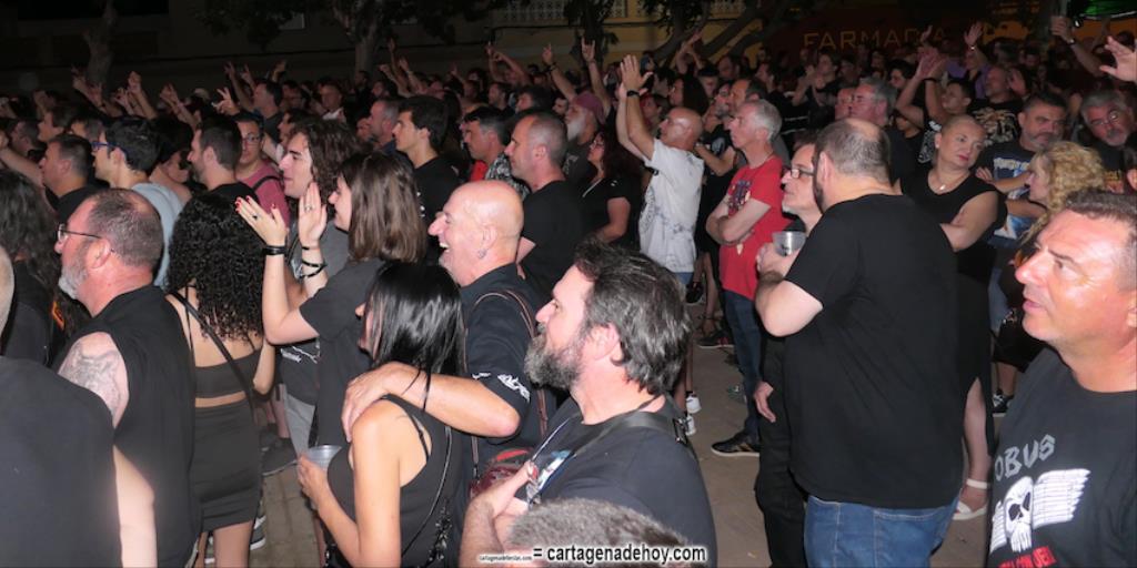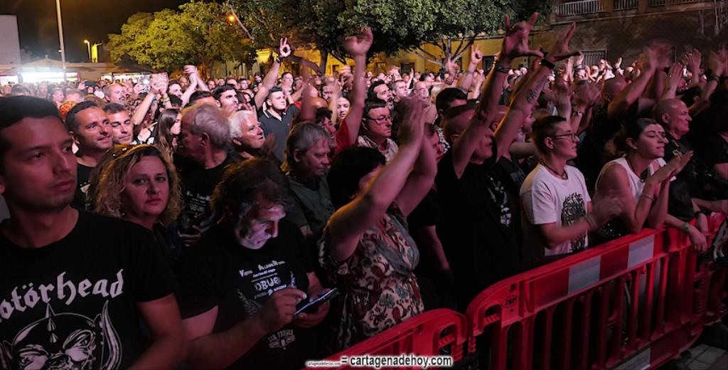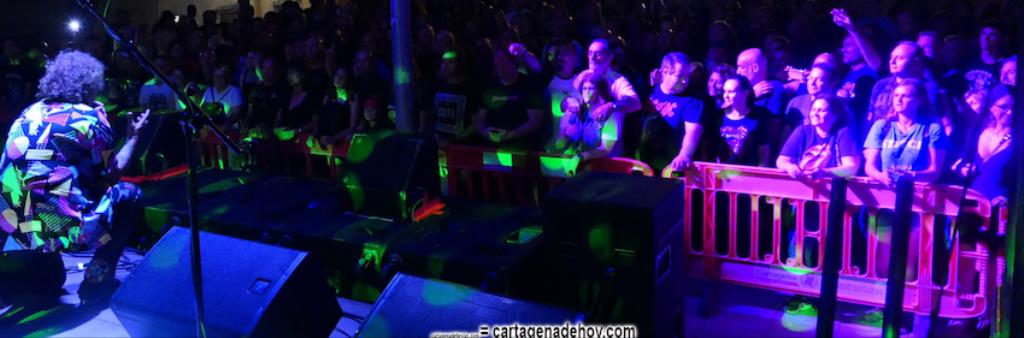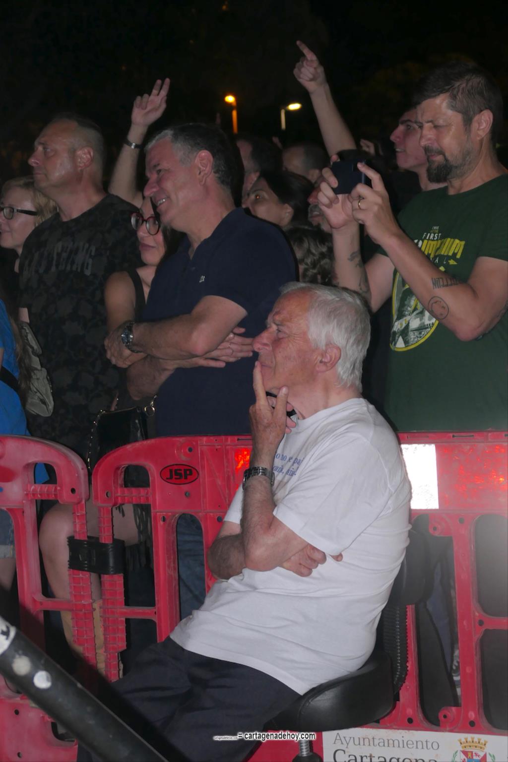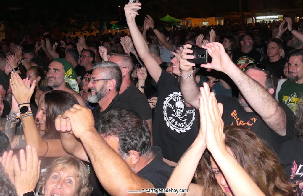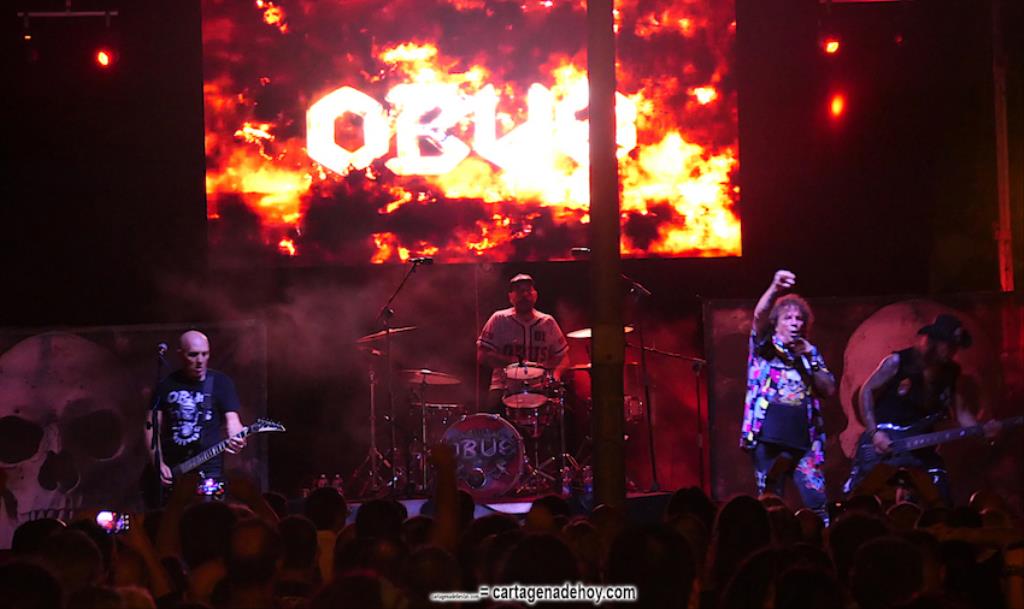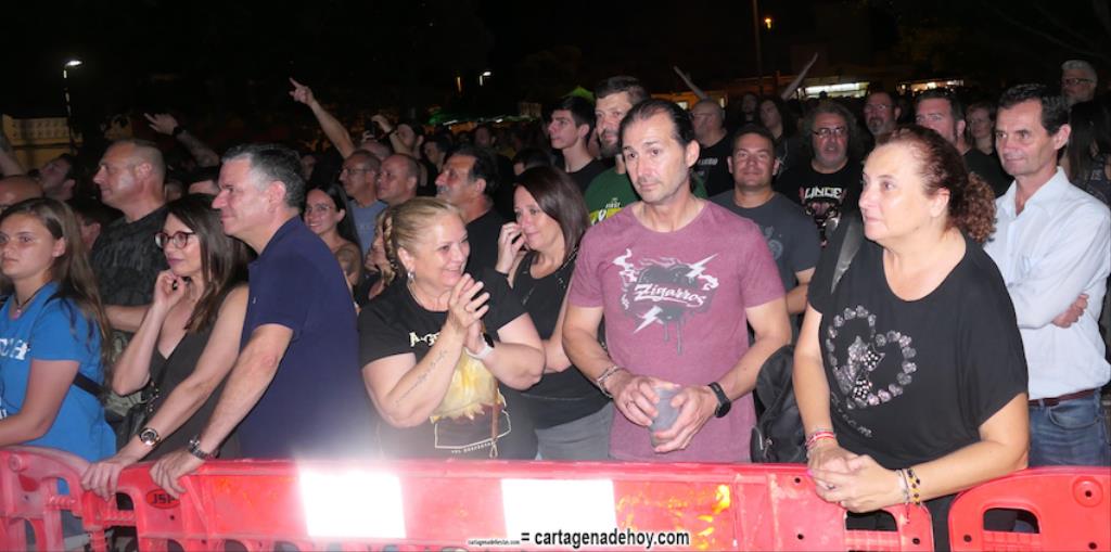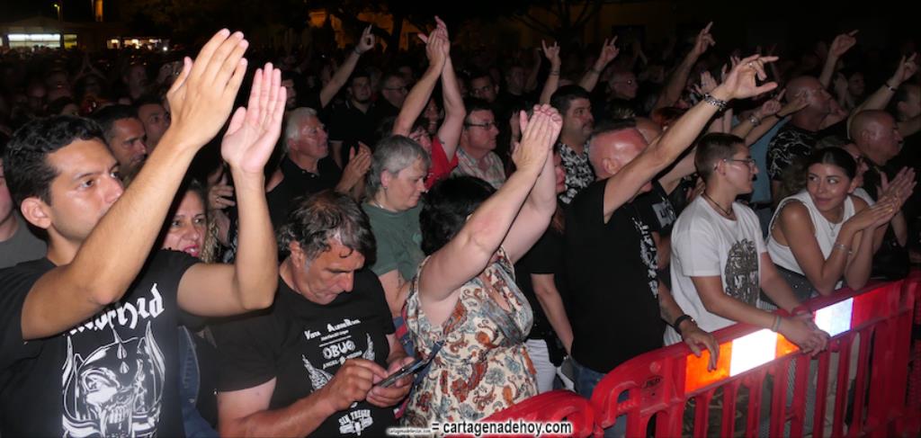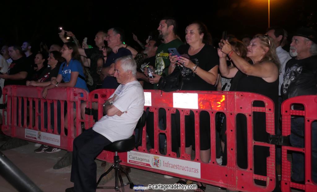 Vamos al capítulo musical, que comenzó sobre las diez y media de la noche y alcanzó las cuatro de una madrugada en la que, poco después,  regresó la lluvia a Cartagena. Estupendas actuaciones de ‘Sin tregua’, ‘Sharabia’ y ‘Ángel Negro’, que también tienen a sus fieles conquistados merced a su buenhacer y calidad sonora, dentro de las variantes del rock que ofrecieron. Minutos antes de las dos de la madrugada apareció el cuarteto de ‘Obús’, siendo el último en subir al escenario un Fortu con camisa colorida, lo que contrastó en un ambiente donde la mayoría lucían las tradicionales camisetas negras. Comenzó con “Necesito más” y no faltó en su repertorio el súperconocido ‘Va a estallar el obús’ ni el ‘Dinero, dinero’ o el ‘Que te jodan’. Maestro sobre las tablas, fue puntal en mantener el júbilo entre el público. “¡¿Dónde estamos?!”, preguntaba a gritos. Unos decían que en Cartagena y otros que en Vista Alegre. Pues no… “¡Estamos en un concierto de rock…, arriba las manos!”.