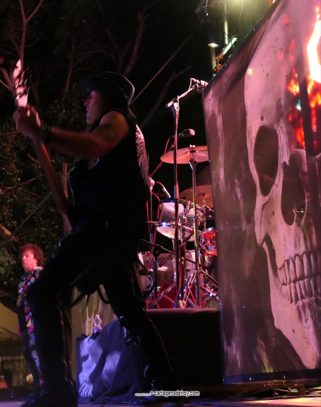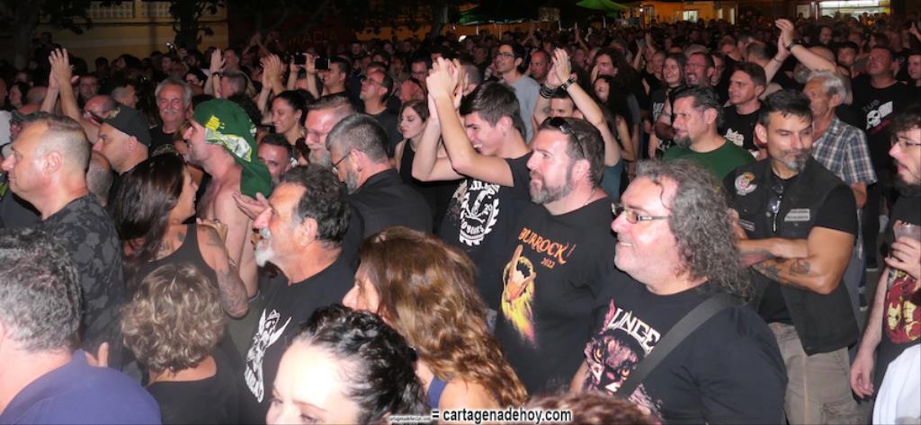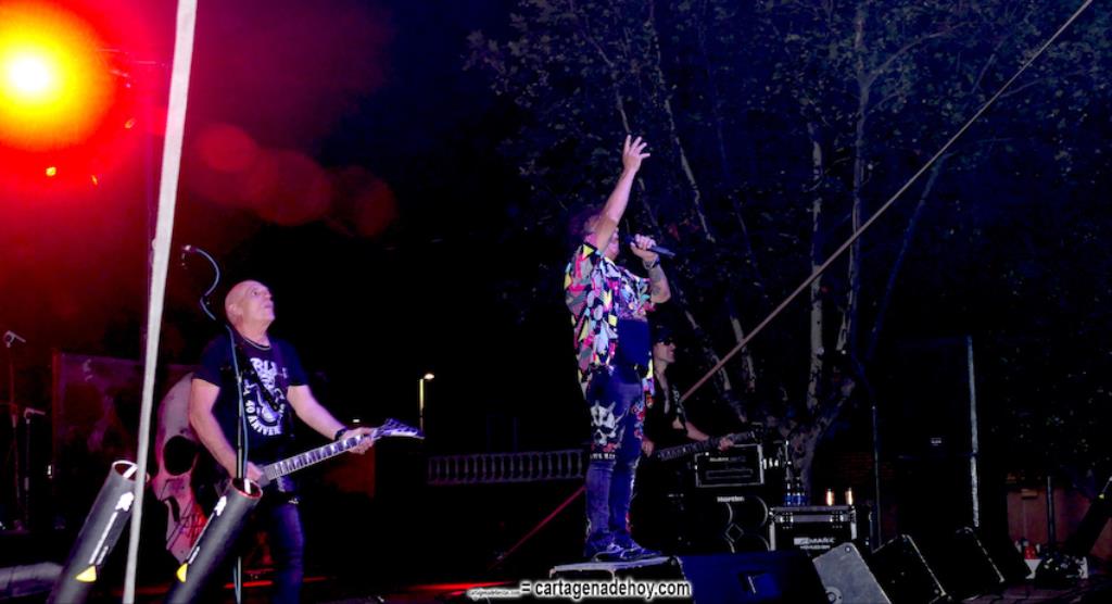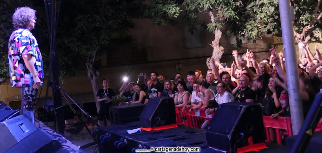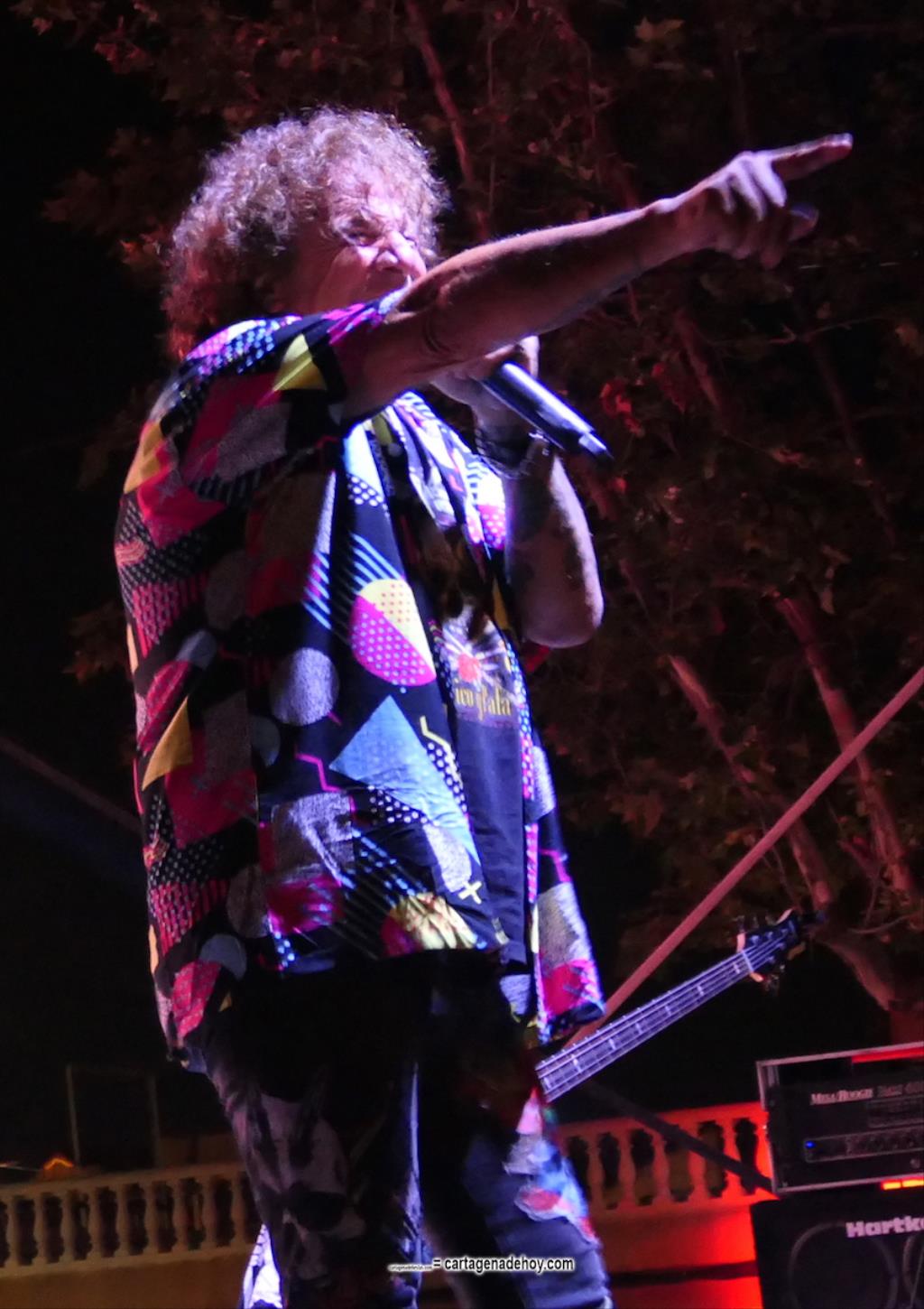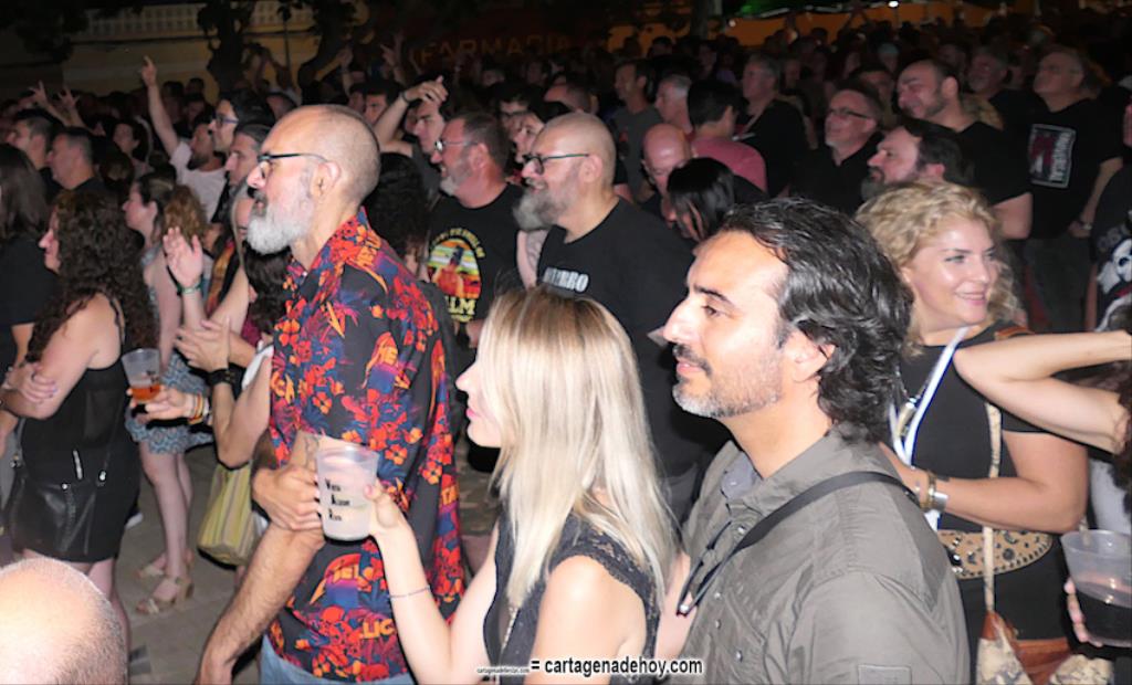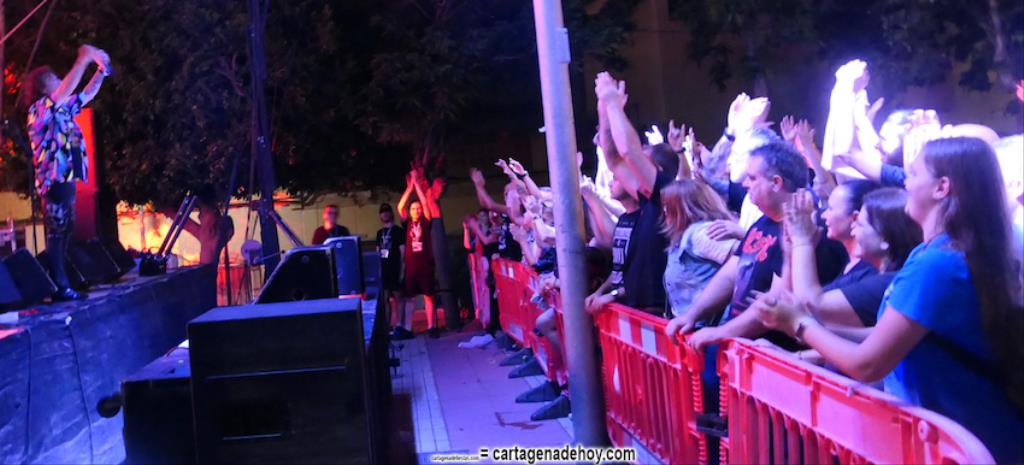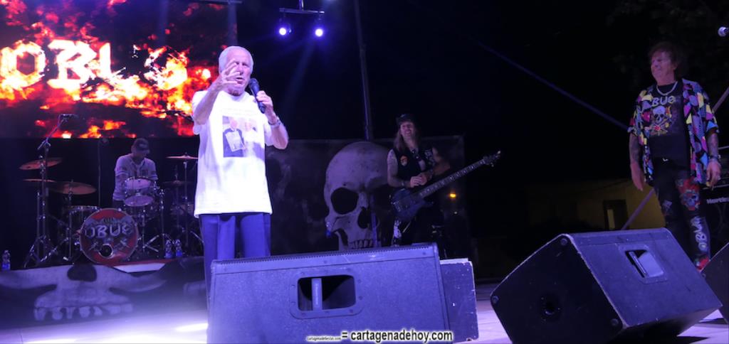 Vamos al capítulo musical, que comenzó sobre las diez y media de la noche y alcanzó las cuatro de una madrugada en la que, poco después,  regresó la lluvia a Cartagena. Estupendas actuaciones de ‘Sin tregua’, ‘Sharabia’ y ‘Ángel Negro’, que también tienen a sus fieles conquistados merced a su buenhacer y calidad sonora, dentro de las variantes del rock que ofrecieron. Minutos antes de las dos de la madrugada apareció el cuarteto de ‘Obús’, siendo el último en subir al escenario un Fortu con camisa colorida, lo que contrastó en un ambiente donde la mayoría lucían las tradicionales camisetas negras. Comenzó con “Necesito más” y no faltó en su repertorio el súperconocido ‘Va a estallar el obús’ ni el ‘Dinero, dinero’ o el ‘Que te jodan’. Maestro sobre las tablas, fue puntal en mantener el júbilo entre el público. “¡¿Dónde estamos?!”, preguntaba a gritos. Unos decían que en Cartagena y otros que en Vista Alegre. Pues no… “¡Estamos en un concierto de rock…, arriba las manos!”.