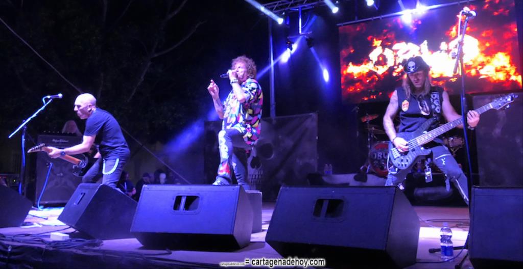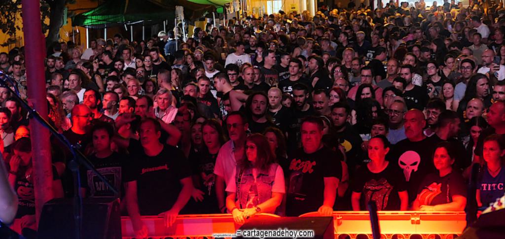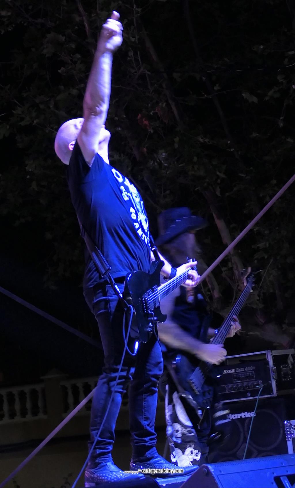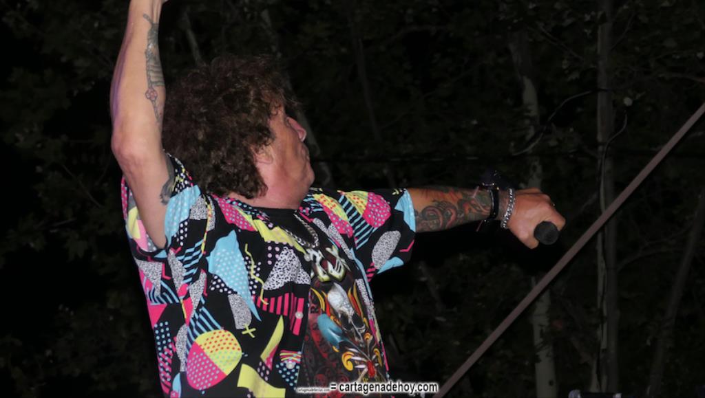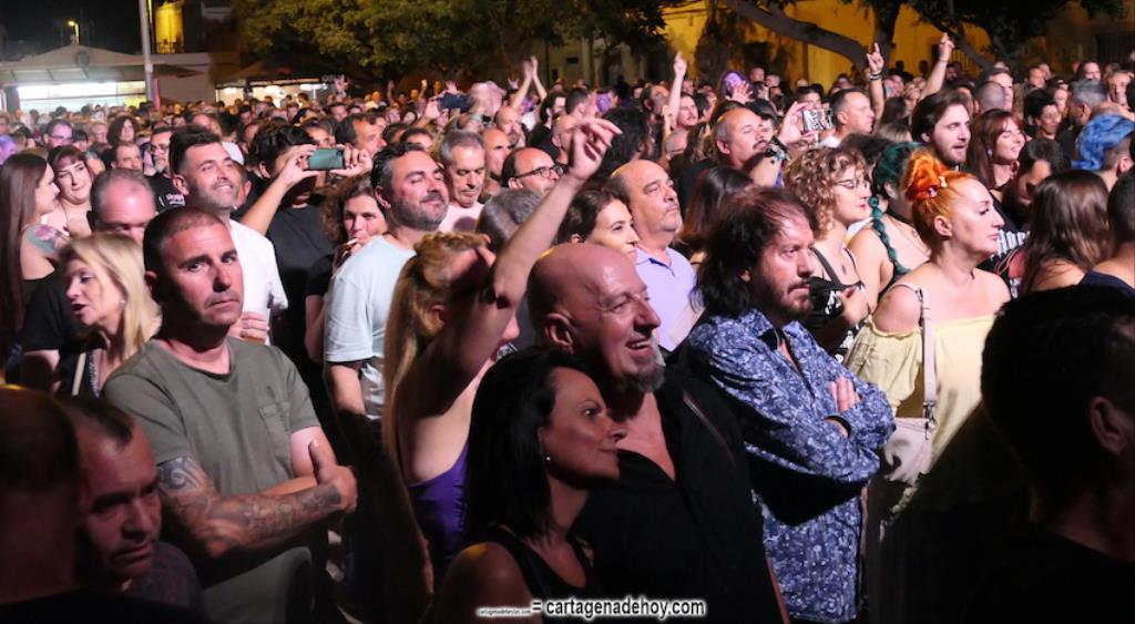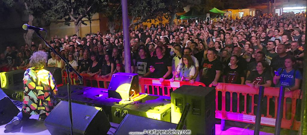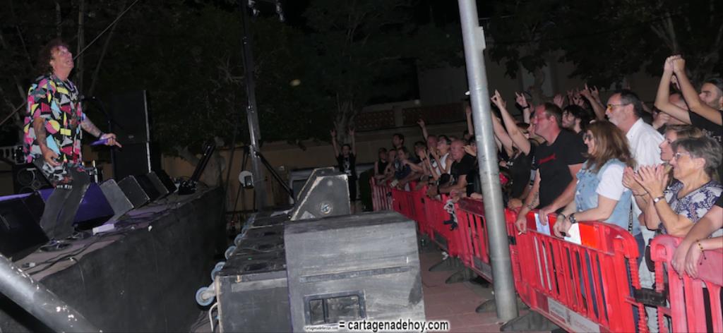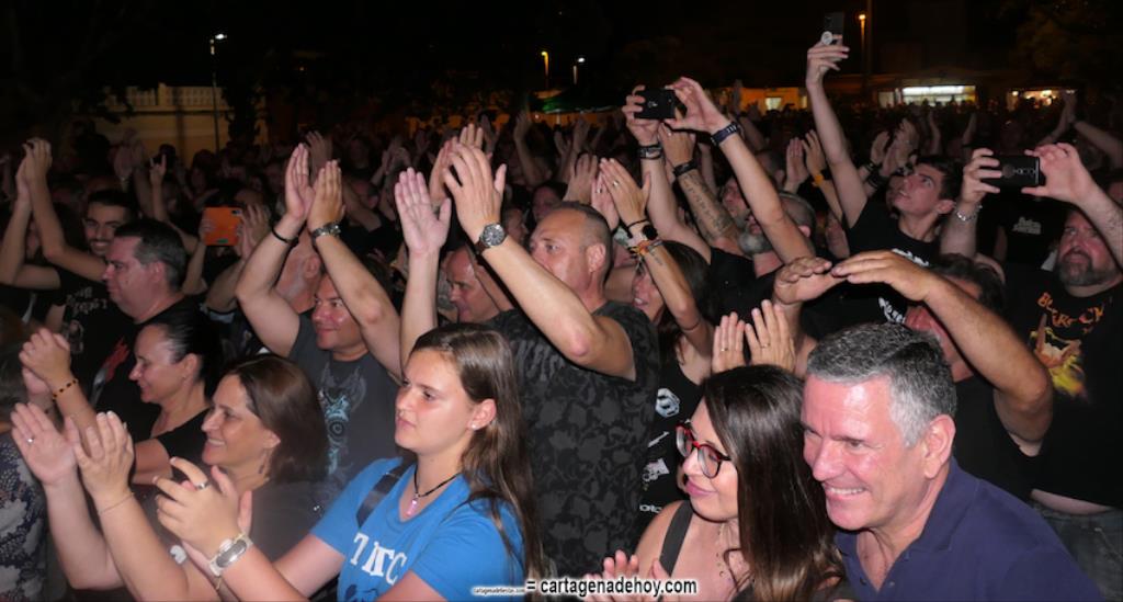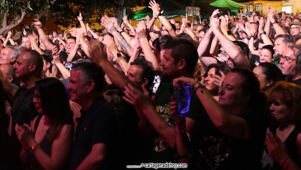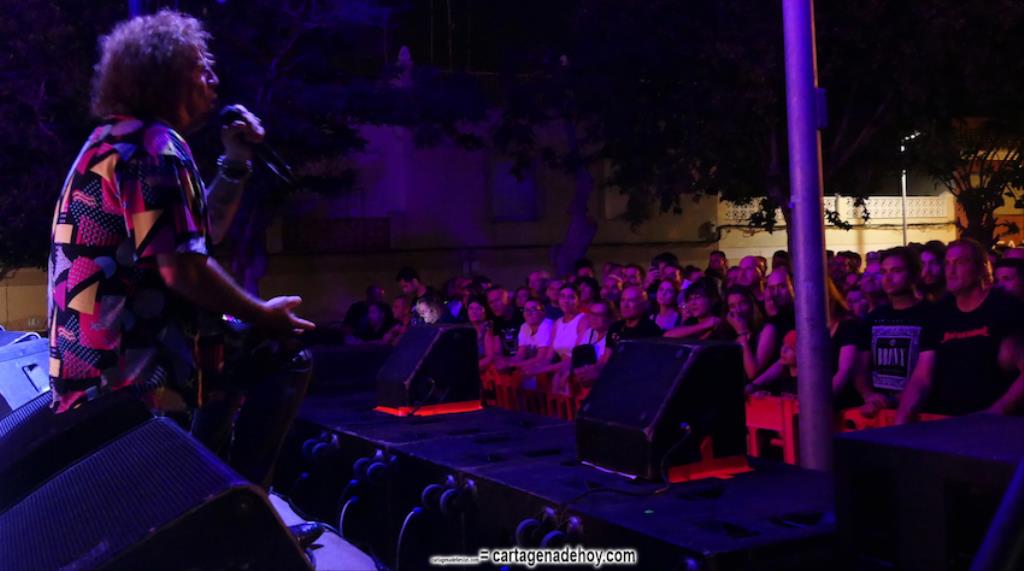 Vamos al capítulo musical, que comenzó sobre las diez y media de la noche y alcanzó las cuatro de una madrugada en la que, poco después,  regresó la lluvia a Cartagena. Estupendas actuaciones de ‘Sin tregua’, ‘Sharabia’ y ‘Ángel Negro’, que también tienen a sus fieles conquistados merced a su buenhacer y calidad sonora, dentro de las variantes del rock que ofrecieron. Minutos antes de las dos de la madrugada apareció el cuarteto de ‘Obús’, siendo el último en subir al escenario un Fortu con camisa colorida, lo que contrastó en un ambiente donde la mayoría lucían las tradicionales camisetas negras. Comenzó con “Necesito más” y no faltó en su repertorio el súperconocido ‘Va a estallar el obús’ ni el ‘Dinero, dinero’ o el ‘Que te jodan’. Maestro sobre las tablas, fue puntal en mantener el júbilo entre el público. “¡¿Dónde estamos?!”, preguntaba a gritos. Unos decían que en Cartagena y otros que en Vista Alegre. Pues no… “¡Estamos en un concierto de rock…, arriba las manos!”.