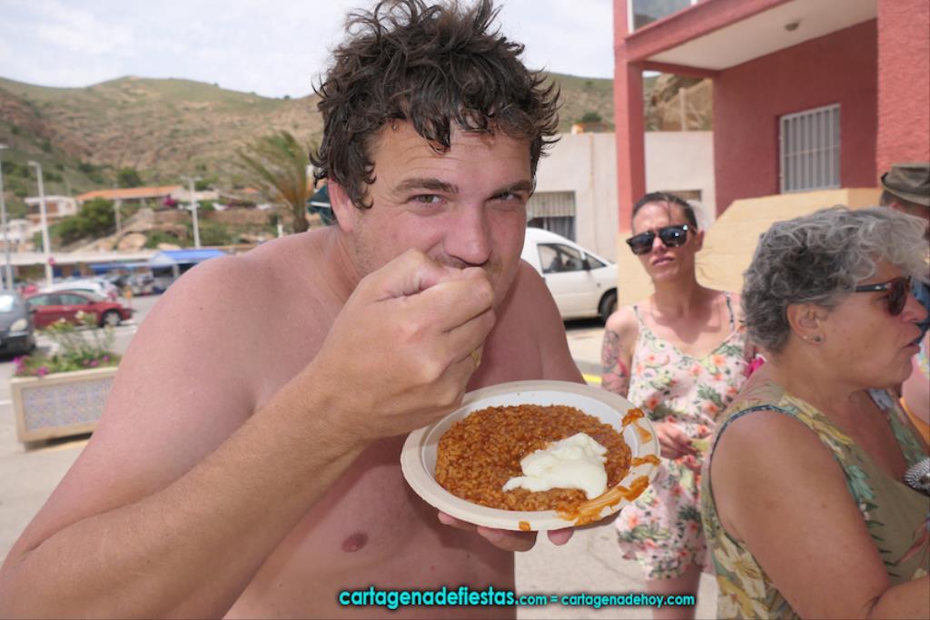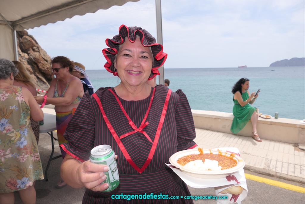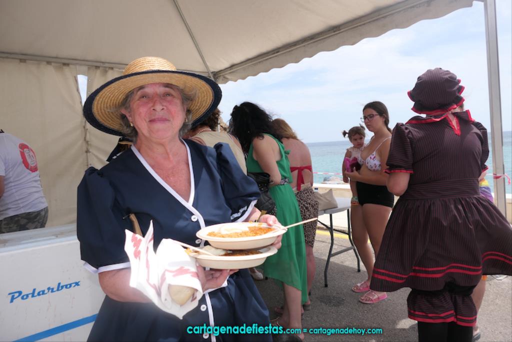 El sábado hubo 'pepitos modernistas' y el domingo tocó el turno al caldero elaborado por José Antonio Martínez 'El Kachi', presidente de la Asociación Cultural Modernistas de Cartagena de Levante, organizadores de las jornadas en colaboración con la Asociación de Vecinos de El Portús y el Ayuntamiento de Cartagena. Se sirvieron en una carpa habilitada por cantina y cocina a precio módico para potenciar el ambiente de estas jornadas. También se saborearon las rosquillas que días atrás también aparecieron en la presencia de los modernistas en el televisivo 'Ailoviu' y, dado el calor, no faltaron los refrescantes helados.