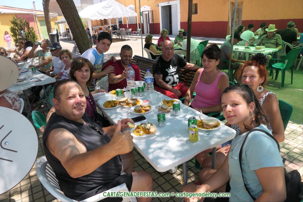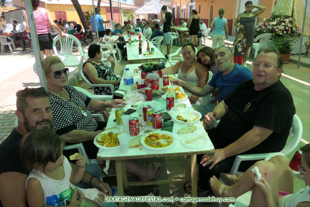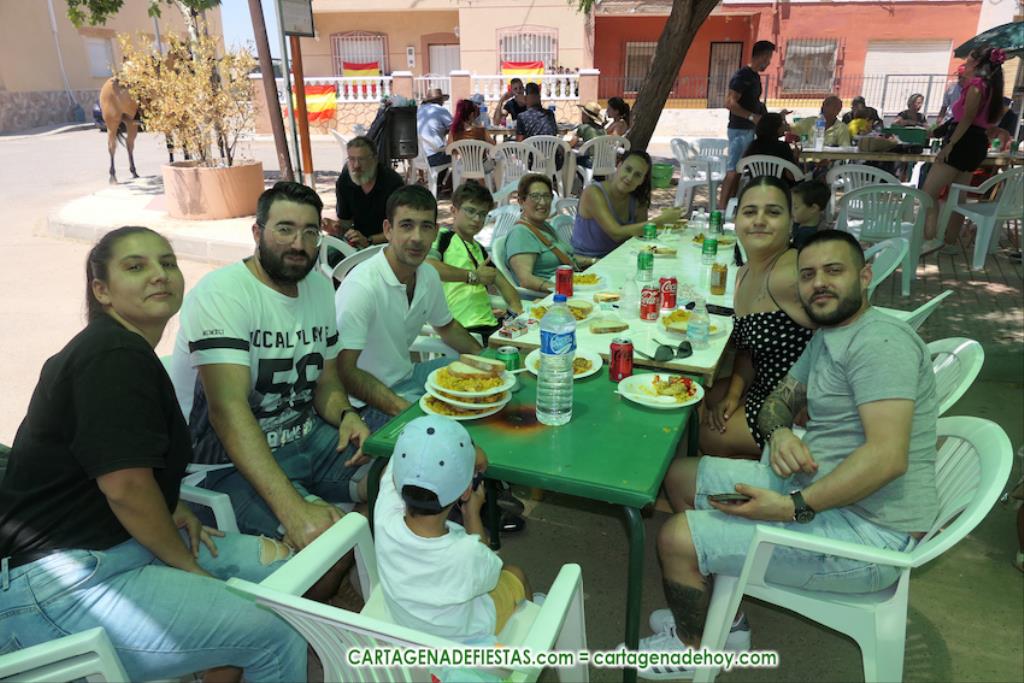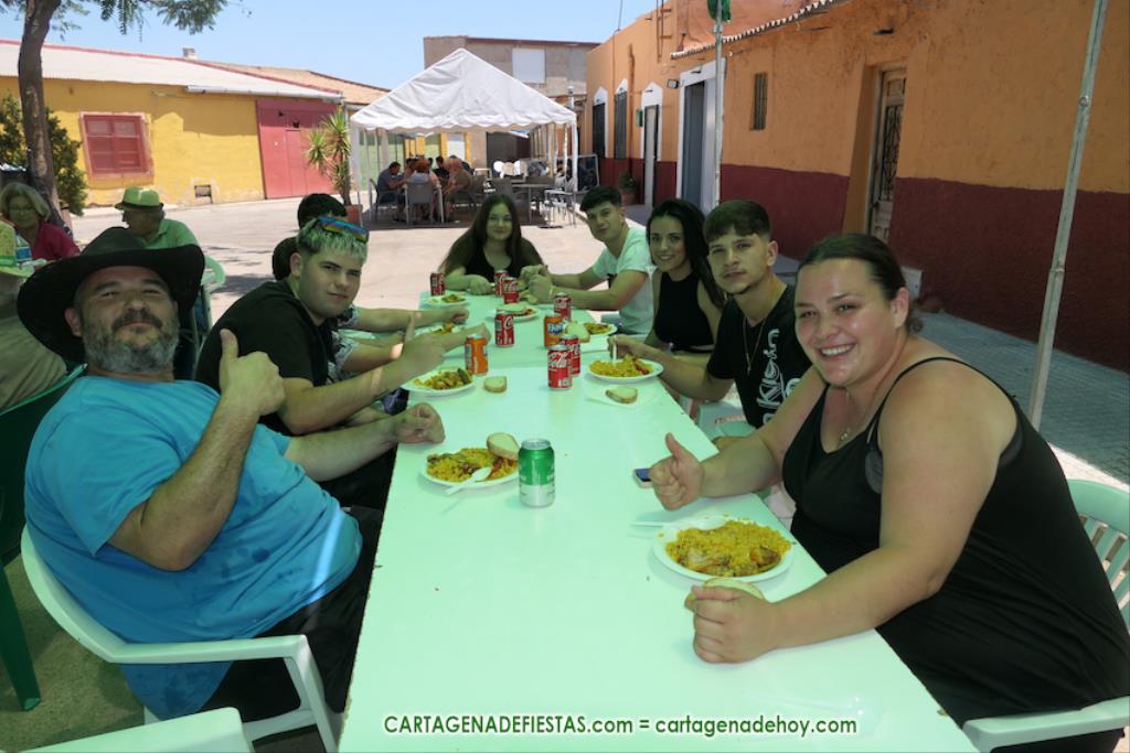 El domingo fue el día grande con la presencia de la Virgen, quien salió de la iglesia de La Guía en romería hacia la plaza del Pozo de los Palos ubicada junto al local de la asociación de vecinos, donde hubo almuerzo con morcillas, empanada gigante y 'muy buen rollo', como continuó después con un gigantesco arroz que compartieron de forma gratuita los asistentes, entre los que figuran representantes de Movimiento Ciudadano, entre los que figuraban José López y el edil Enrique Pérez, entre otros, quienes también llevaron a cabo el trayecto desde la iglesia hasta la plaza.La cartagenera Almudena Martínez 'Chiqui', popular desde que entró en el televisivo 'Gran hermano' en 2008, montando a caballo