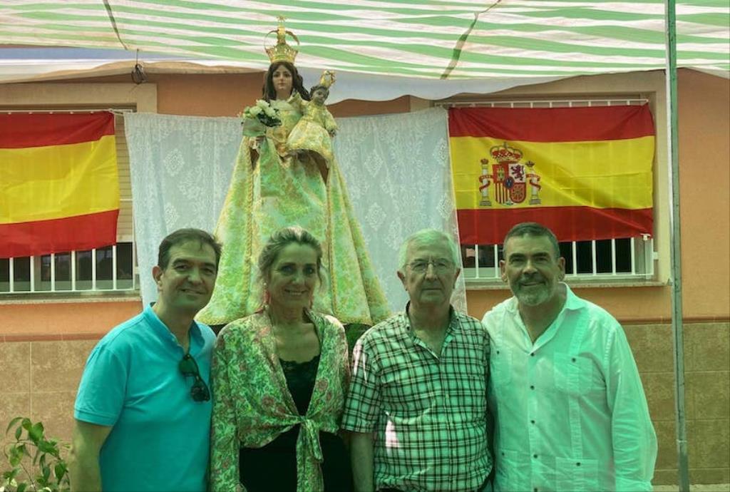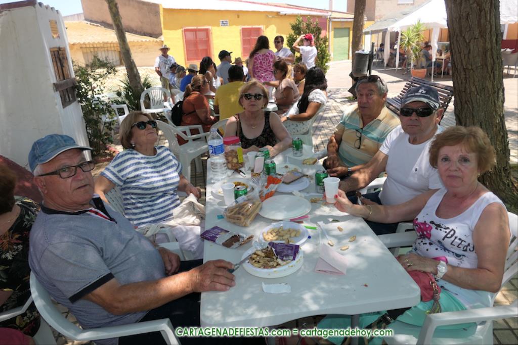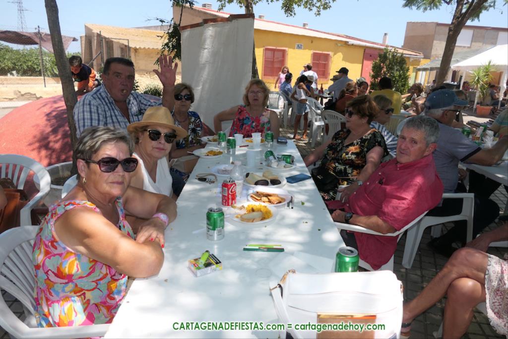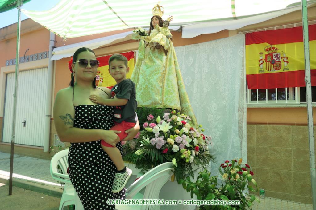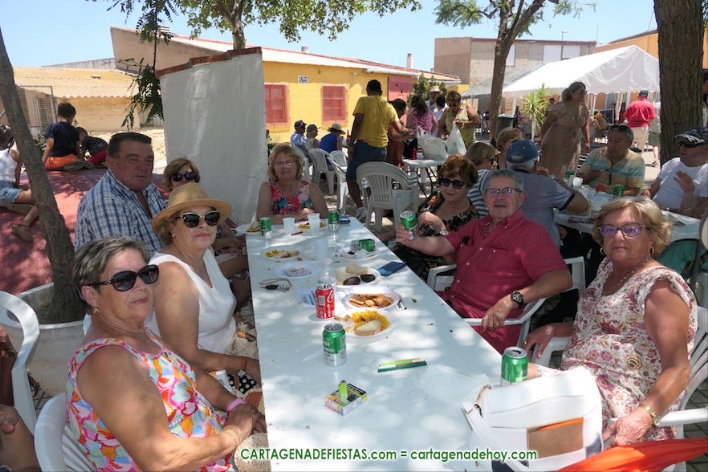 El domingo fue el día grande con la presencia de la Virgen, quien salió de la iglesia de La Guía en romería hacia la plaza del Pozo de los Palos ubicada junto al local de la asociación de vecinos, donde hubo almuerzo con morcillas, empanada gigante y 'muy buen rollo', como continuó después con un gigantesco arroz que compartieron de forma gratuita los asistentes, entre los que figuran representantes de Movimiento Ciudadano, entre los que figuraban José López y el edil Enrique Pérez, entre otros, quienes también llevaron a cabo el trayecto desde la iglesia hasta la plaza.La cartagenera Almudena Martínez 'Chiqui', popular desde que entró en el televisivo 'Gran hermano' en 2008, montando a caballo