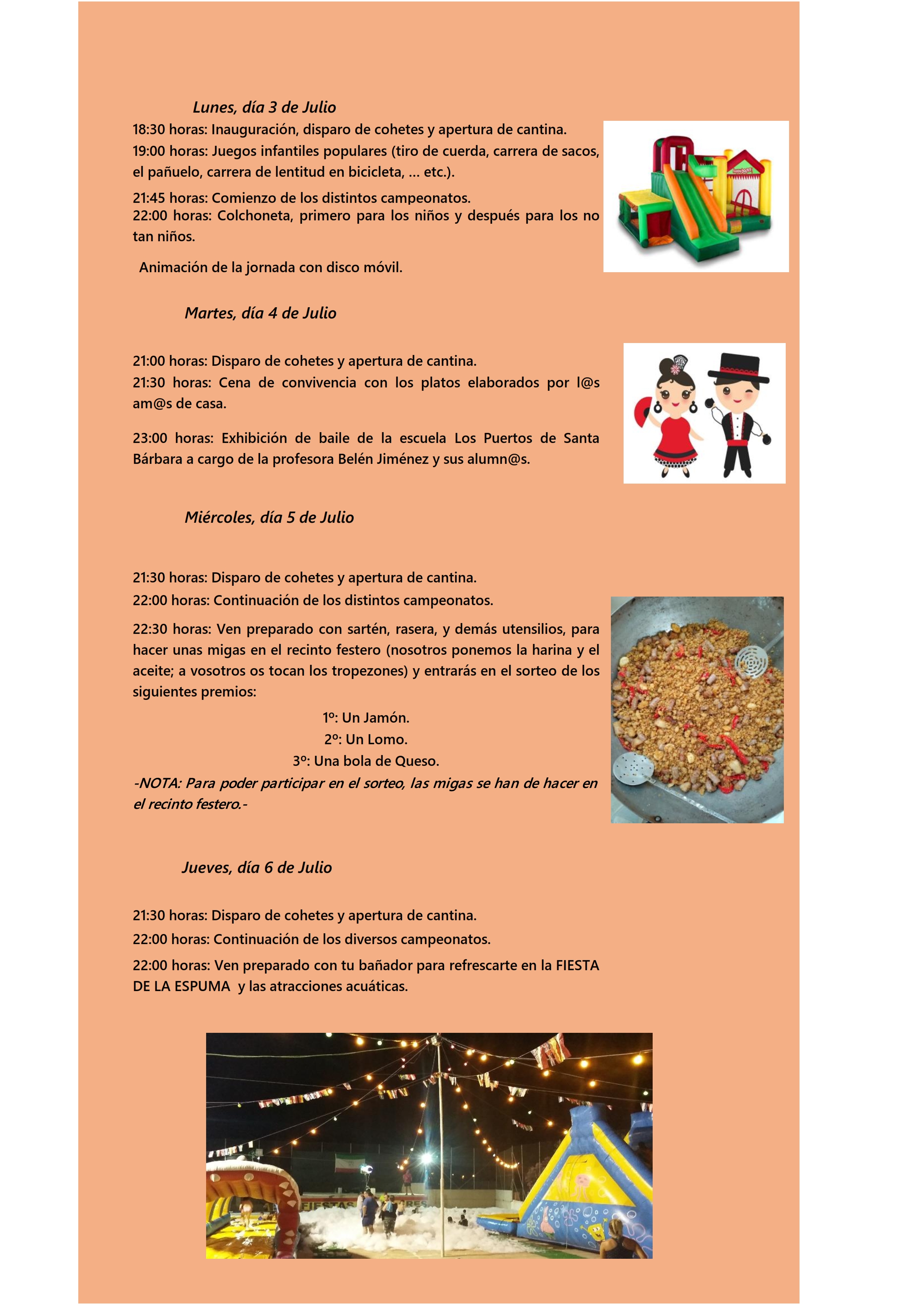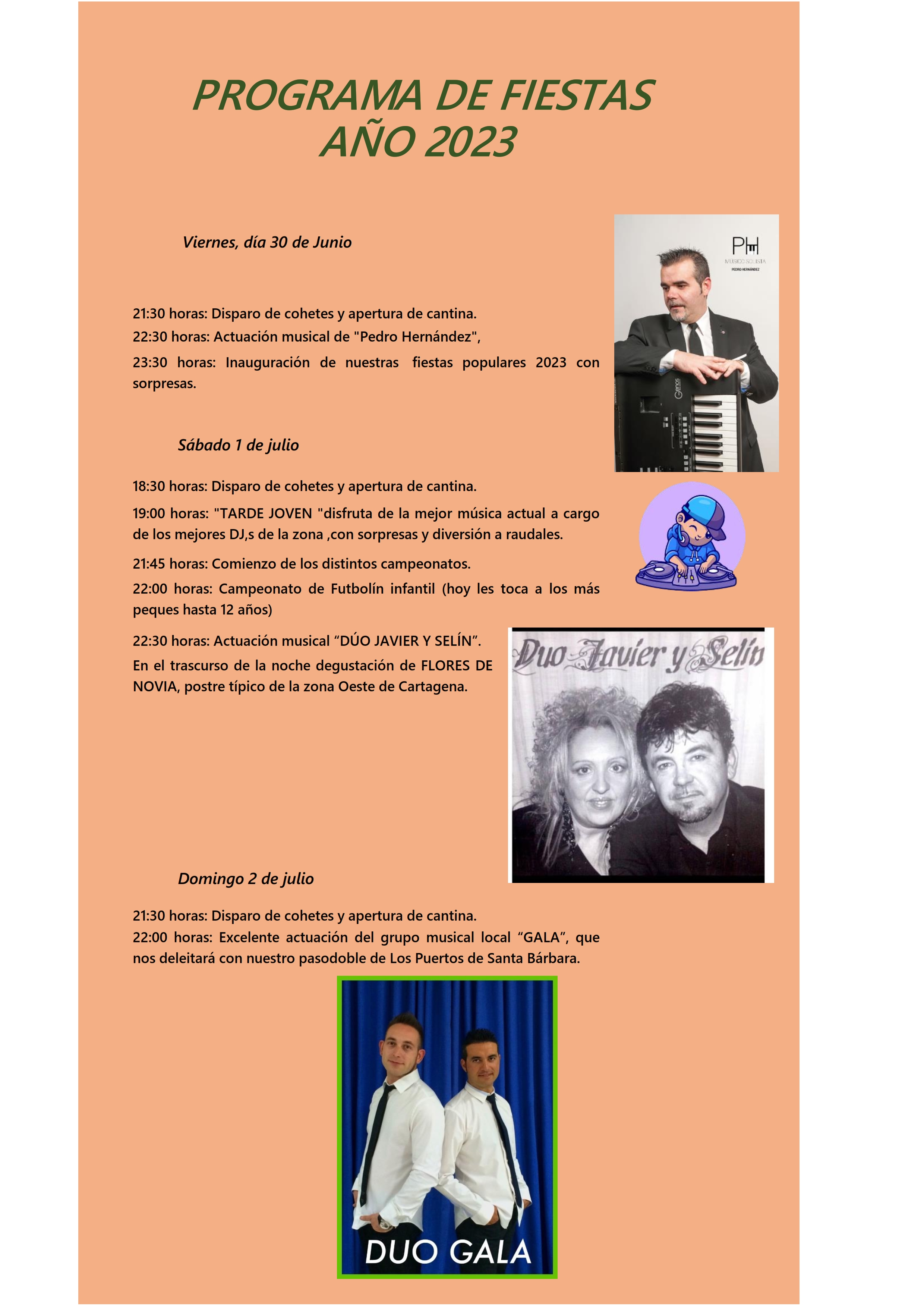 Los festejos que organiza la asociación de vecinos se estrenan hoy con la apertura del recinto festero, la actuación de Pedro Hernández y sorpresas, abriendo un programa que se prolongará hasta el día 9 y que acogerá, entre otros alicientes, variada música en directo, exhibición de tangos y concurso de baile, noche de migas y, entre otros, degustaciones de flores de novia, pan con sobrasada y chocolate de bollos.