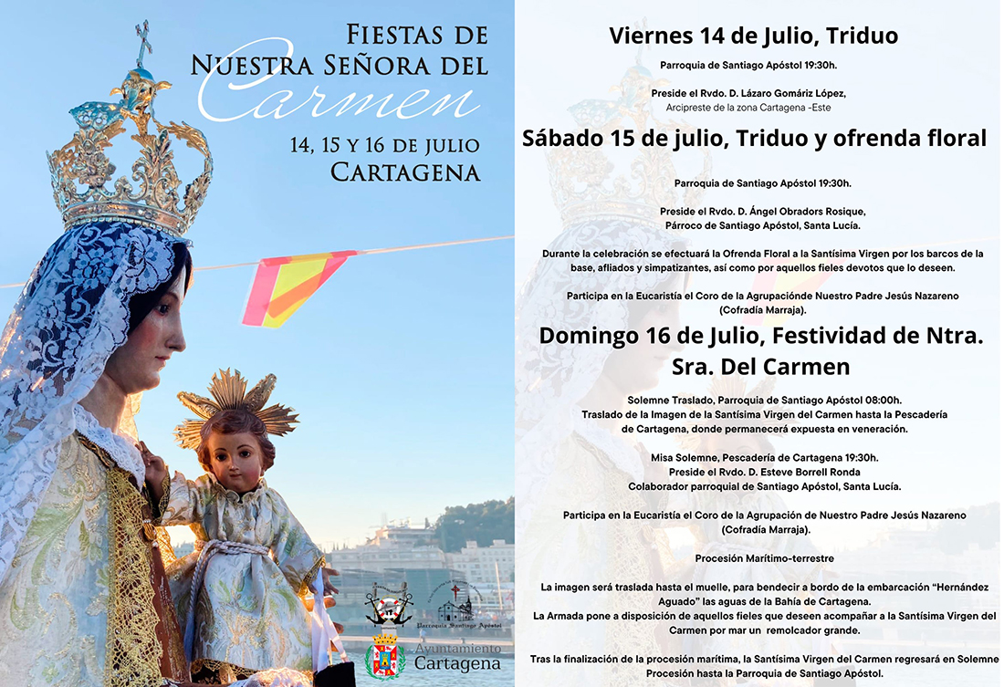 Las fiestas en honor a Nuestra Señora del Carmen tienen lugar esta próxima semana con actividades organizadas por diversas entidades, correspondiendo el capítulo marítimo a la Cofradía de Pescadores y a la parroquia de Santiago Apóstol, en colaboración del Ayuntamiento de Cartagena, que tendrá lugar del 14 al 16 con actos en la iglesia de Santa Lucía y la salida por mar de la imagen el domingo, con sendas procesiones terrestres antes y después.