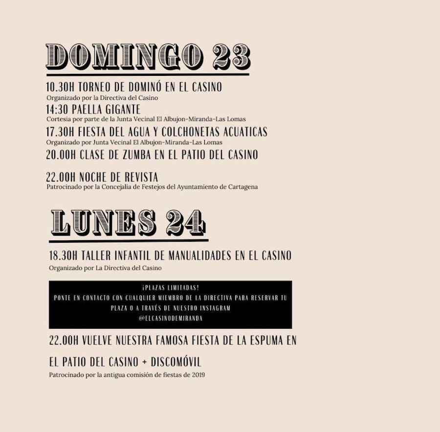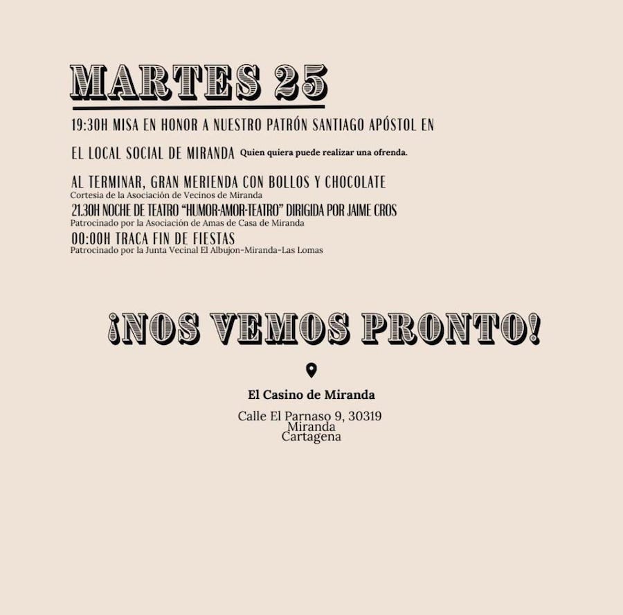 El revitalizado e histórico centro cultural del pueblo será la sede de los festejos patronales que se desarrollarán del 21 al 25 de julio, día del patrón, Santiago Apóstol. El programa ofrece noches de migas, arroz gigante, atracciones infantiles, revista musical, fiestas del agua y de la espuma, torneo de dominó, zumba, teatro de humor, etc.