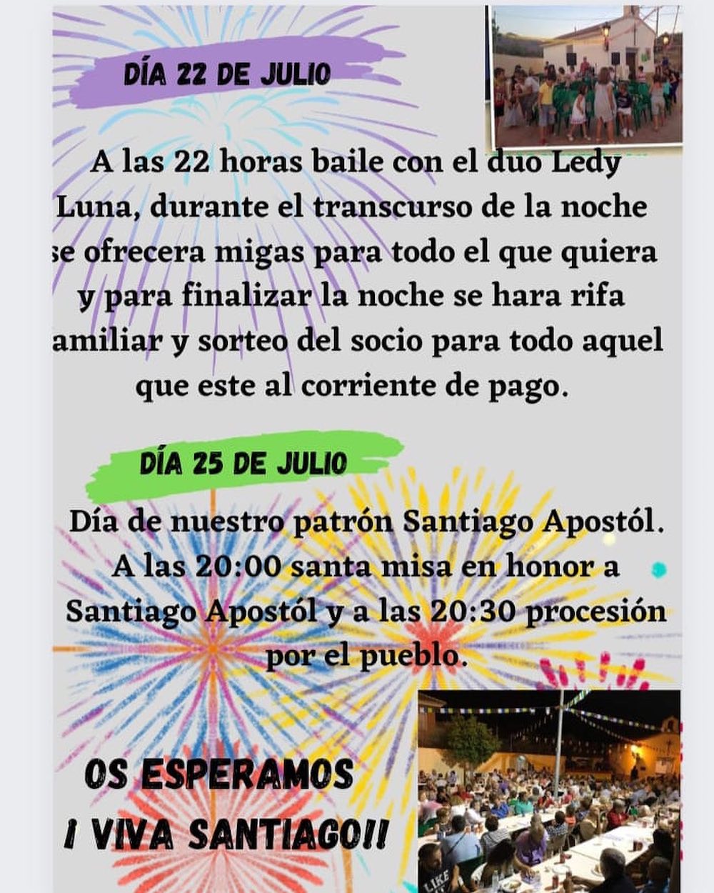 La Junta Vecinal y el Ayuntamiento organizan dos días de fiestas con motivo de la festividad del patrón. El sábado hay baile con el dúo 'Ledy Luna' con degustación gratuita de migas para los asistentes. El martes, festividad del apóstol, habrá misa y procesión por el pueblo.