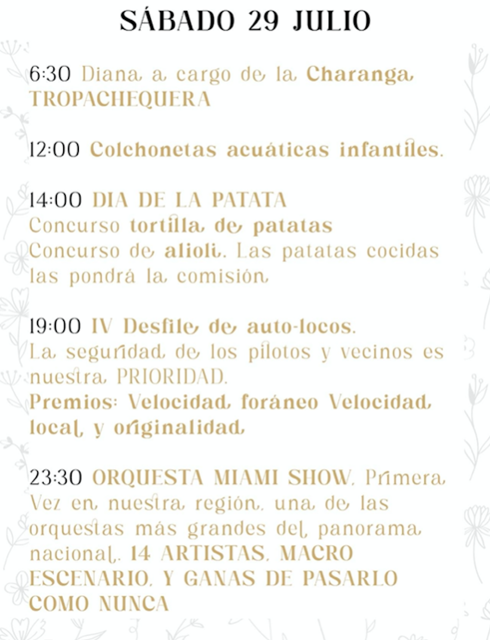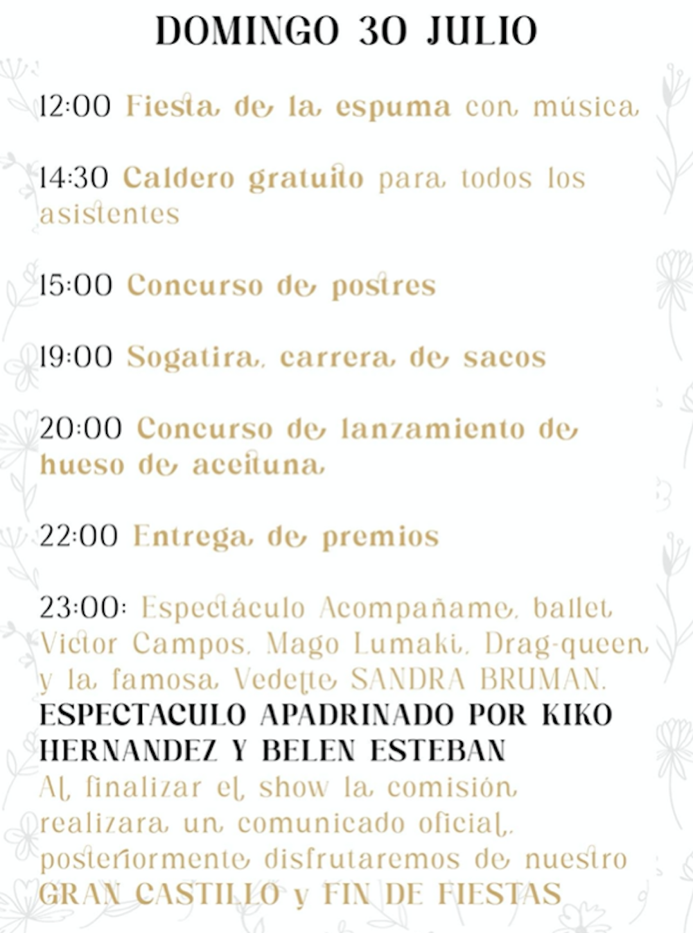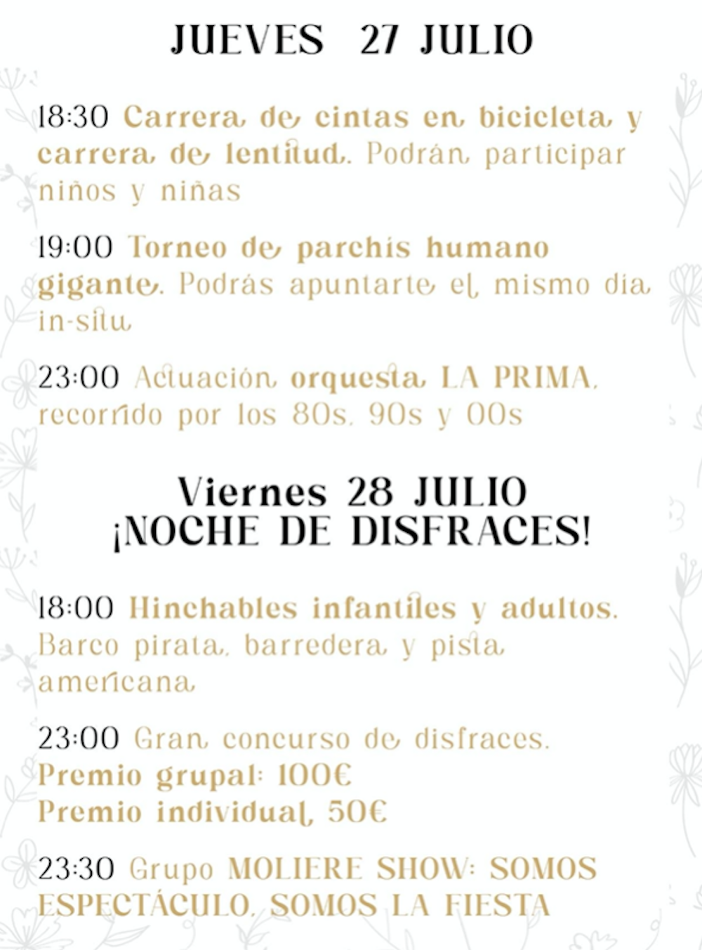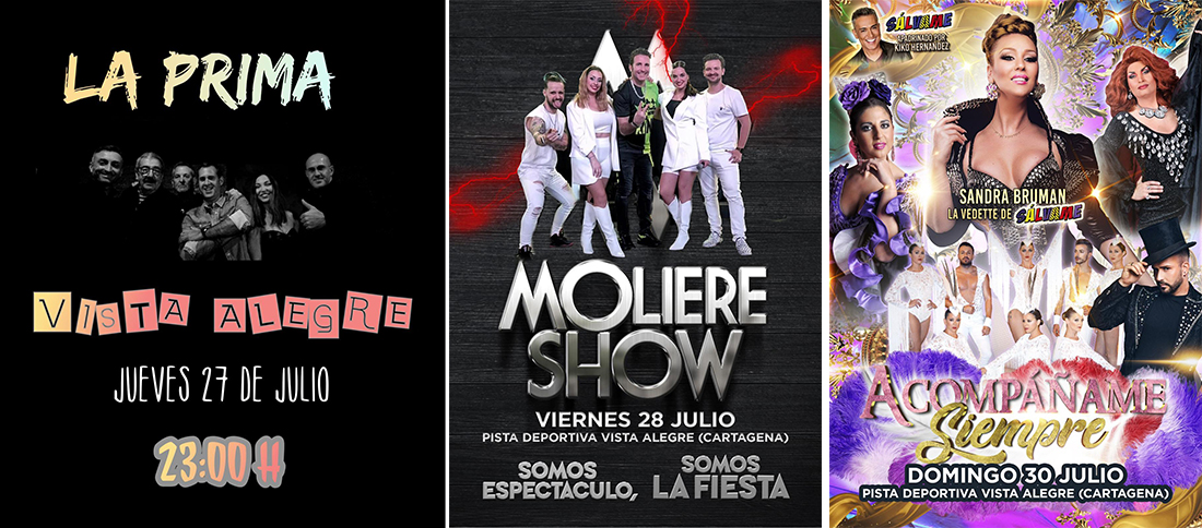 Los festejos se celebran del 26 al 30 de este mes, aunque el martes hay una convivencia vecinal prefiestas. Después, además del pregón y de la proclamación de la corte de honor, hay parchís humano gigante, caldero gratuito, autos locos, concursos de tortillas, de postres, de sogatira, lanzamiento de hueso de aceituna y de disfraces y, entre otras propuestas, las actuaciones de 'La prima', 'Moliere Show' y la primera actuación en la Región de Mruicia de 'Orquesta Miami Show' con 14 artistas en un macroescenario, además de revista con mago, ballet, drag-queen y la vedette Sandra Bruman.