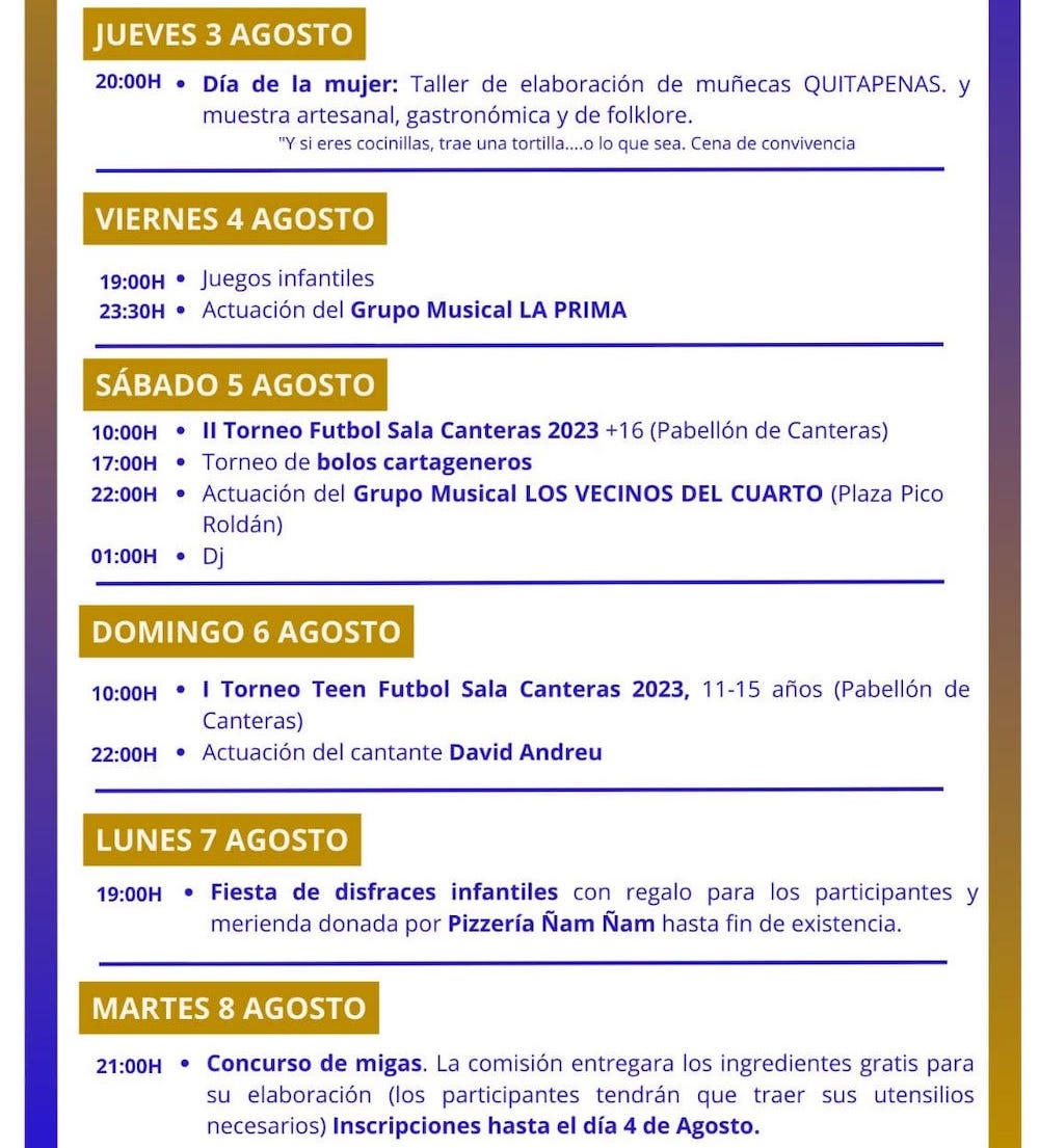 Los festejos patronales de Canteras comenzaron el pasado viernes con el pregón de José Ramón Llorca y se prolongarán hasta el día 15 de agosto. En ese primer fin de semana presentó como novedad la celebración de una carrera de autos locos en la calurosa tarde del domingo, la cual contó con 13 vehículos y cientos de espectadores, resultando un éxito el estreno. Las fiestas continúan con propuestas todos los días, destacando de este próximo fin de semana el popular torneo de fútbol sala y las actuaciones de 'La Prima', 'Los vecinos del cuarto' y David Andreu.