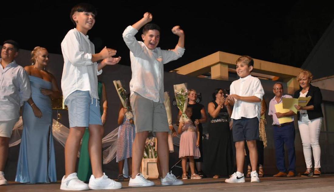 En la imagen superior se observa, con los brazos alzados, a Darío, míster de las fiestas de este año en el acto de elección celebrado el pasado sábado. Junto a él están Bryan y Mario, quienes fueron elegidos como míster simpatía y elegancia, respectivamente. Bajo estas líneas se observa a la reina infantil, Noelia, junto a sus dos damas, y a continuación posan Pablo (míster juvenil) y Natalia (reina juvenil).