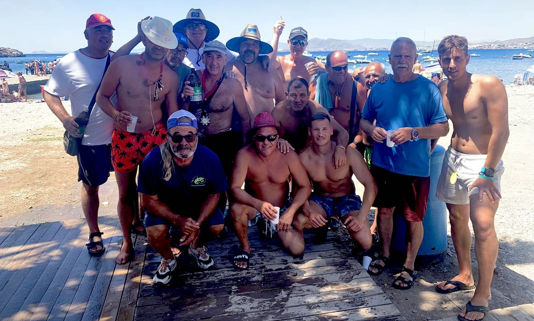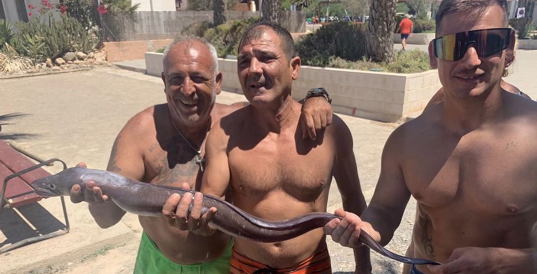 La foto muestra a los ganadores del concurso de pesca con embarcación de las fiestas de La Azohía con la pieza (anguila) que les ha valido para conseguir la victoria en el concurso celebrado esta mañana. En la otra imagen posan los participantes del campeonato.