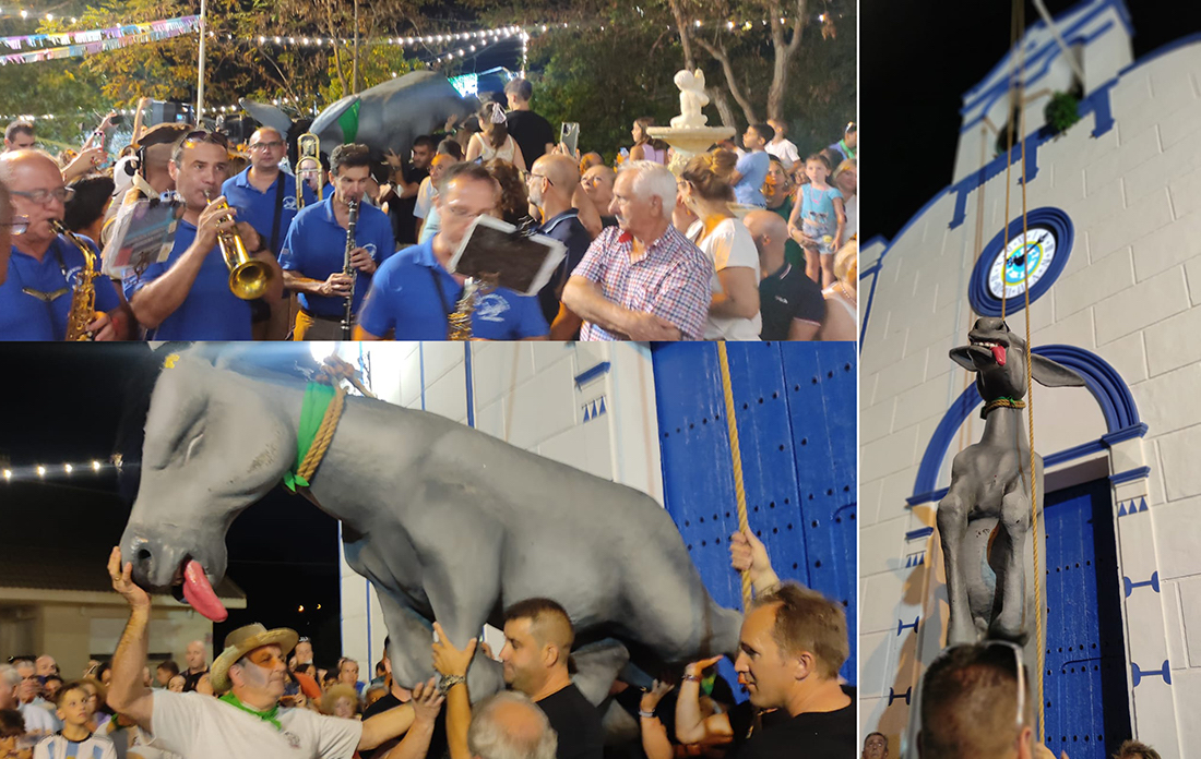 Ha salido una mata de cerrajón en la torre de la iglesia, ¿cómo la quitamos? A partir de esta hipotética frase se forma la leyenda del burro de Perín, pueblo donde cada año se representa este popular relato con la reunión de las ‘mentes pensantes’ para adoptar una decisión, lo que tuvo lugar la jornada anterior, y la subida del animal, lo que se lleva a cabo el primer sábado de agosto. Como es obvio, no hay burro ‘de verdad’, sino un muñeco réplica que antes de ese esperado momento ha participado en el desfile de carrozas, para después ser llevado hacia el campanario con la Agrupación Musical ‘Cartagena 1990’ abriendo paso con su música entre la multitud.