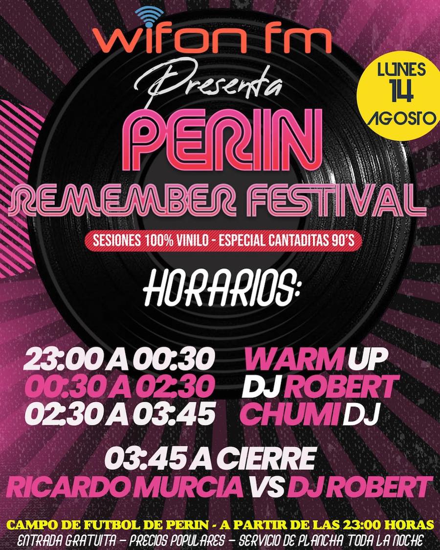 Las fiestas perineras ofrecen esta noche, desde las 23 horas en el campo de fútbol, un festival de recuerdos musicales con 'cantaditas 90's' a cargo de los djs WarmUp, Robert, Chumi, Ricardo Murcia y Robert en cuyas sesiones utilizarán sólo discos de vinilo. Entrada gratuita y servicio de plancha toda la noche. En la foto, la noche festera con la actuación de 'La Prima'.