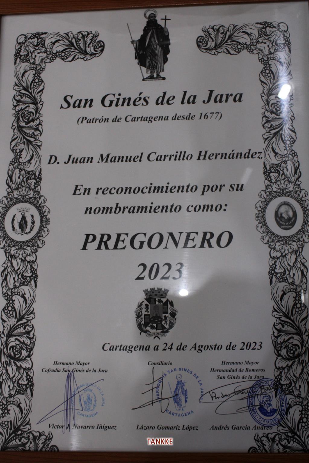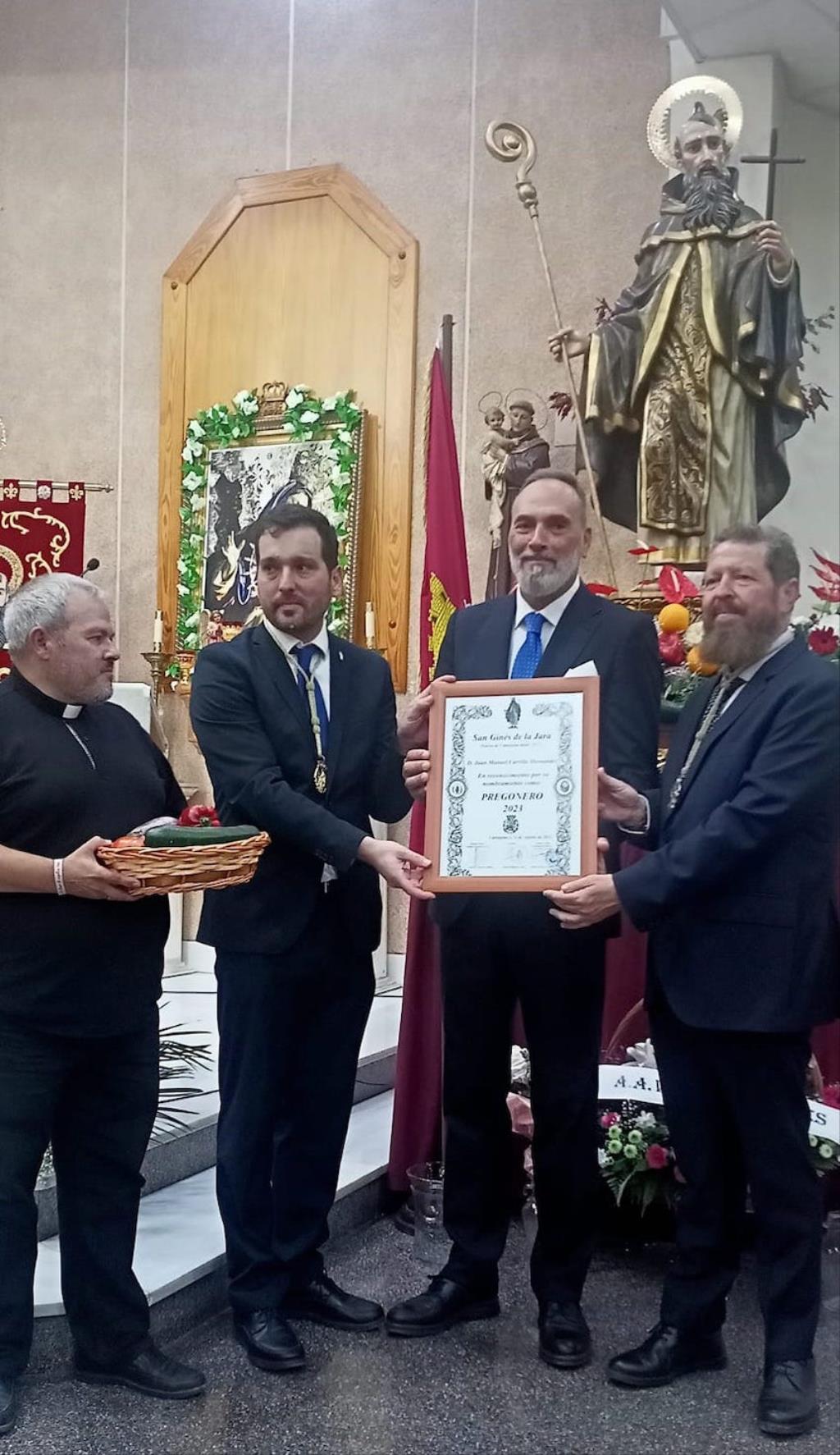 Juan Manuel Carrillo ha sido el pregonero de la celebración este año de San Ginés de la Jara. Hermano mayor de la Archicofradía de Nuestra Señora del Carmen y vinculado al Jesús de la Divina Misericordia ('Cristo del Lago'), es una persona amante de la ciudad de Cartagena, cuyos sentimientos también se han visto potenciados como amante fervoroso de San Ginés de la Jara, al que ayer tuvo el honor de pregonar, estando a la altura del evento. Fue una oratoria breve, estando centrada en la historia del santo ermitaño, con lo que en todo momento mantuvo el interés de los asistentes, entre los que se encontraban autoridades civiles y militares, bastantes romeros, representantes de la Semana Santa, madrina, directivos de la asociación de vecinos, la reina de las fiestas populares y, entre otros, numerosos amigos.