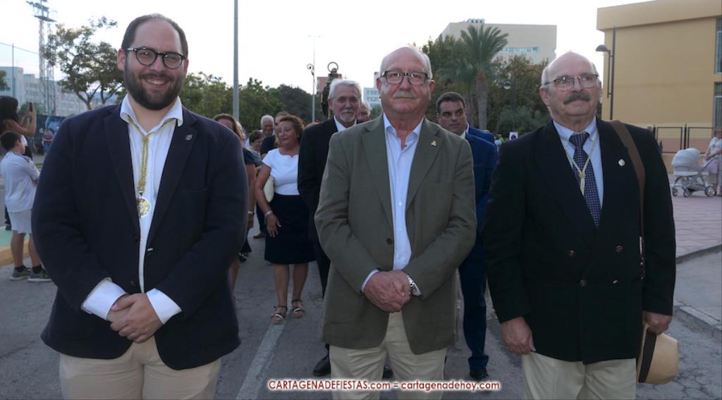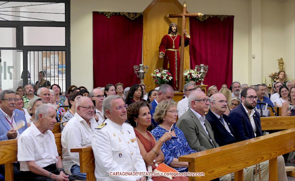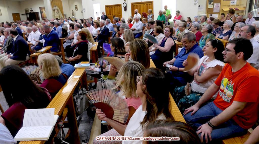 El interior de la iglesia de San Ginés de la Jara está climatizado, pero no se nota cuando hay tanta gente como ayer se dio cita para asistir a la eucaristía del día del patrono de Cartagena, por lo que muchos tuvieron que recurrir a los abanicos, además de ventiladores, como el ubicado en el altar. Ahora, si con calor hay tanta gente, es evidente que este patrón tiene tirón, tanto por atraer a devotos en general como a representantes de instituciones y colectivos religiosos. Así, pudieron verse a ediles del equipo de gobierno (PP) y de los partidos MC y Vox, además de mandos militares y altos cargos de las cofradías pasionarias de los californios, resucitados y del Socorro, junto a la Asociación Canónica del Cristo de la Divina Misericordia, Cartagena por la Caridad, Hermandad de Nuestra Soledad del Calvario, Orden de Santa María de España, etc. También estaban el pregonero de esta edición y hermano mayor de la Archicofradía de la Virgen del Carmen (Juan Manuel Carrillo), la madrina de los romeros (Pilar Giménez) y la reina de las fiestas, entre otros, como el presidente de la junta vecinal de La Aparecida-La Puebla y romero, José Manuel Ayaso.