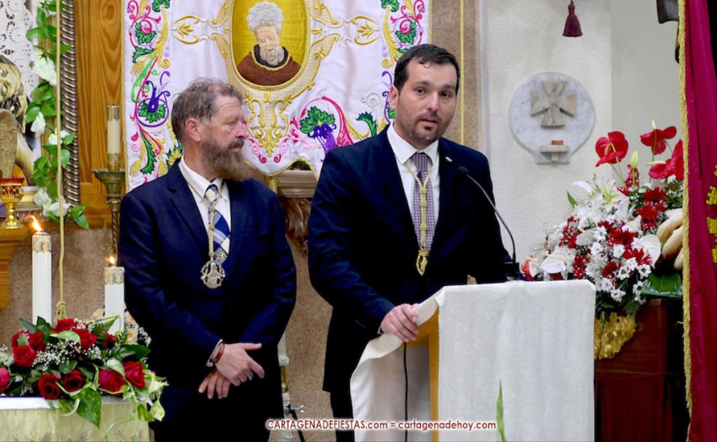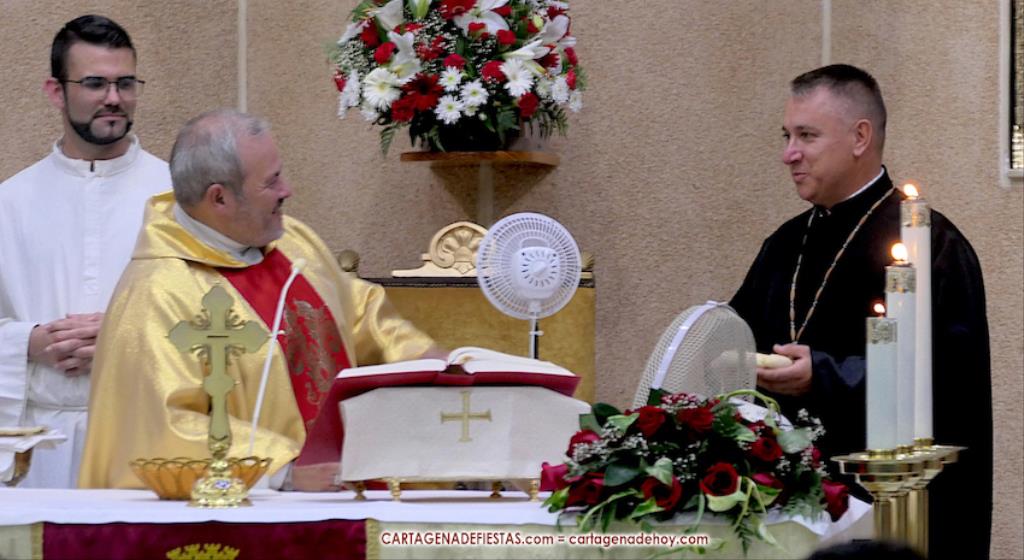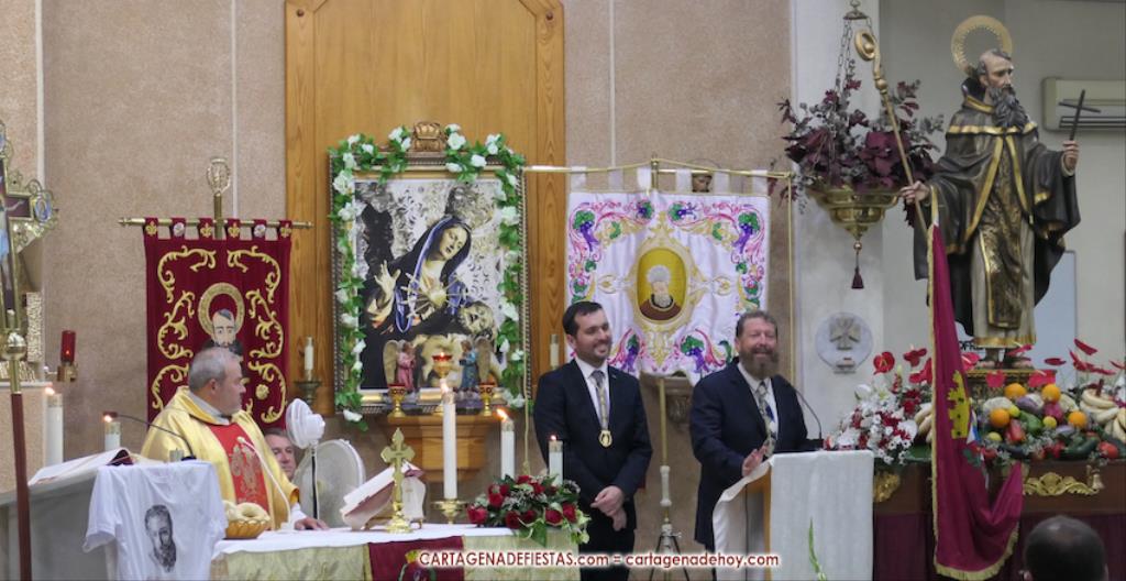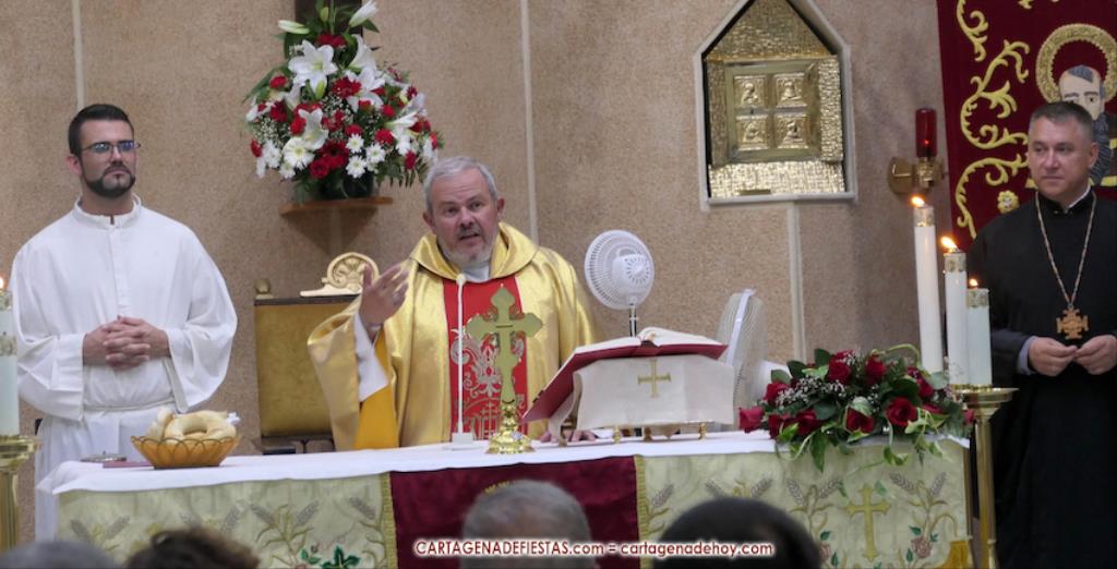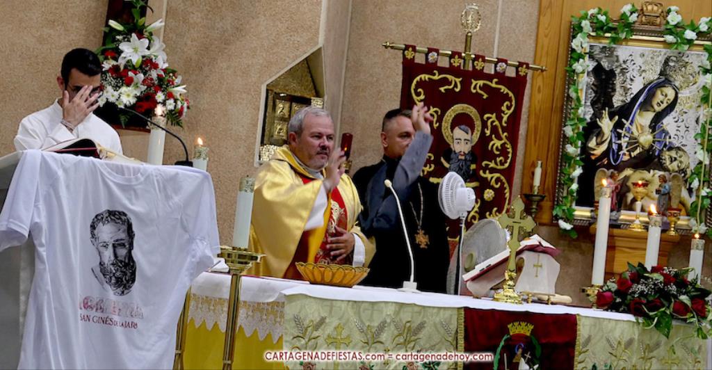 La misa fue celebrada por Lázaro Gomariz, párroco de la barriada y capellán de la cofradía y de la hermandad de romeros que lleva el nombre de San Ginés, junto a Andriy Chornopyskyy, sacerdote del colectivo ucraniano en la comarca. Poco antes de finalizar, el sacerdote español expuso que los panecillos de San Ginés de la Jara potencian sus 'poderes especiales' si se regalan después de comprarlos y anunció que iba a entregar los cuatro que adquirió. Los primeros en recibirlos fueron los ediles Paqui Martínez Sotomayor y Nacho Jáudenes, del Ayuntamiento de Cartagena. Algo les dijo el curo, pero no nos pudimos enterar. Otro fue para animar a las hermanitas de los pobres en su labor de caridad. El tercero tuvo como destino al presidente de la asociación de vecinos, aunque Gomariz se confundía en su exposición con la junta vecinal municipal. Son entes distintos, pues uno surge desde los vecinos y el otro lo pone el consistorio. Pidió por luchar por mejoras en la barriada que sean útiles, apuntando que por el carril-bici no ve a ciclista alguno, pero que sí ha servido para perder aparcamientos en la zona. El último fue para Andriy Chornopyskyy con el deseo de que acabe la guerra en Rusia y Ucrania, recibiendo una ovación del público asistente.