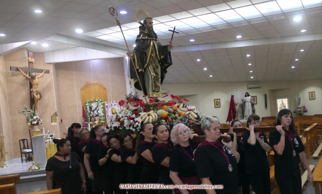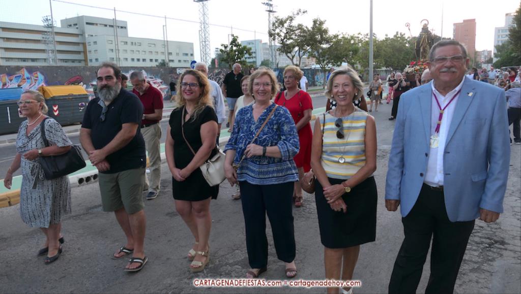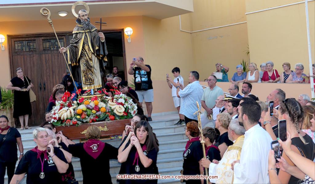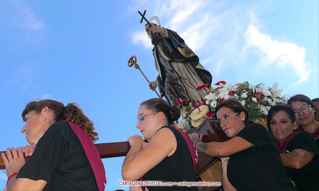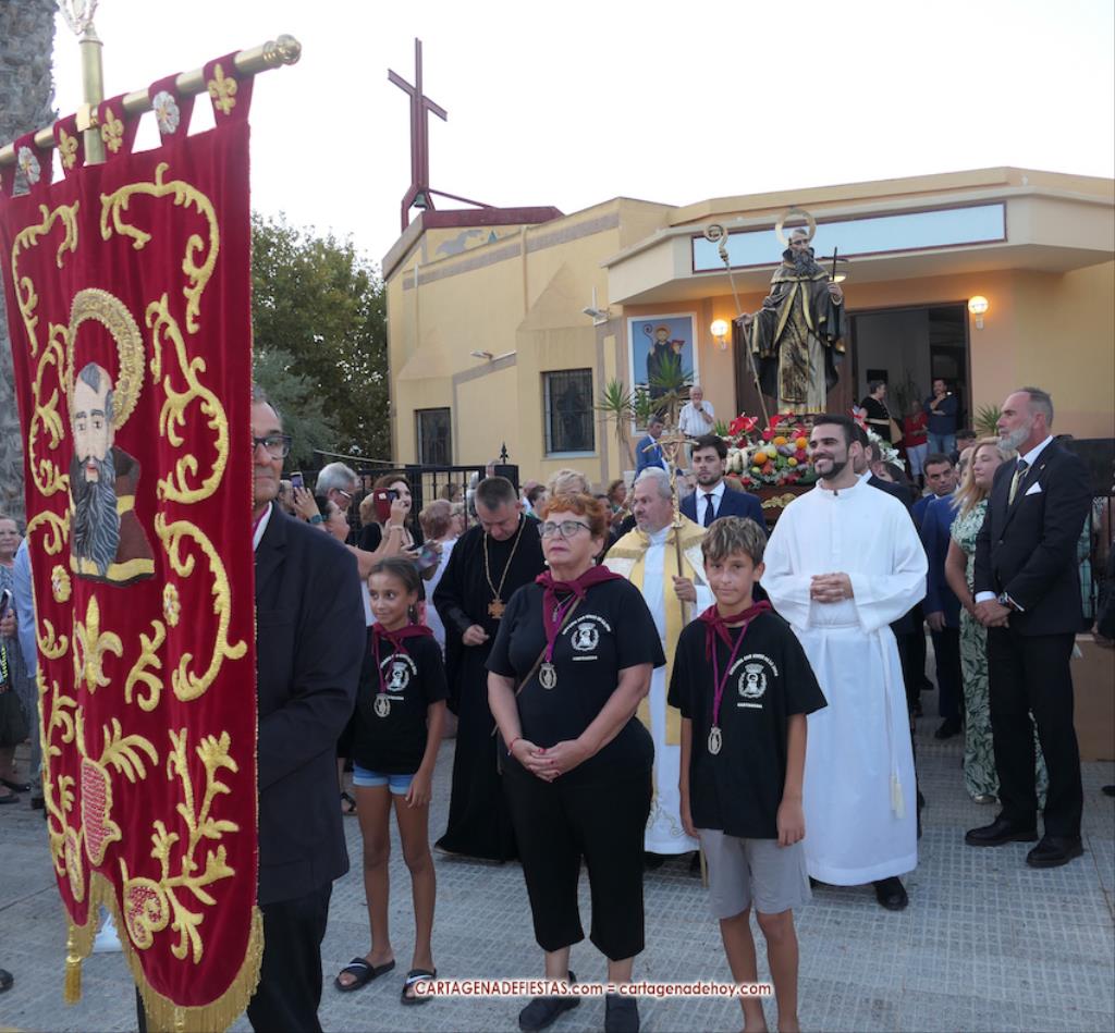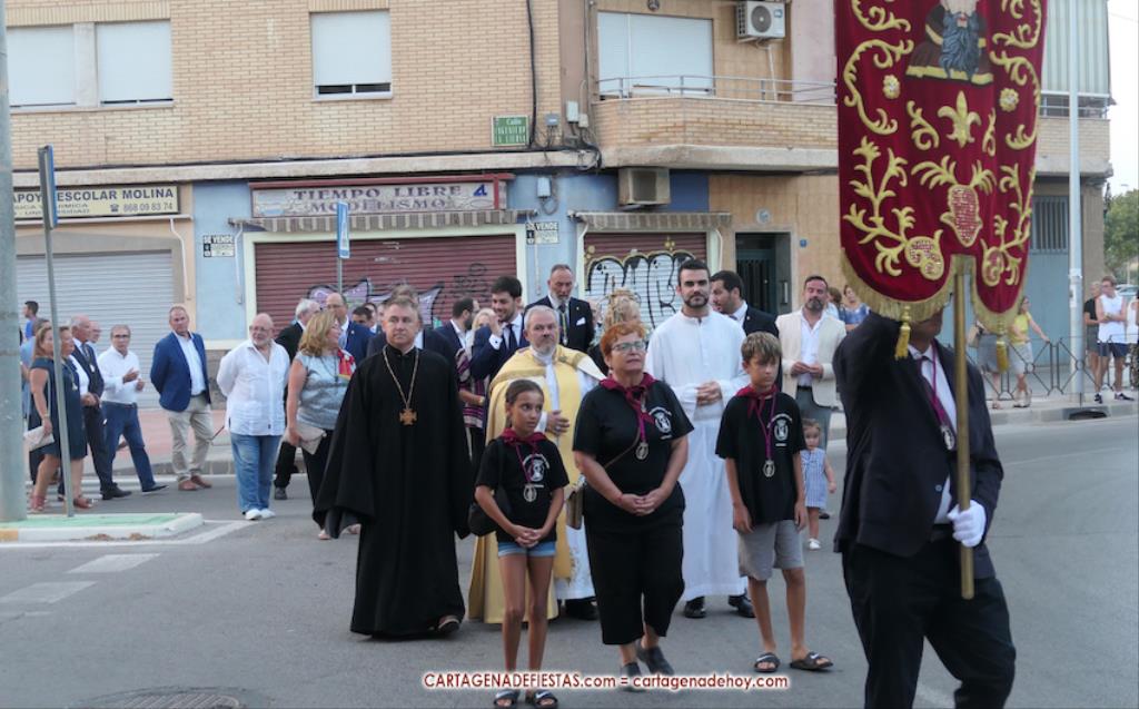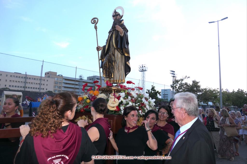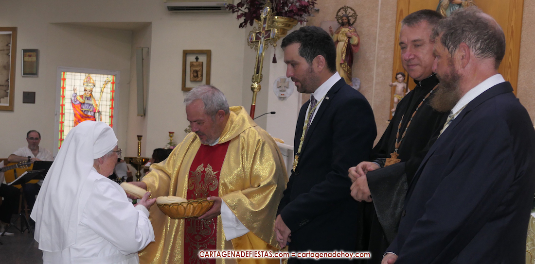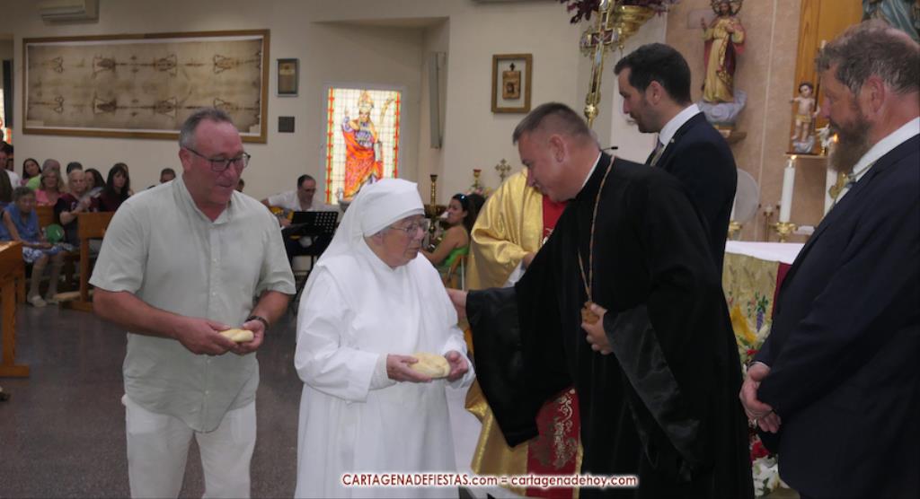 El patrono de Cartagena volvió a salir en procesión por las calles del entorno de su barriada después de una eucaristía con aforo desbordado en la que el sacerdote Lázaro Gomariz regaló cuatro panecillos con mensaje al Ayuntamiento, a las Hermanitas de los Pobres, a la asociación de vecinos y a la comunidad religioso ucraniana.