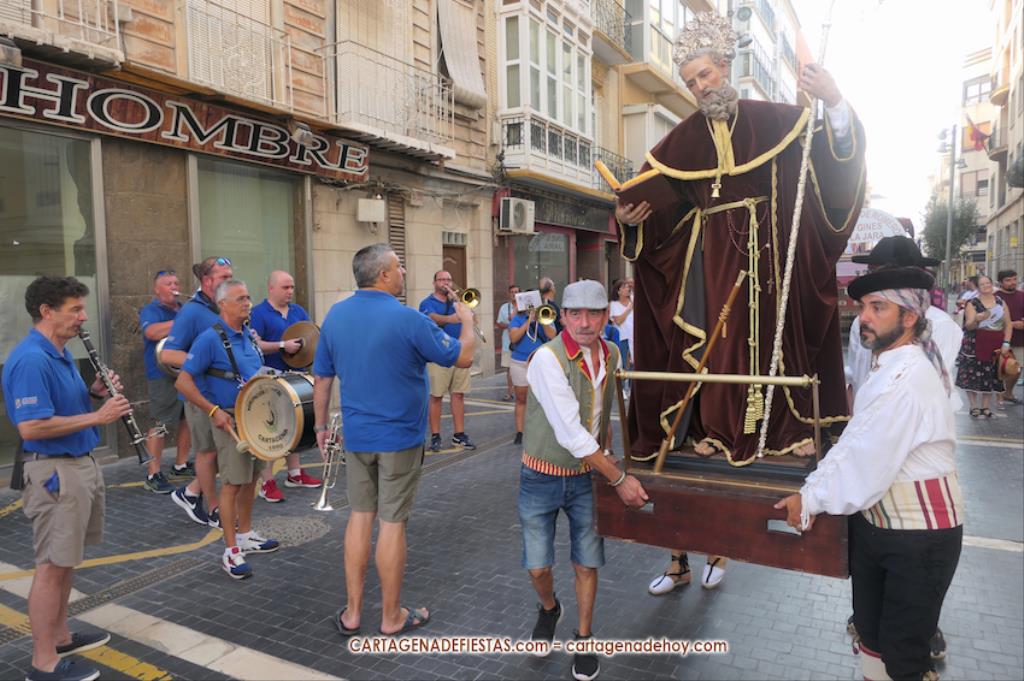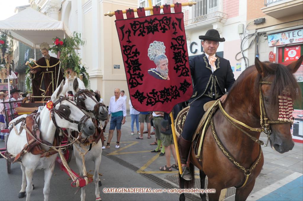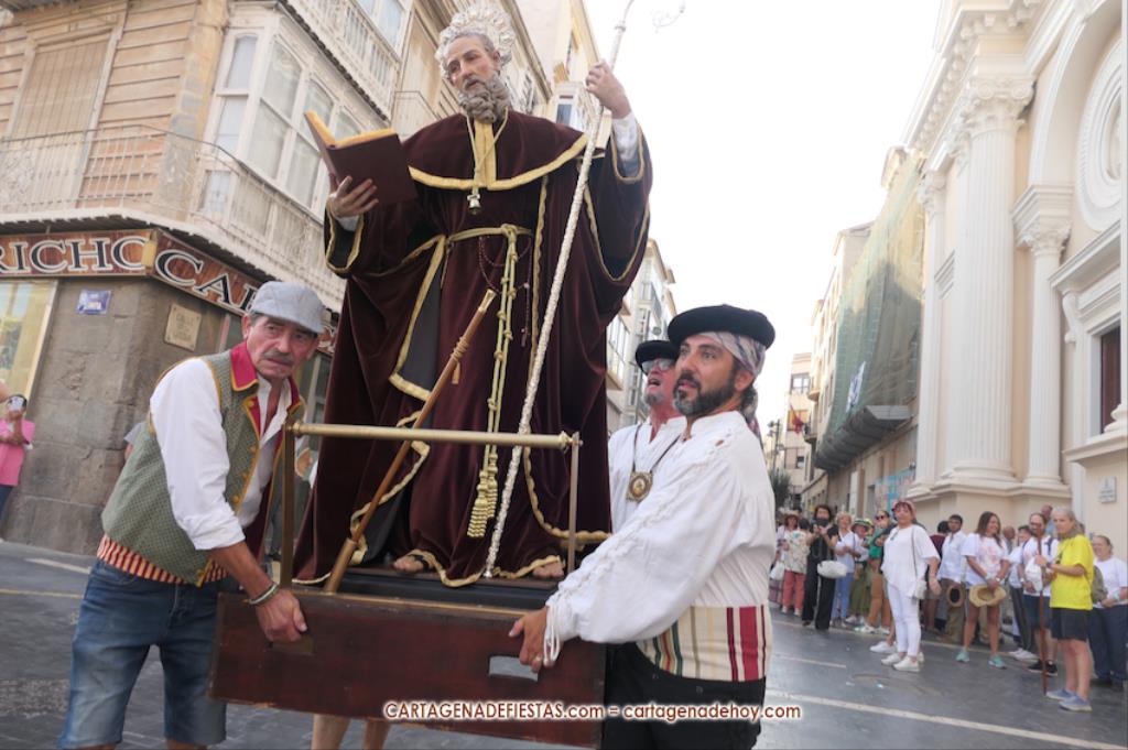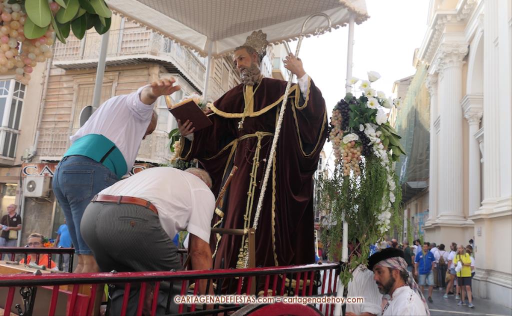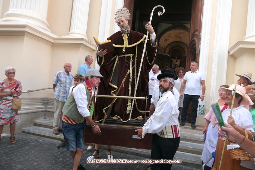 Tras la eucaristía, las palabras del hermano mayor (Andrés García, deseando una buena jornada y dando las gracias al Real y Santo Hospital de Caridad por acceder a que San Ginés salga desde la basílica) y el ‘photocall’ (‘llamada de foto’ es la traducción) de numerosos asistentes junto a la imagen del santo, cuatro romeros han elevado la talla para sacarla al exterior, siendo recibida por aplausos y el himno de España interpretado por la Agrupación Musical ‘Cartagena 1990’. Ha sido colocada la imagen en la galera tirada por dos cuadrúpedos y a las 9.20 horas se ha iniciado la marcha a un ritmo algo fuerte con la alegría del sonido de un pasodoble.