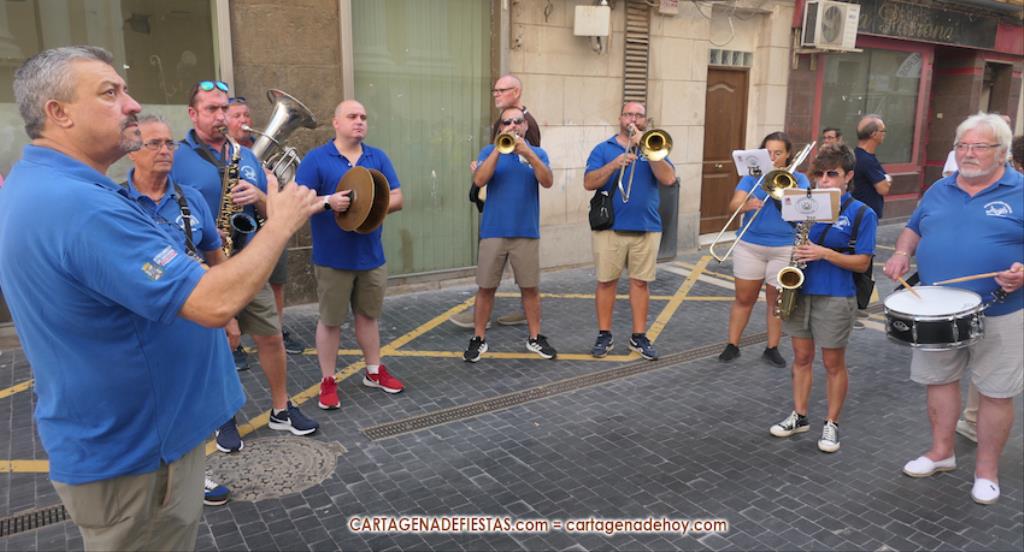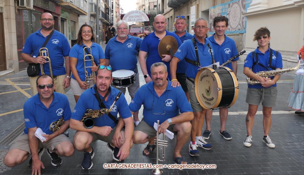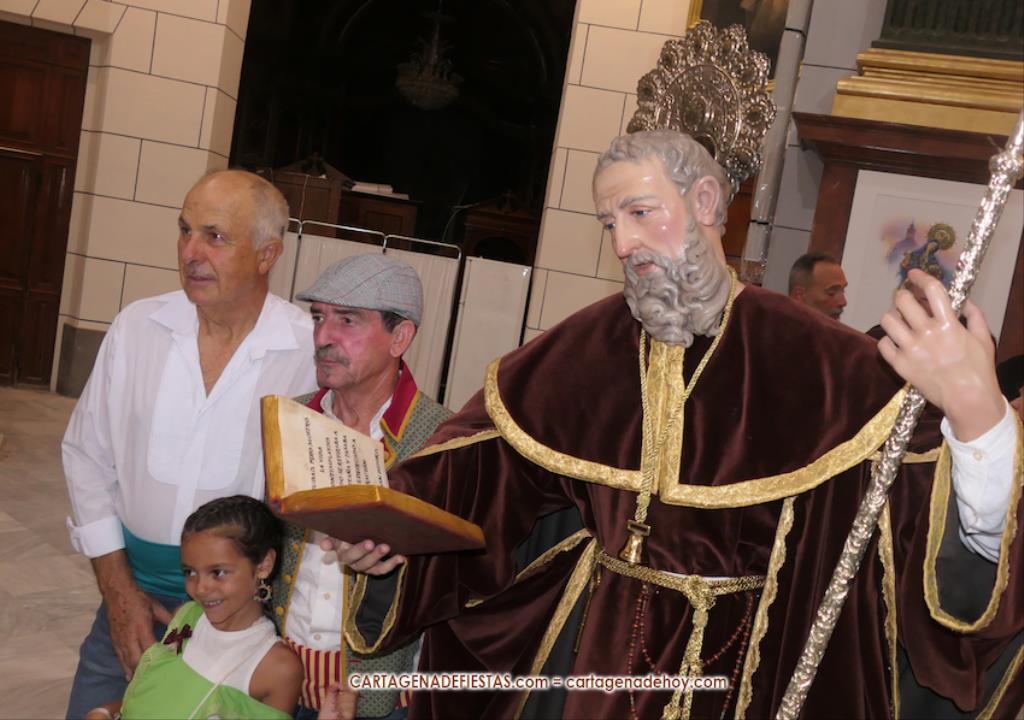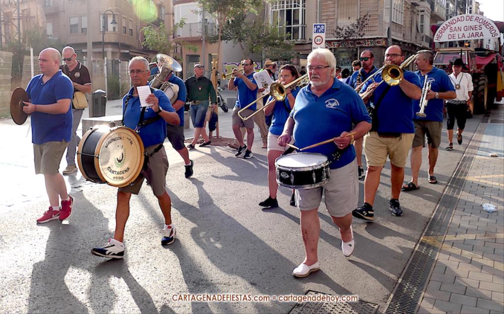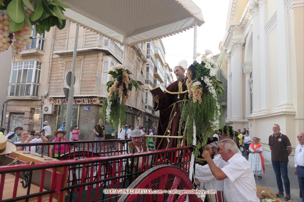 Tras la eucaristía, las palabras del hermano mayor (Andrés García, deseando una buena jornada y dando las gracias al Real y Santo Hospital de Caridad por acceder a que San Ginés salga desde la basílica) y el ‘photocall’ (‘llamada de foto’ es la traducción) de numerosos asistentes junto a la imagen del santo, cuatro romeros han elevado la talla para sacarla al exterior, siendo recibida por aplausos y el himno de España interpretado por la Agrupación Musical ‘Cartagena 1990’. Ha sido colocada la imagen en la galera tirada por dos cuadrúpedos y a las 9.20 horas se ha iniciado la marcha a un ritmo algo fuerte con la alegría del sonido de un pasodoble.