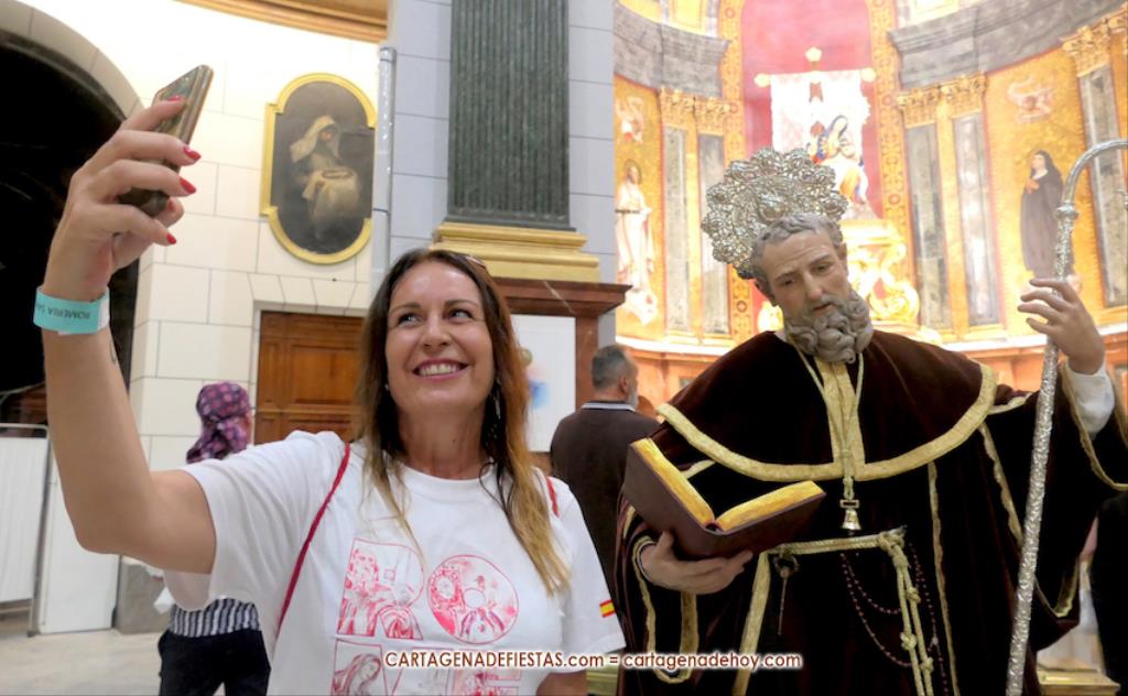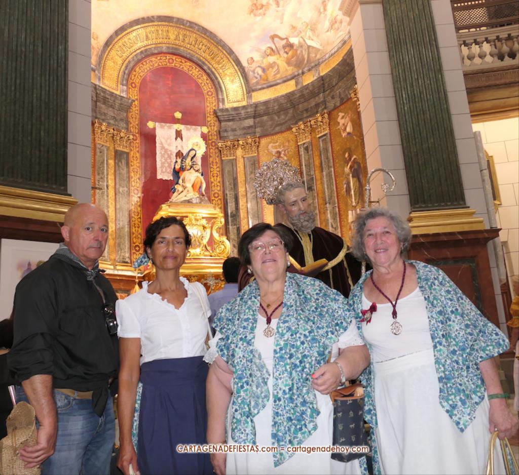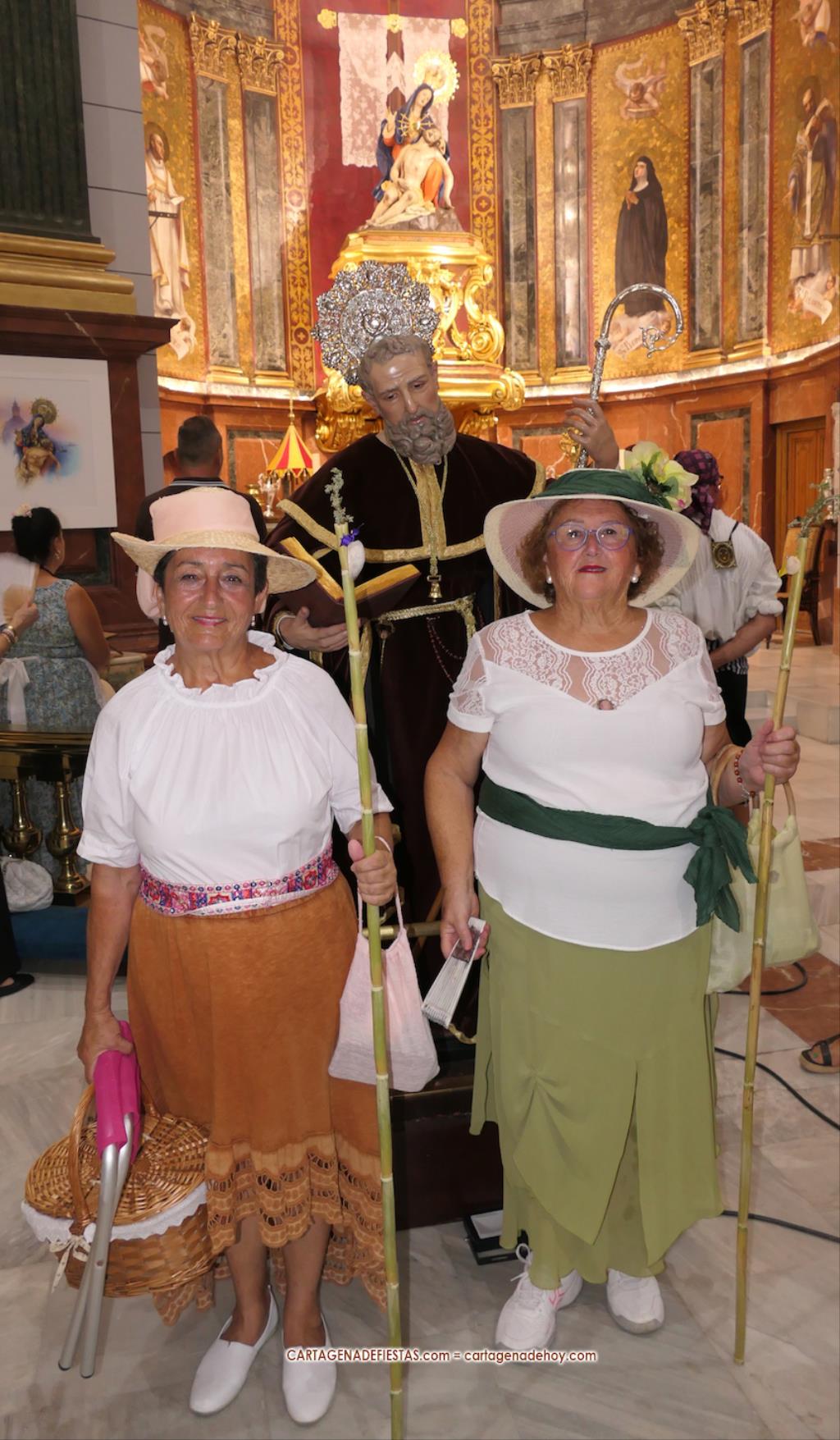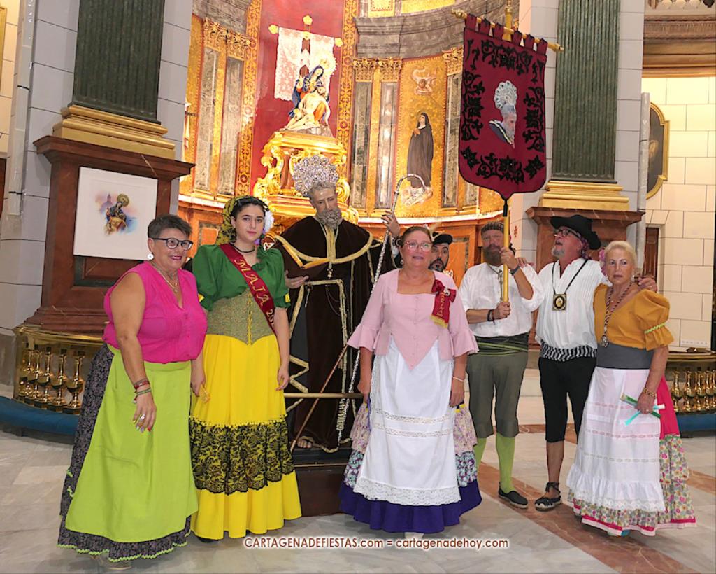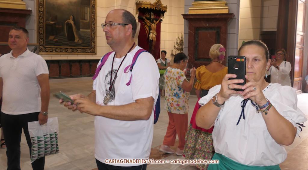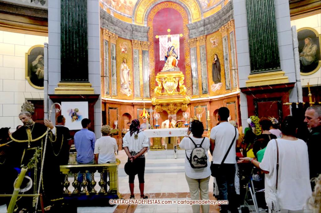 8.30 horas de esta mañana. Una parte de los romeros que participa en la marcha en honor a San Ginés se han concentrado ante la Real Basílica Menor de la Virgen de la Caridad, donde también han acudido cinco plataformas o remolques y algún caballista que participará este señalado día.  Tenía ganas de volver el patrono de Cartagena a la casa de la patrona y por fin ha llegado el momento. La Caridad, que fue colocada hace escasos meses en su lugar de presidir la nave eclesiástica, ha tenido durante tres días al ermitaño de la Jara a sus pies. Hoy se marchaba y lo ha hecho tras la celebración de una misa oficiada por el capellán de la hermandad, Lázaro Gomariz, ante unos asistentes en pie, pues en la iglesia aún no están colocados los bancos. Entre los presentes hemos visto ediles de PP y MC, además de bastantes personas ataviadas con vestuario romero.