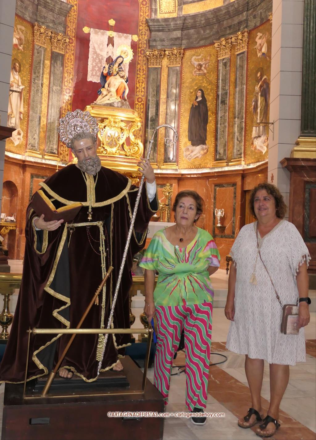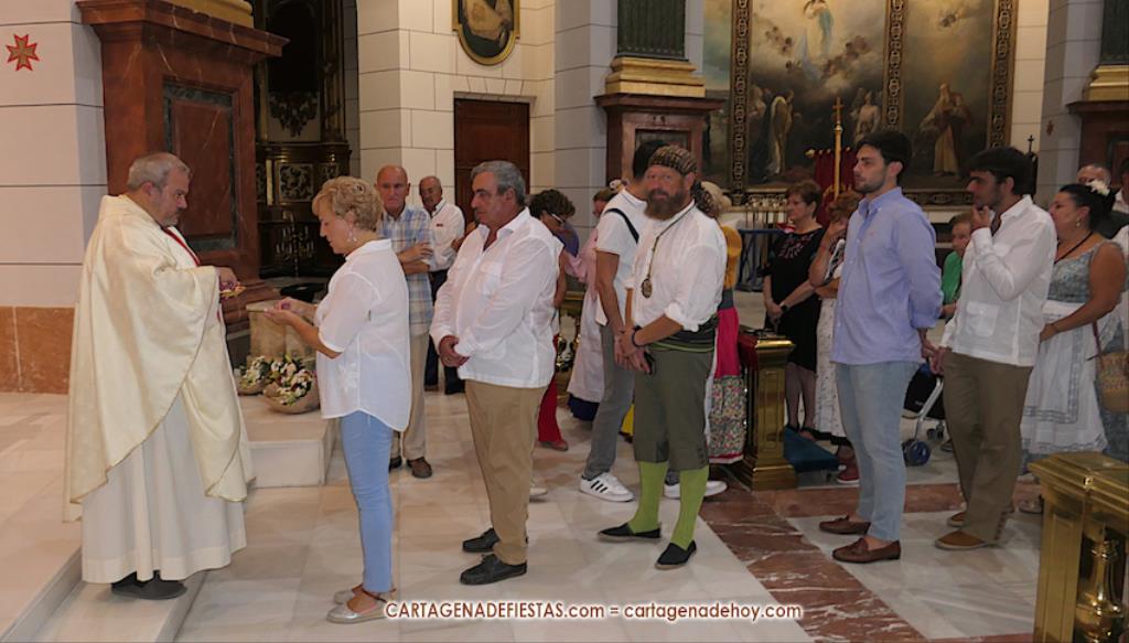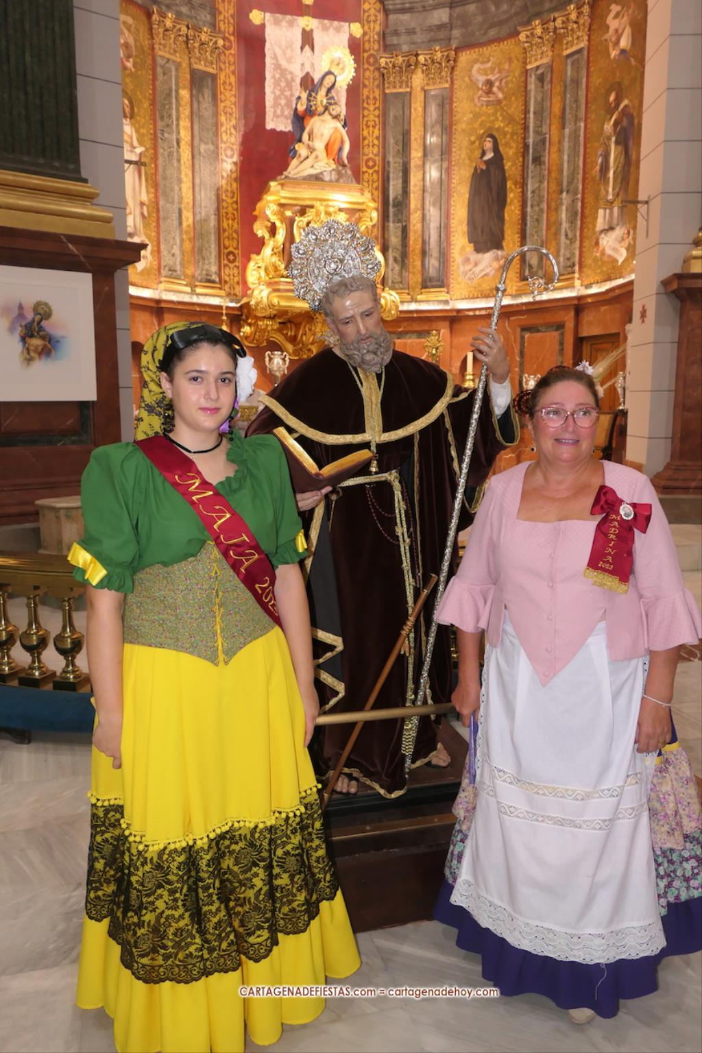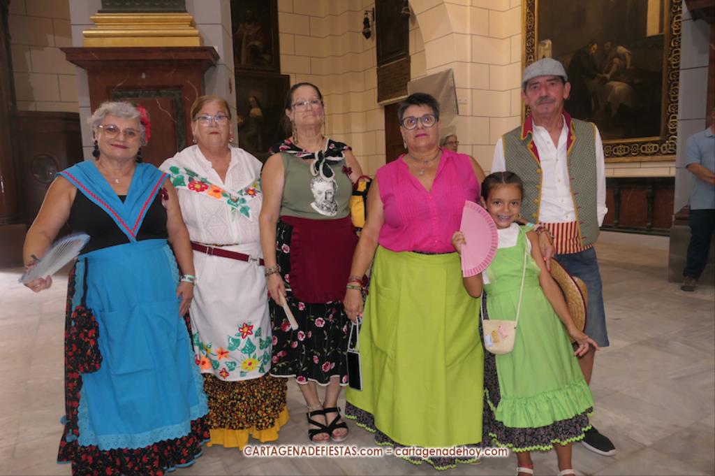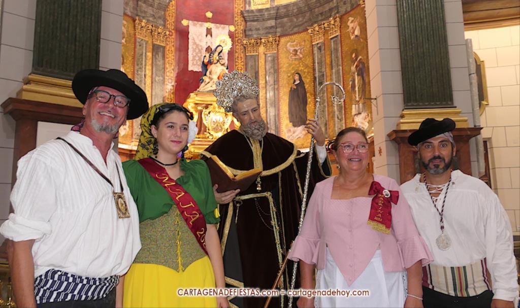 8.30 horas de esta mañana. Una parte de los romeros que participa en la marcha en honor a San Ginés se han concentrado ante la Real Basílica Menor de la Virgen de la Caridad, donde también han acudido cinco plataformas o remolques y algún caballista que participará este señalado día.  Tenía ganas de volver el patrono de Cartagena a la casa de la patrona y por fin ha llegado el momento. La Caridad, que fue colocada hace escasos meses en su lugar de presidir la nave eclesiástica, ha tenido durante tres días al ermitaño de la Jara a sus pies. Hoy se marchaba y lo ha hecho tras la celebración de una misa oficiada por el capellán de la hermandad, Lázaro Gomariz, ante unos asistentes en pie, pues en la iglesia aún no están colocados los bancos. Entre los presentes hemos visto ediles de PP y MC, además de bastantes personas ataviadas con vestuario romero.