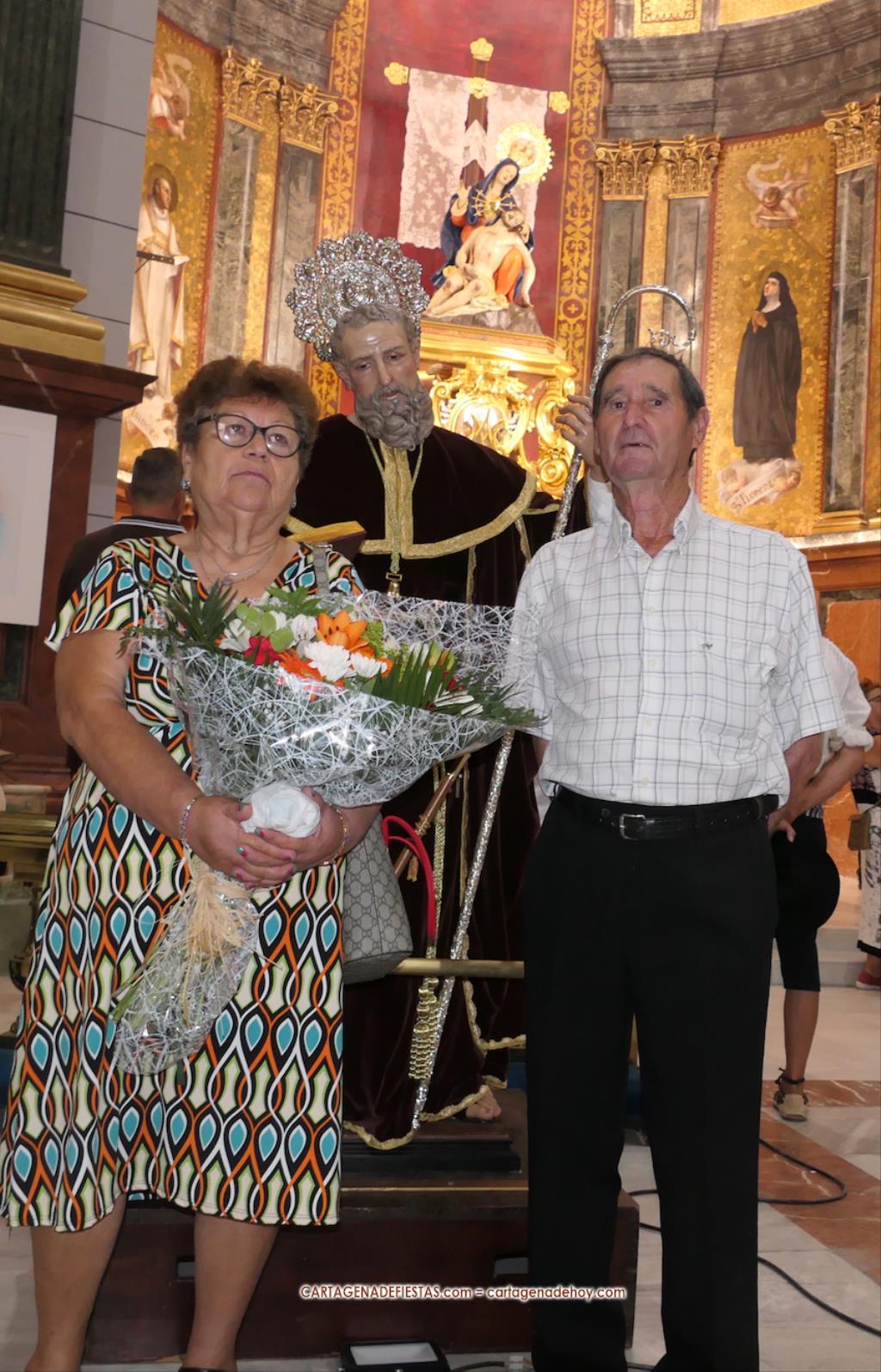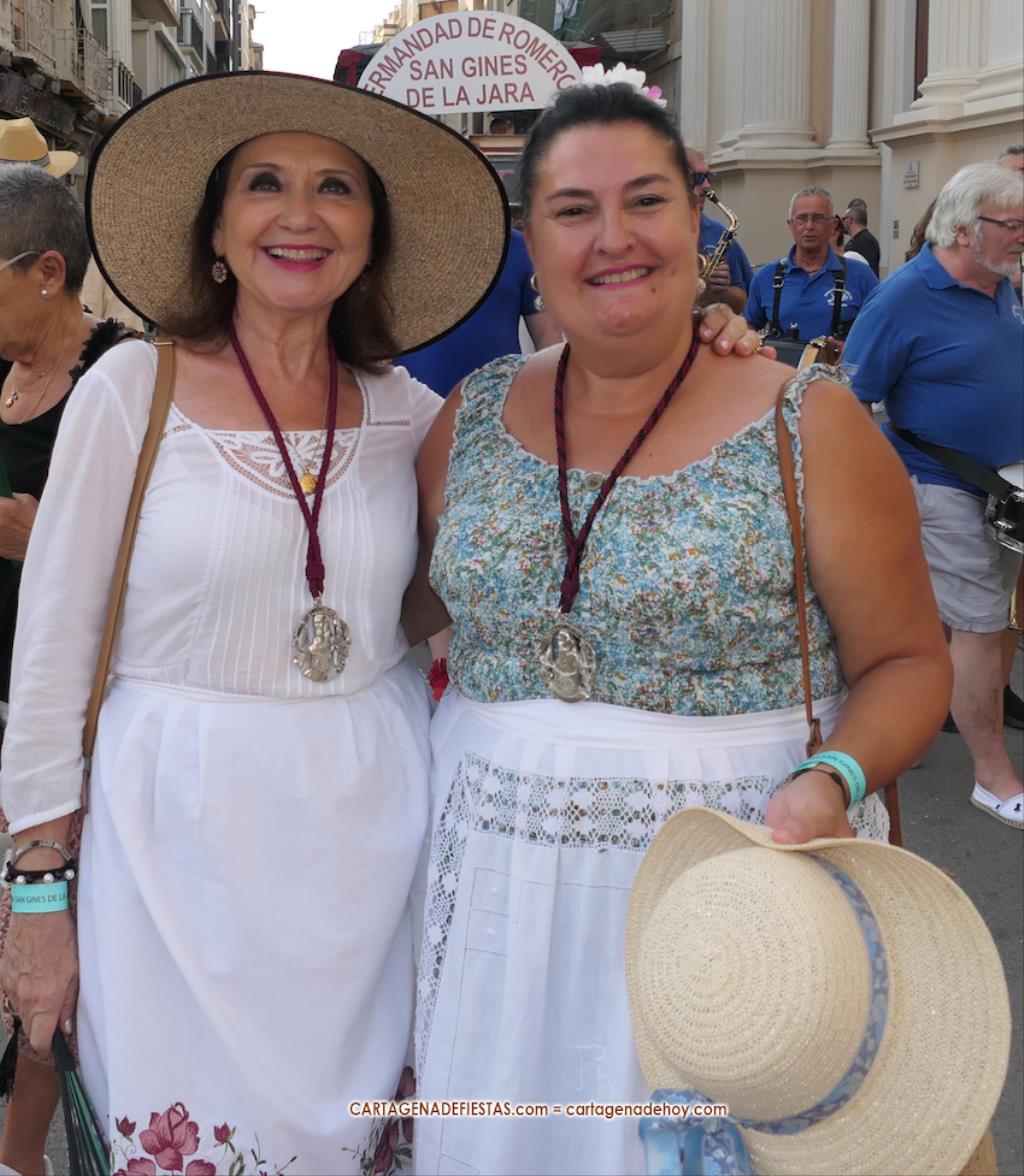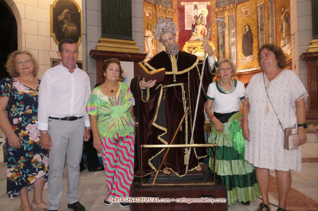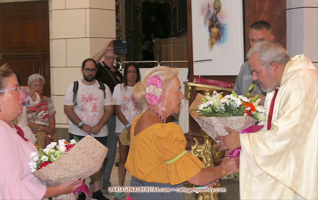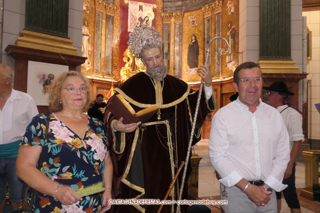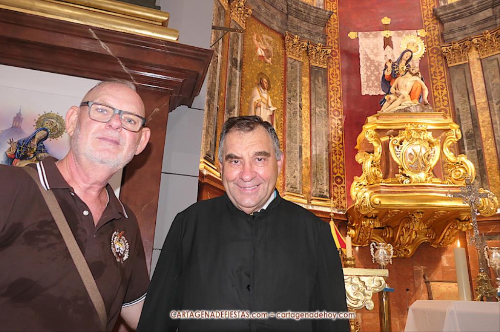 8.30 horas de esta mañana. Una parte de los romeros que participa en la marcha en honor a San Ginés se han concentrado ante la Real Basílica Menor de la Virgen de la Caridad, donde también han acudido cinco plataformas o remolques y algún caballista que participará este señalado día.  Tenía ganas de volver el patrono de Cartagena a la casa de la patrona y por fin ha llegado el momento. La Caridad, que fue colocada hace escasos meses en su lugar de presidir la nave eclesiástica, ha tenido durante tres días al ermitaño de la Jara a sus pies. Hoy se marchaba y lo ha hecho tras la celebración de una misa oficiada por el capellán de la hermandad, Lázaro Gomariz, ante unos asistentes en pie, pues en la iglesia aún no están colocados los bancos. Entre los presentes hemos visto ediles de PP y MC, además de bastantes personas ataviadas con vestuario romero.