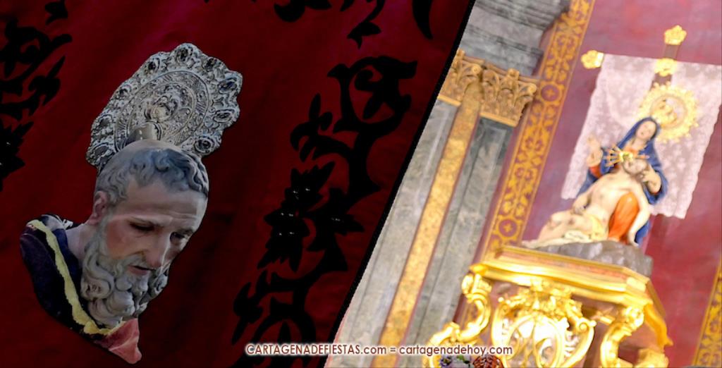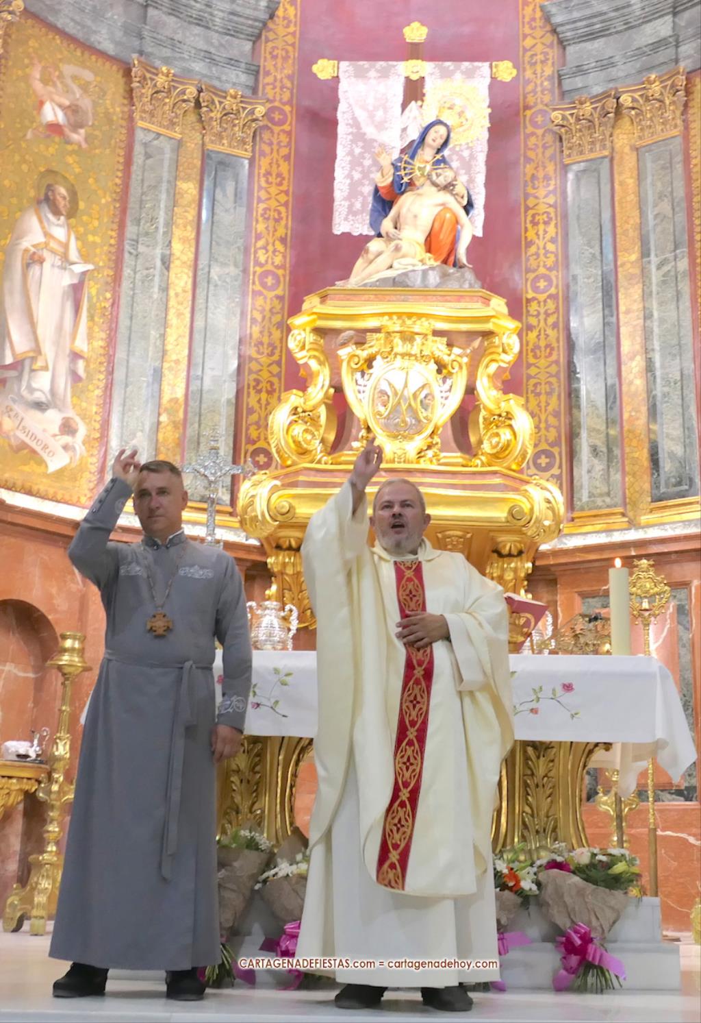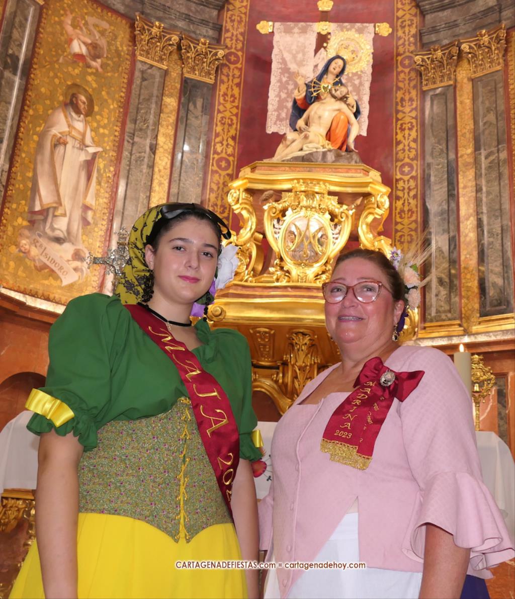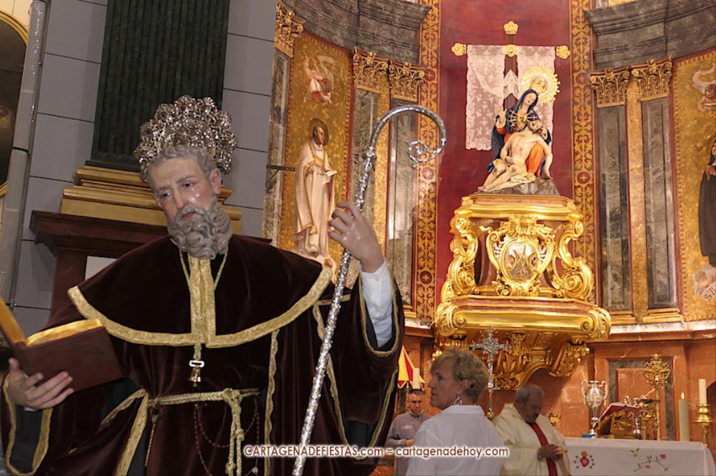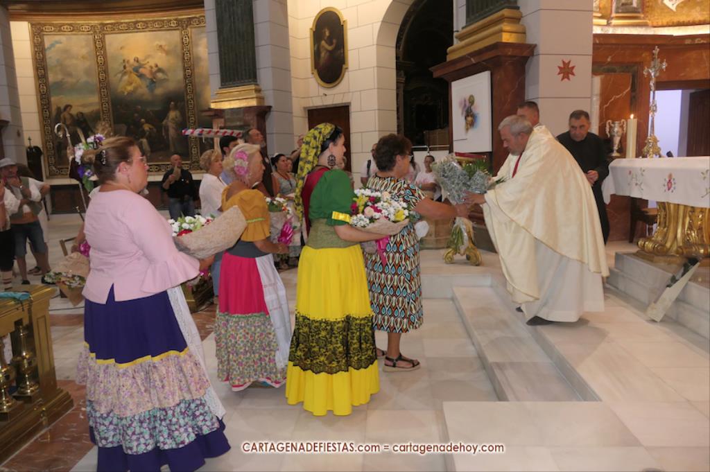 8.30 horas de esta mañana. Una parte de los romeros que participa en la marcha en honor a San Ginés se han concentrado ante la Real Basílica Menor de la Virgen de la Caridad, donde también han acudido cinco plataformas o remolques y algún caballista que participará este señalado día.  Tenía ganas de volver el patrono de Cartagena a la casa de la patrona y por fin ha llegado el momento. La Caridad, que fue colocada hace escasos meses en su lugar de presidir la nave eclesiástica, ha tenido durante tres días al ermitaño de la Jara a sus pies. Hoy se marchaba y lo ha hecho tras la celebración de una misa oficiada por el capellán de la hermandad, Lázaro Gomariz, ante unos asistentes en pie, pues en la iglesia aún no están colocados los bancos. Entre los presentes hemos visto ediles de PP y MC, además de bastantes personas ataviadas con vestuario romero.