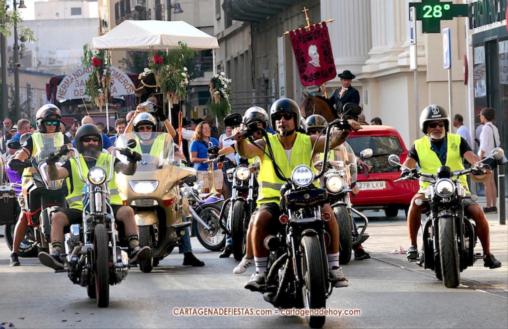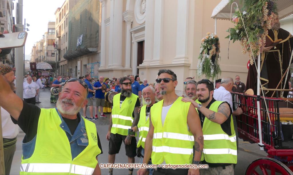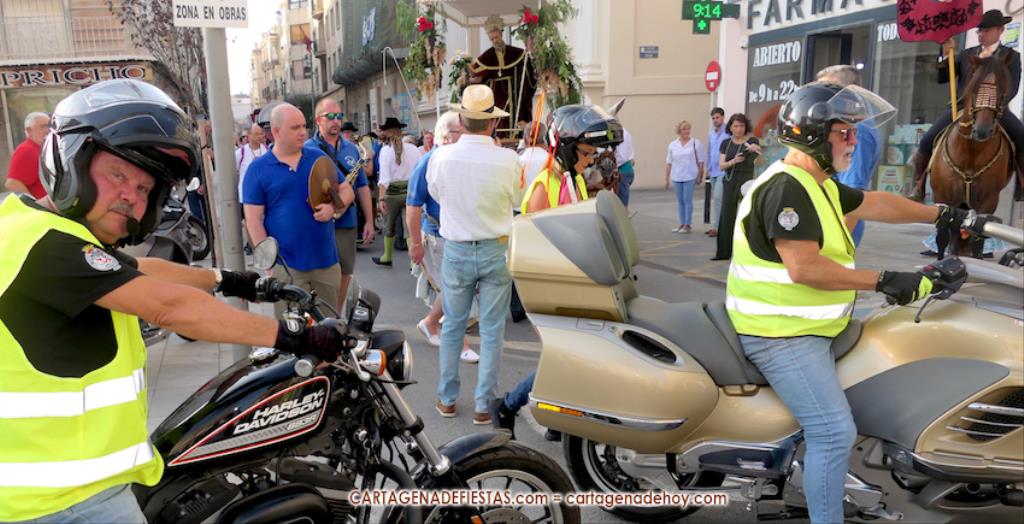 En cabeza, como escolta al patrono, los moteros del Moto Club Cartagena, por segundo año consecutivo. Es evidente que la compañía del santo cada vez tiene más alistados. La marcha ha recorrido la zona urbana de la ciudad hasta llegar a la parroquia de San Ginés, primera parada de la jornada... Seguiremos informando.
