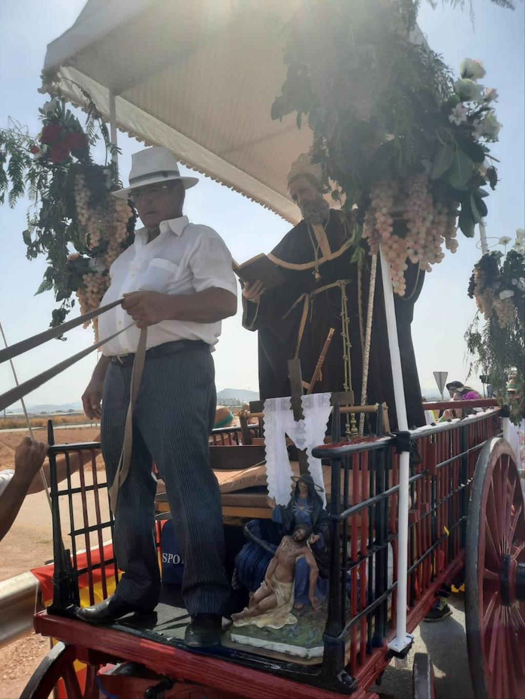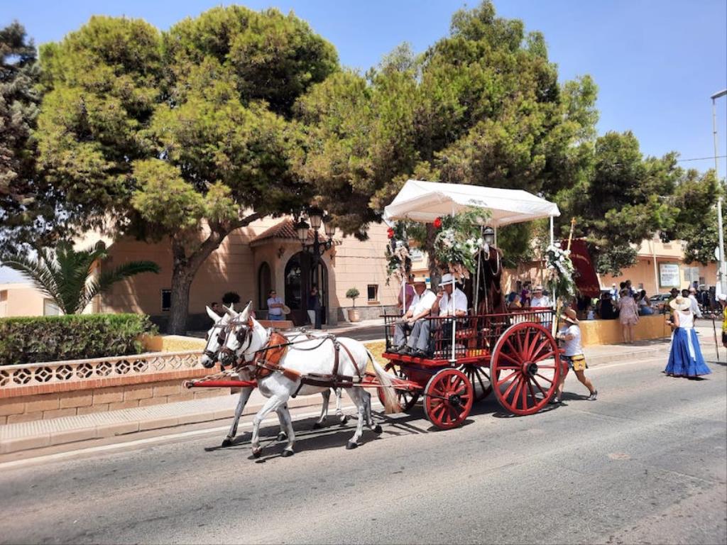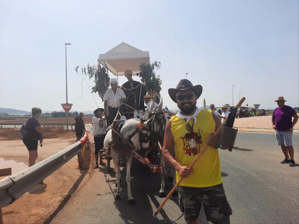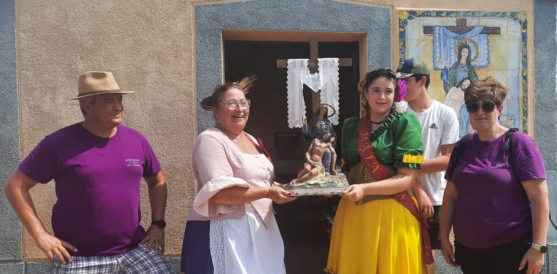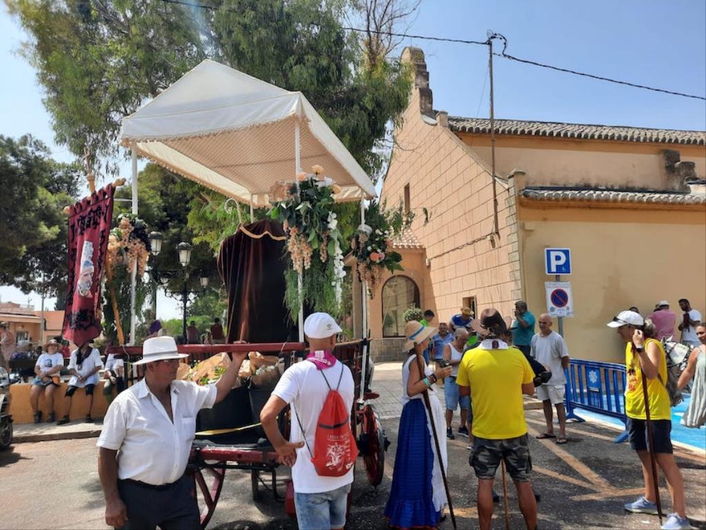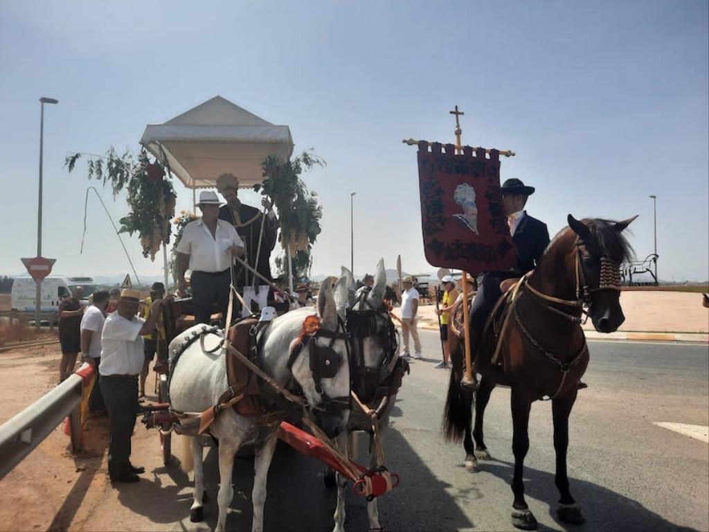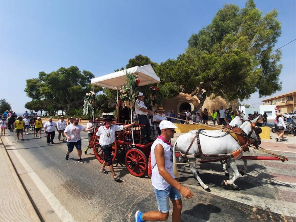 El pueblo siempre se vuelca con la llegada del patrono de Cartagena y este año no ha sido menos cuando la romería ha arribado por la romana vía Ylada, con parada en la ermita, donde la pequeña talla de Nuestra Señora de los Dolores se ha sumado al cortejo con dirección a la iglesia, donde ha tenido lugar una ofrenda floral. En la foto es sujetada la imagen por la madrina, Pilar Giménez, y por la maja, Esperanza Ayaso Sánchez.