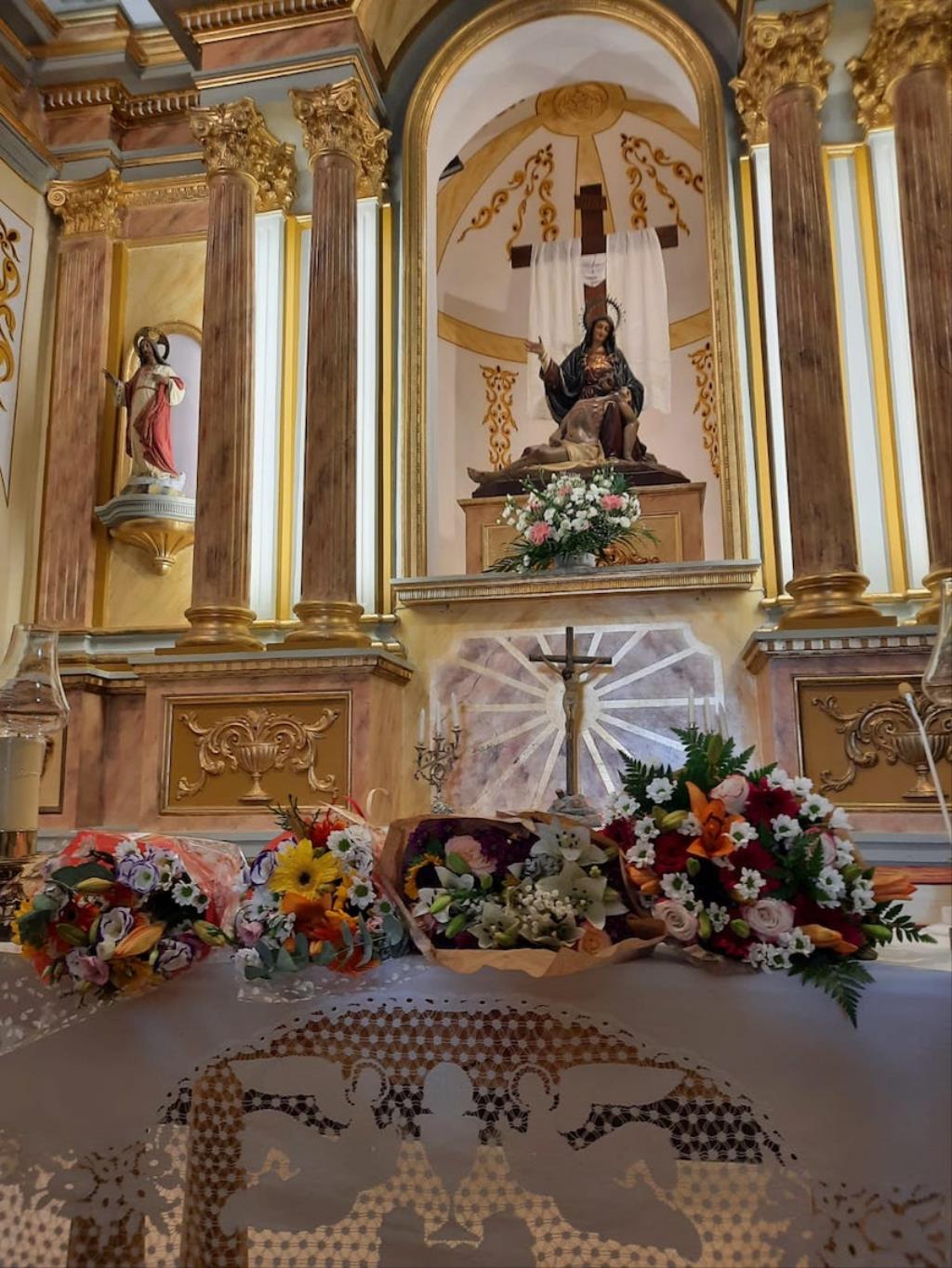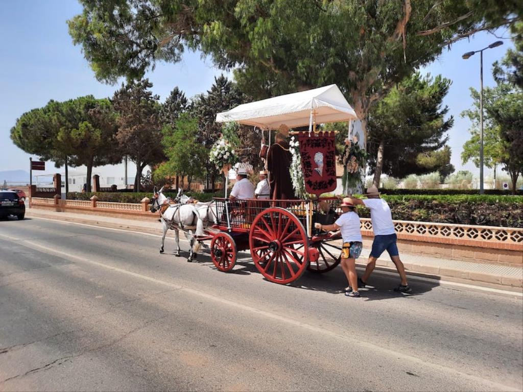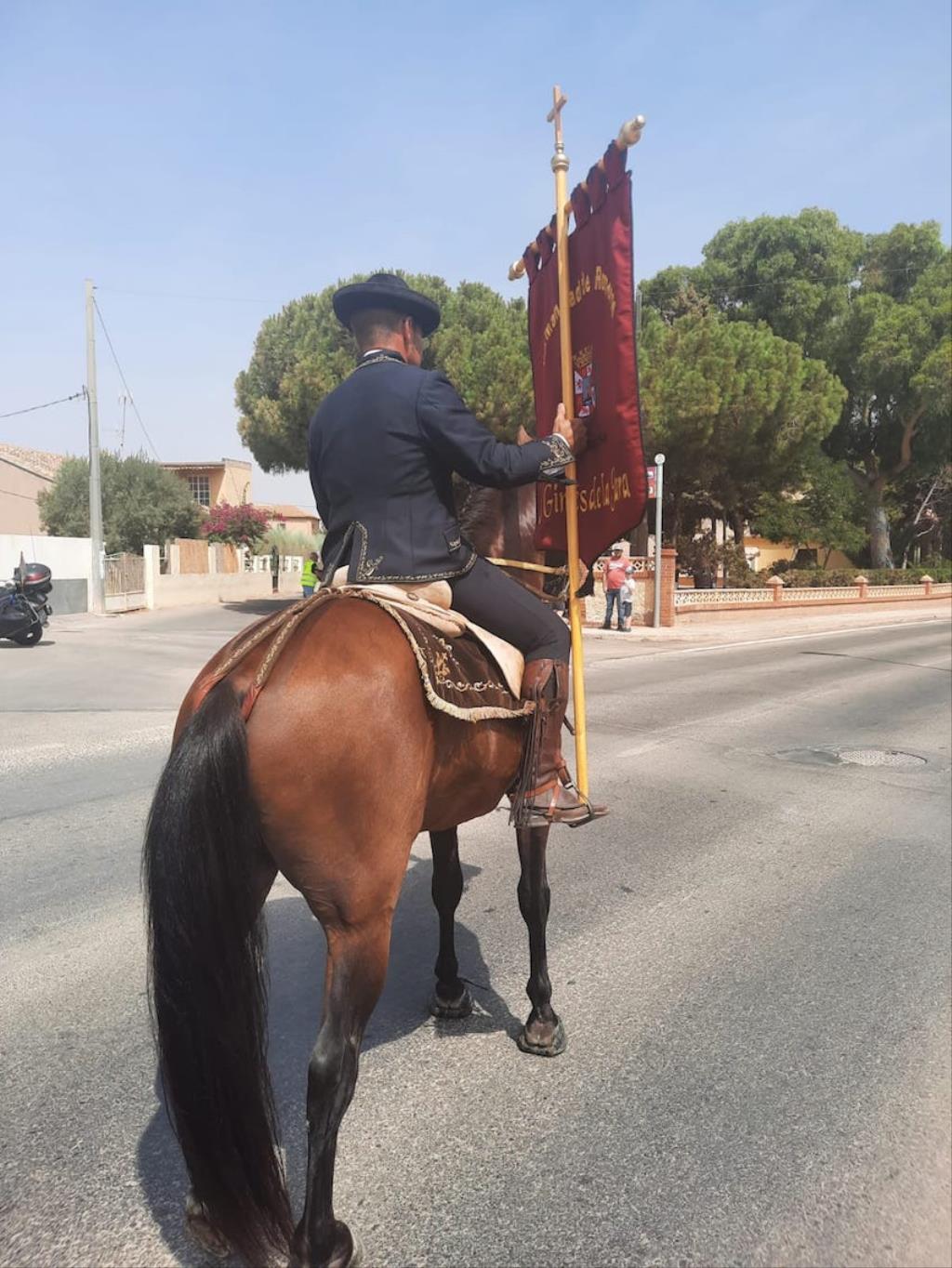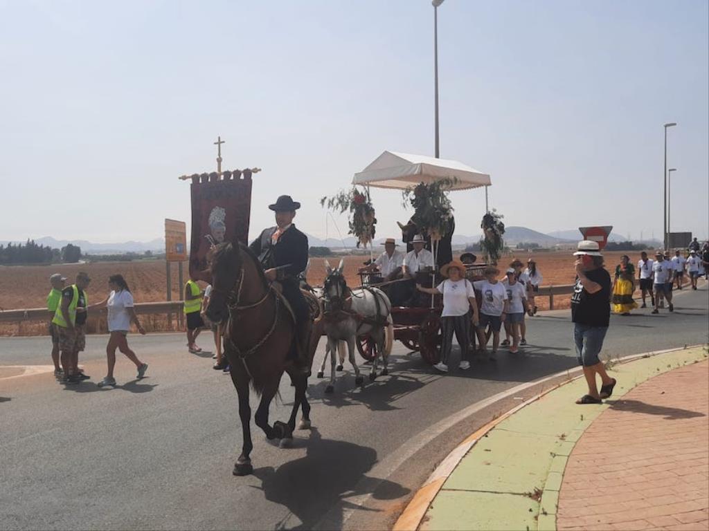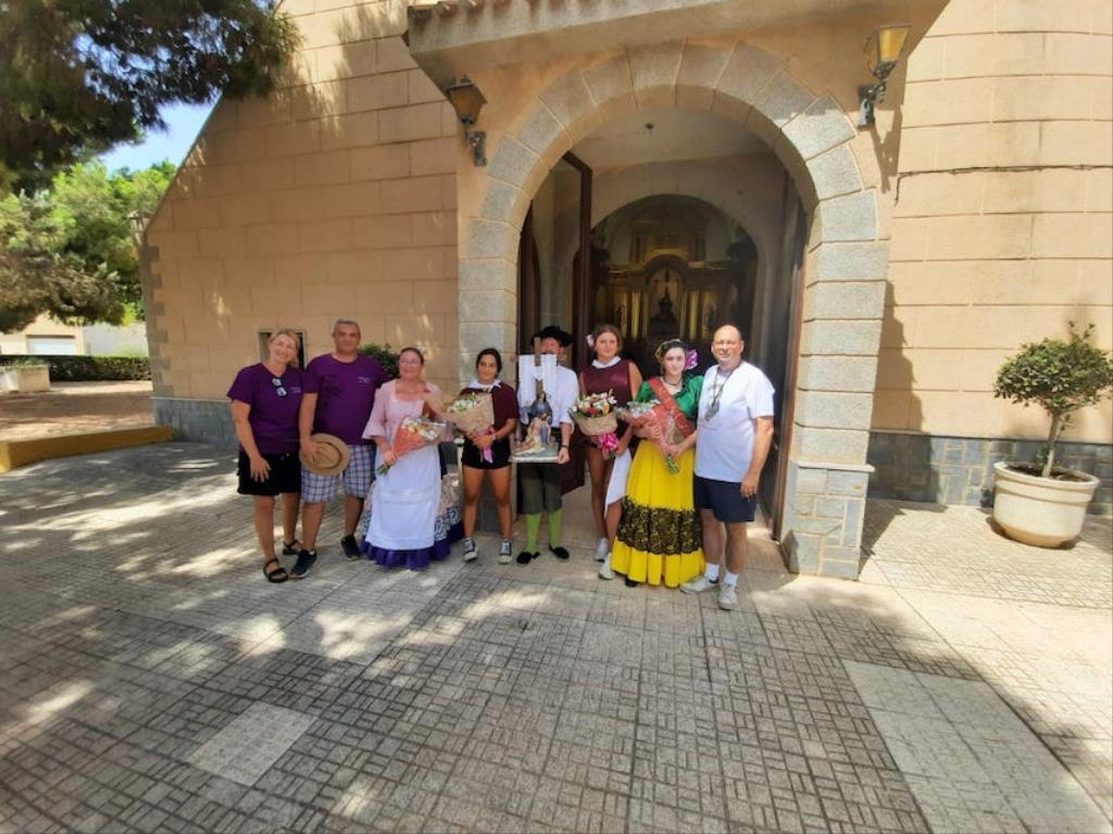 El pueblo siempre se vuelca con la llegada del patrono de Cartagena y este año no ha sido menos cuando la romería ha arribado por la romana vía Ylada, con parada en la ermita, donde la pequeña talla de Nuestra Señora de los Dolores se ha sumado al cortejo con dirección a la iglesia, donde ha tenido lugar una ofrenda floral. En la foto es sujetada la imagen por la madrina, Pilar Giménez, y por la maja, Esperanza Ayaso Sánchez.